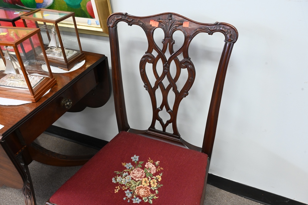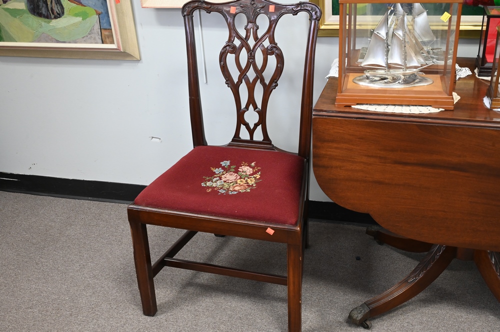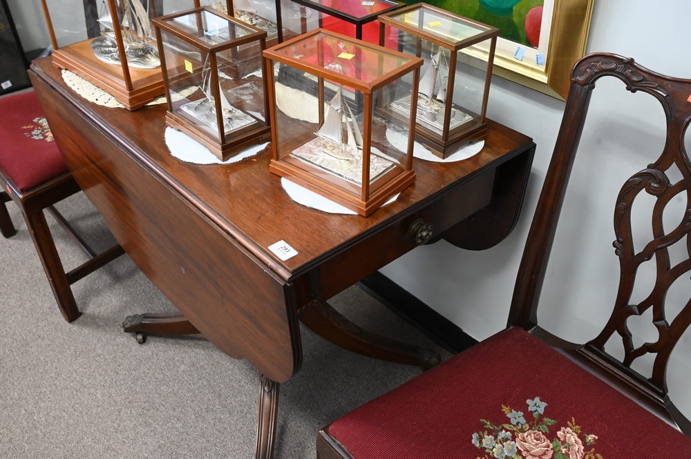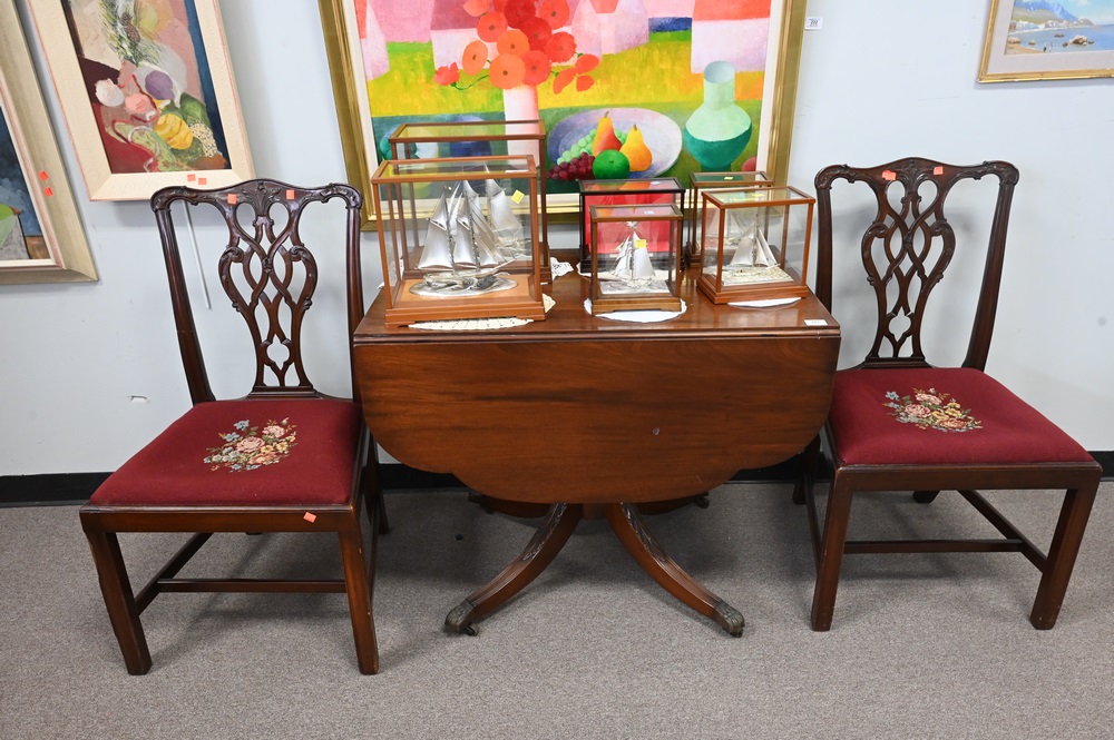 Lot 293: Three Piece Lot, to include a mahogany Duncan Phyfe style drop leaf table, along with a pair of mahogany Chippendale style side chai…