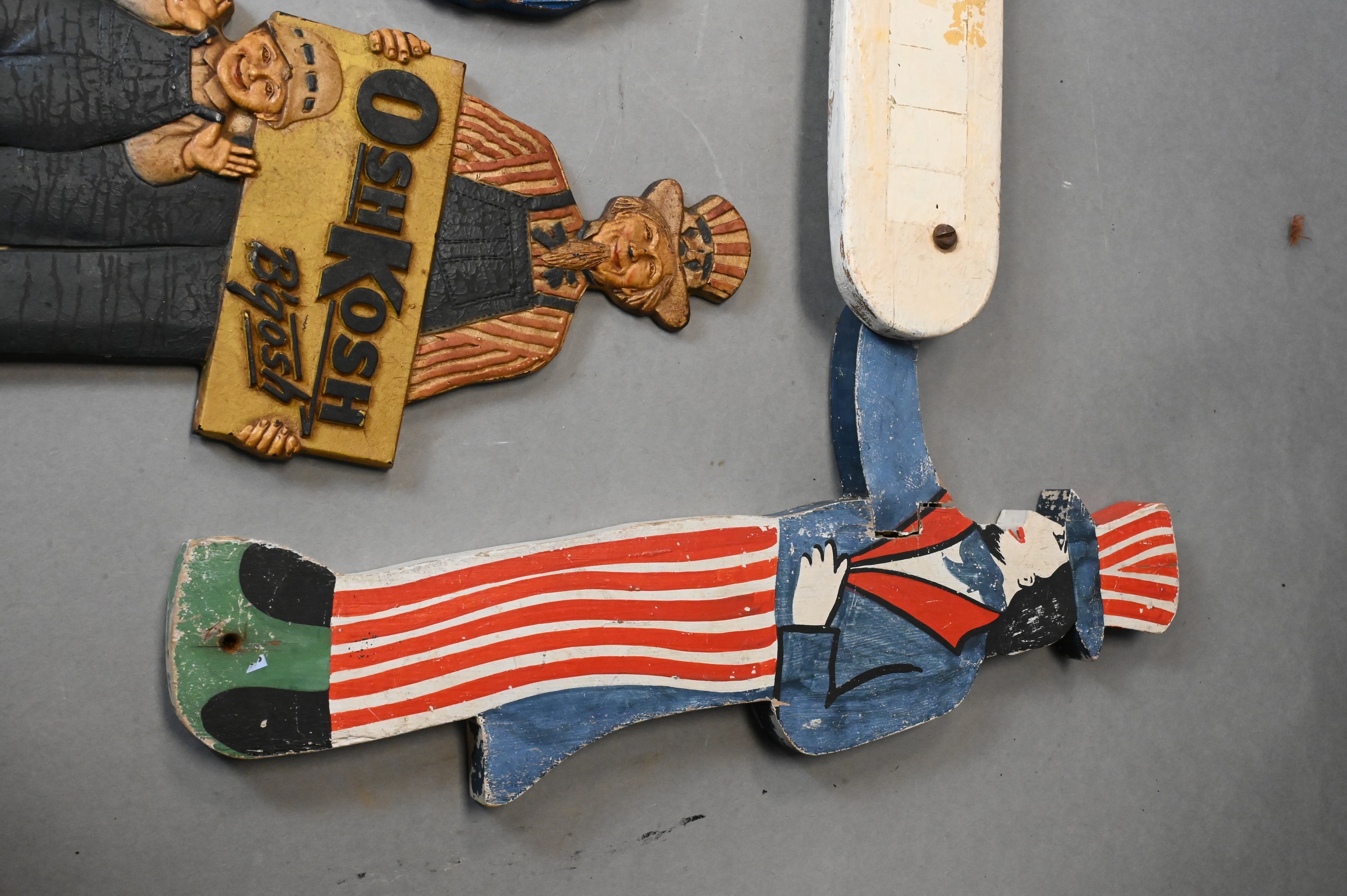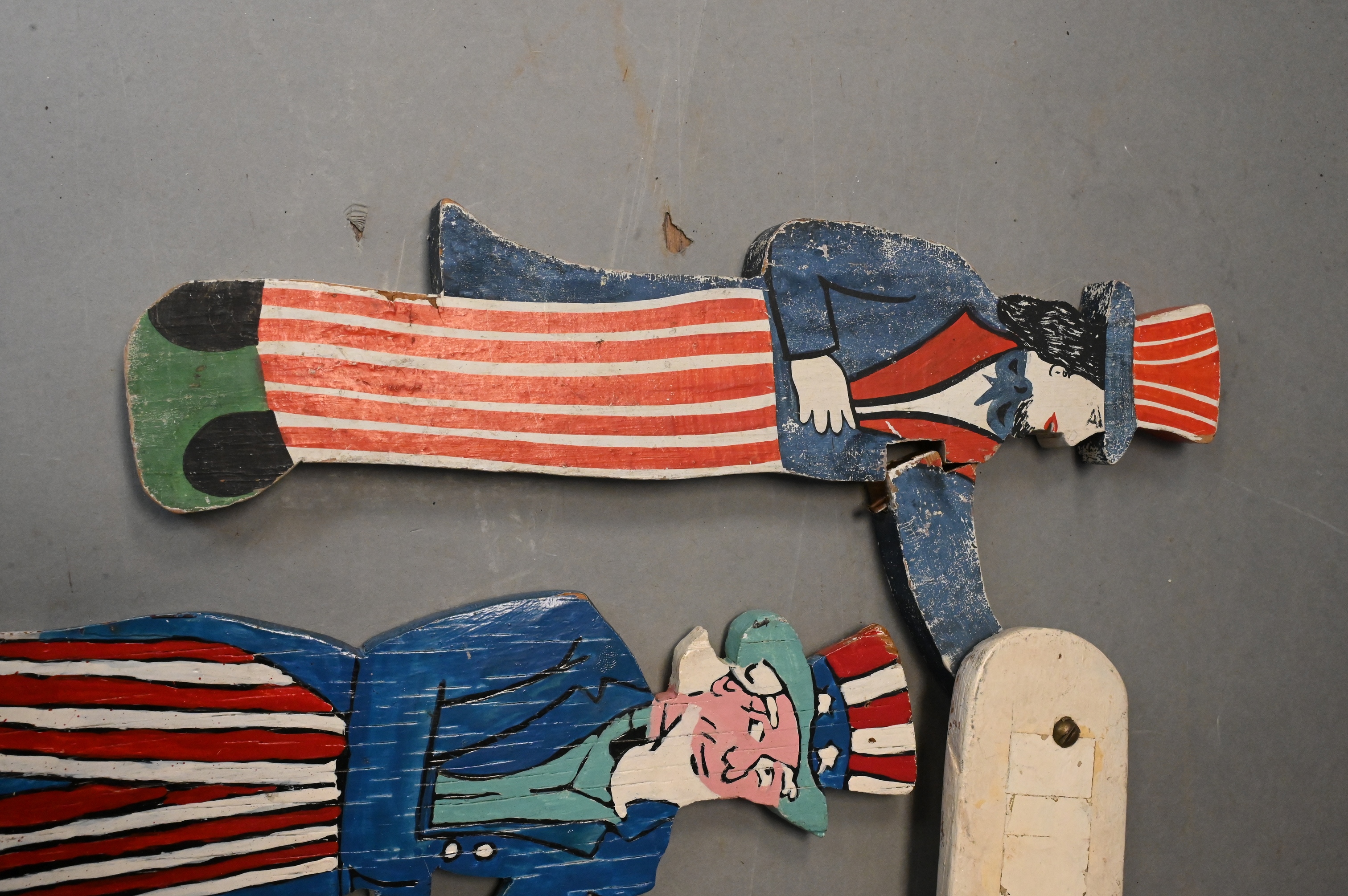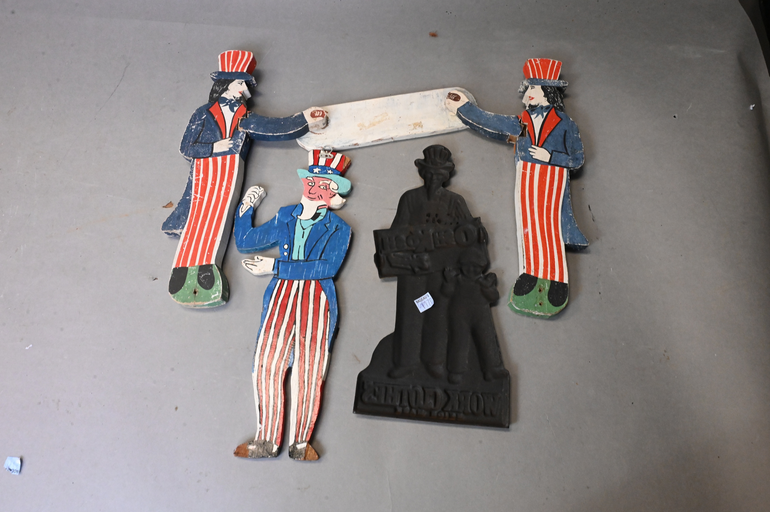 depicting Uncle Sam in patriotic attire, rendered in painted composition material, height 13 1/2 inches, a carved and painted double sided Uncle Sam along with articulating double Uncle Sam sign