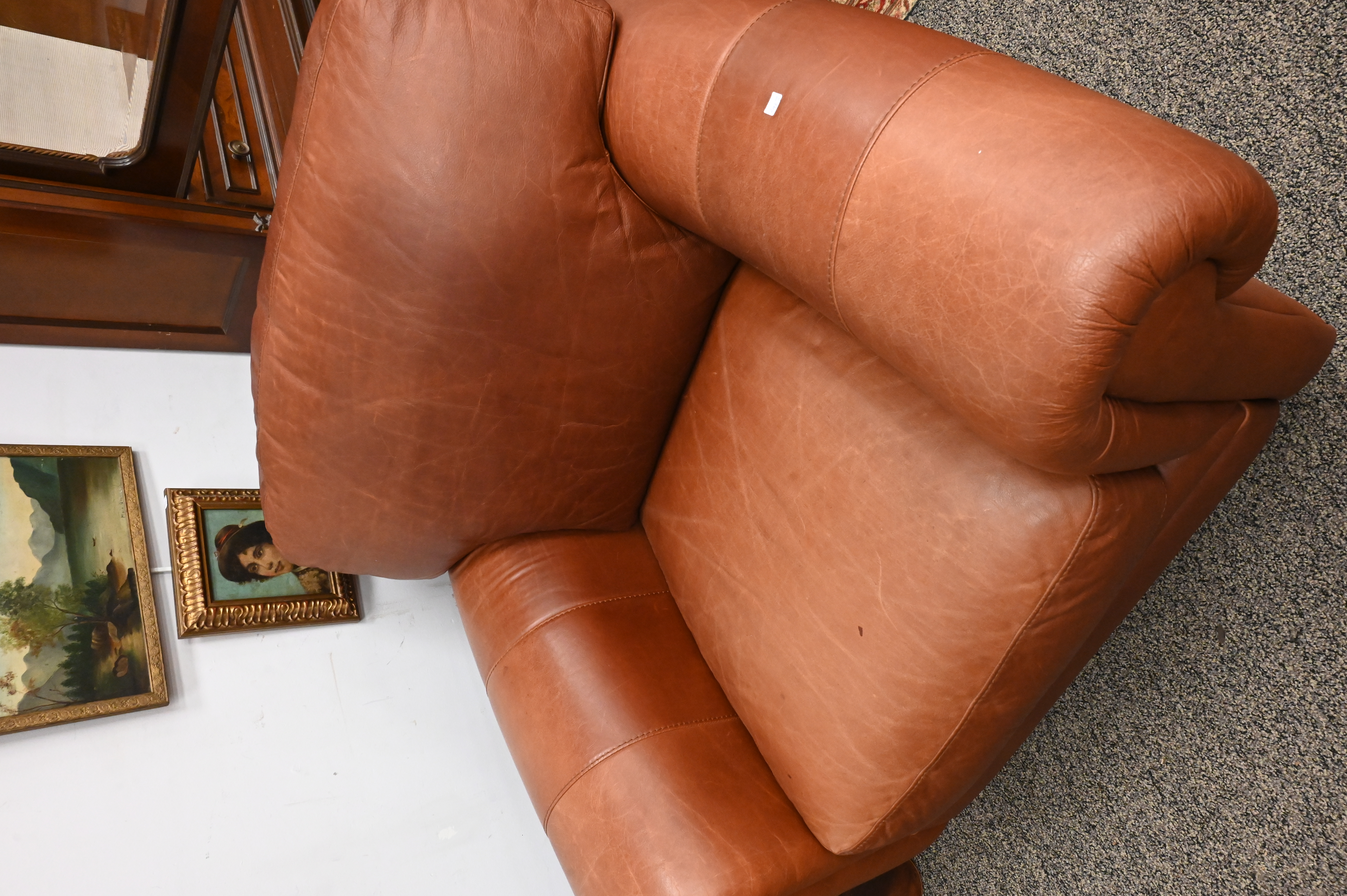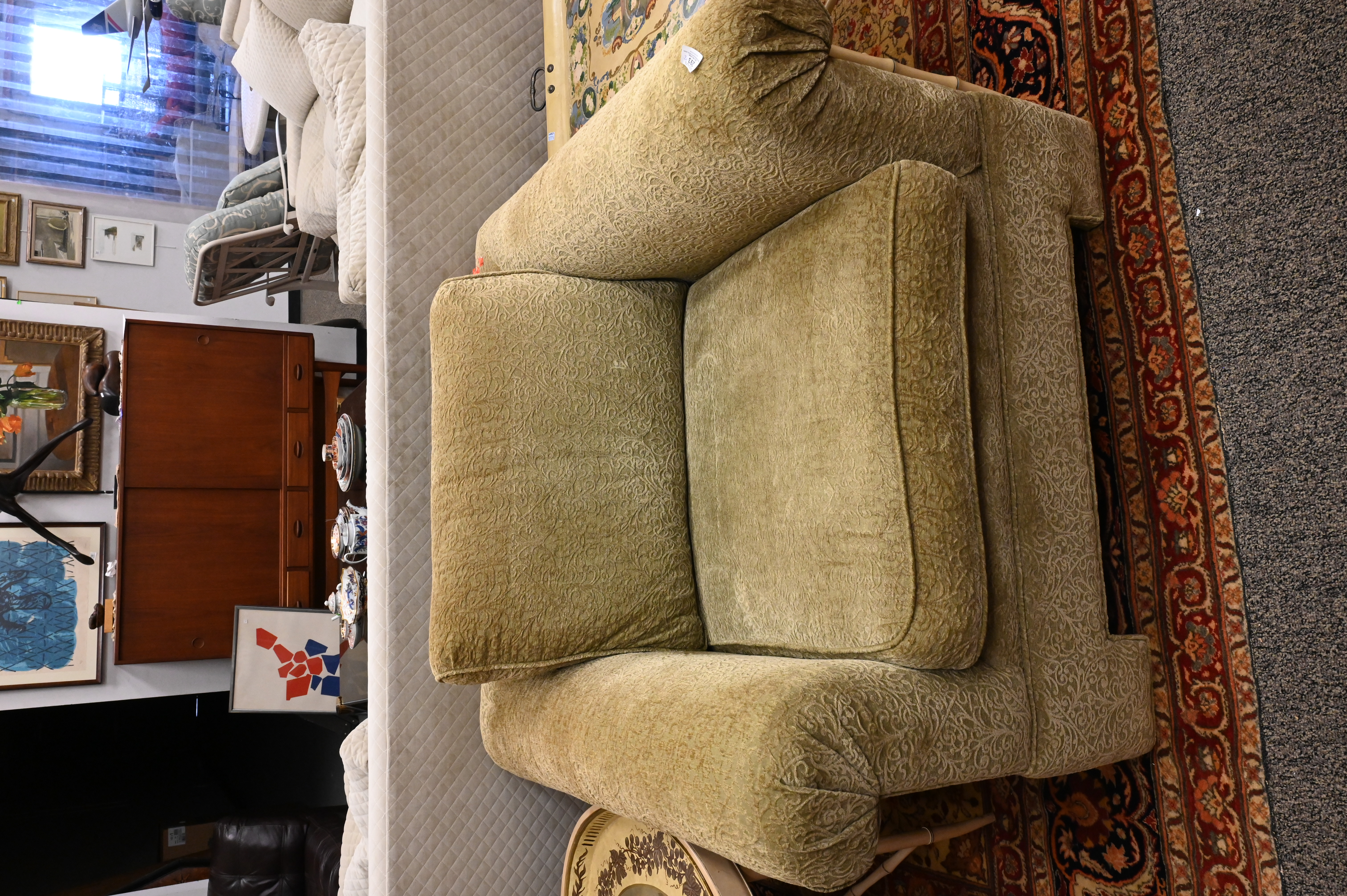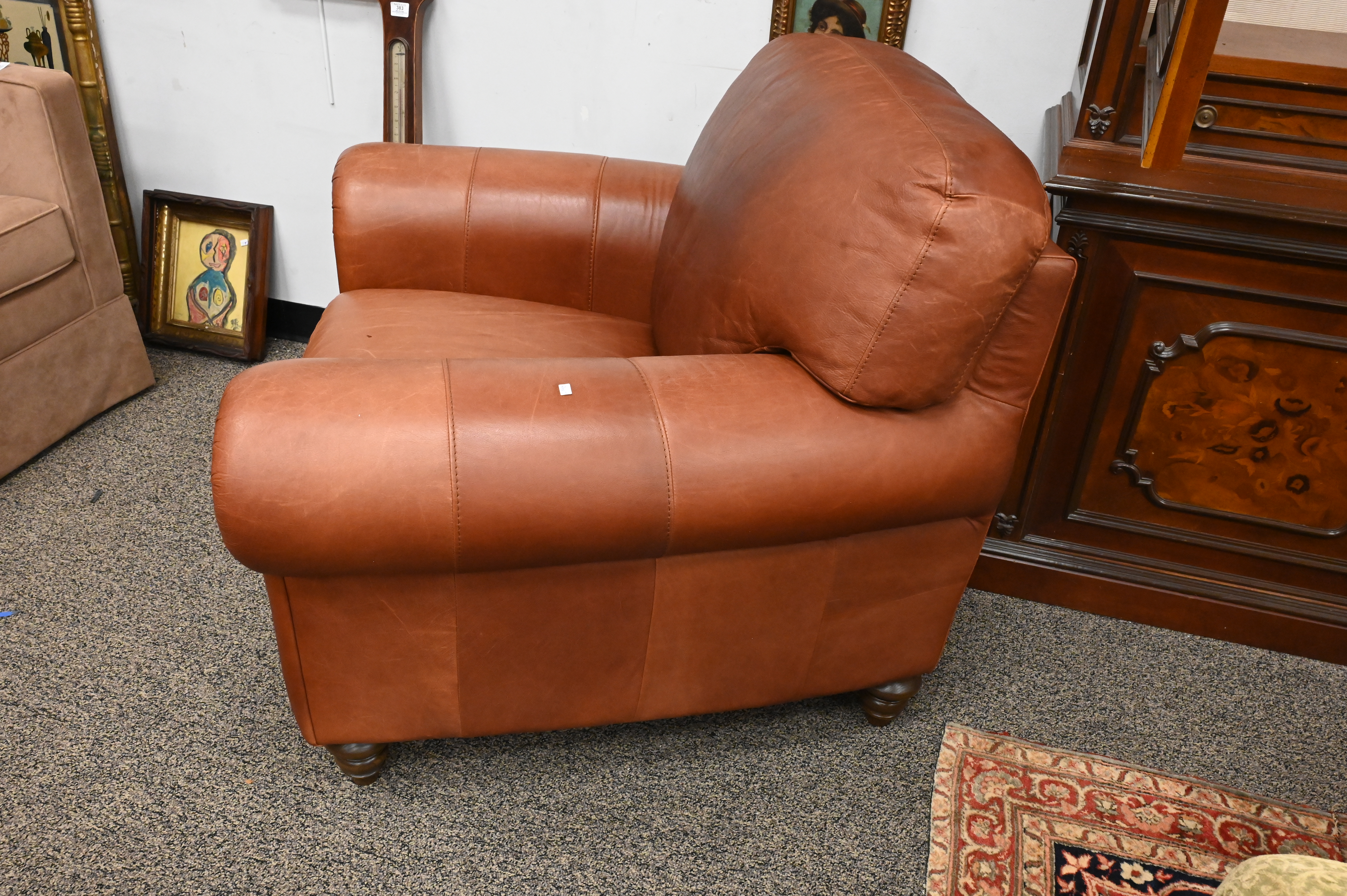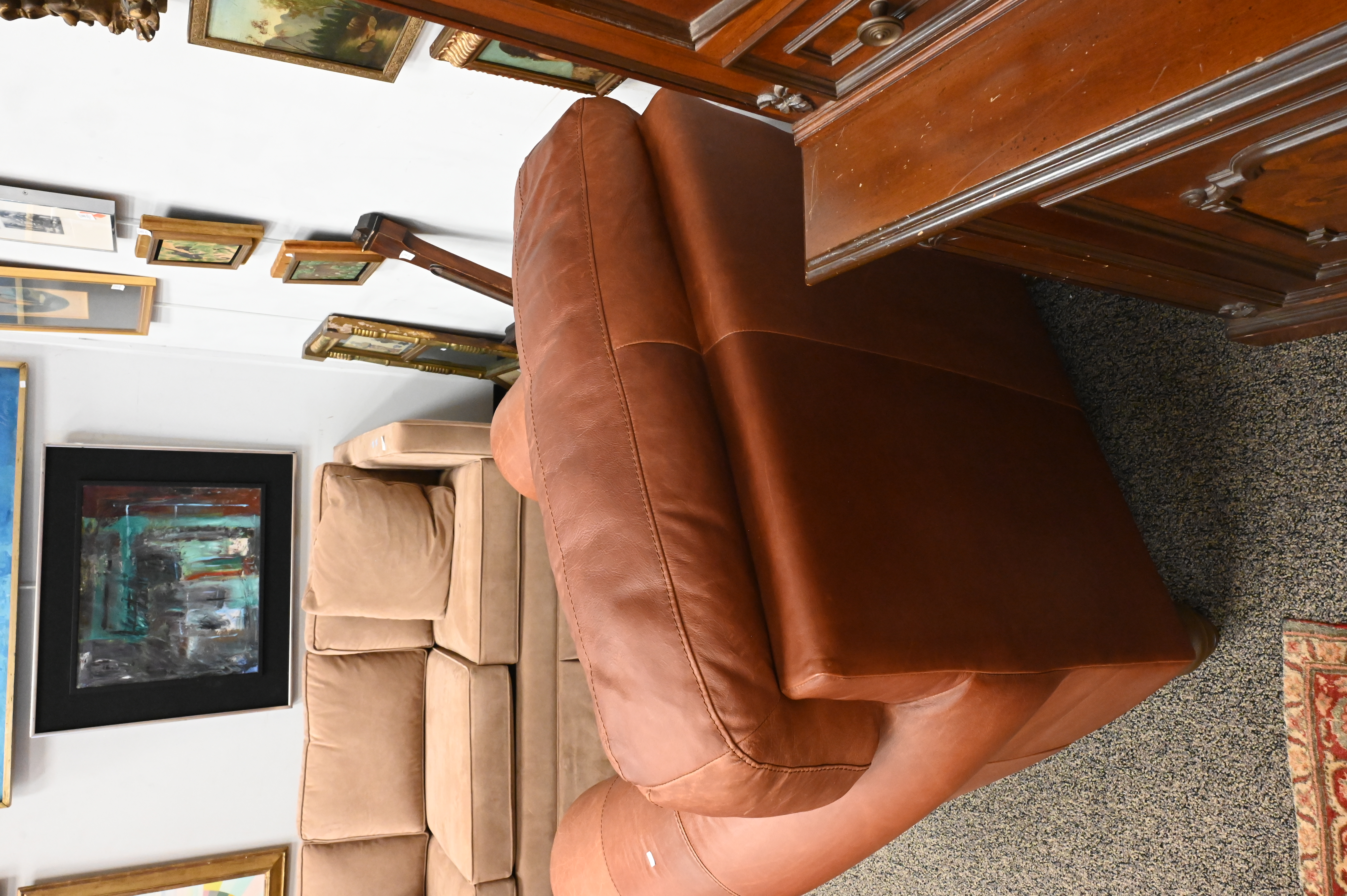 to include tan Italian leather armchair, and green upholstered armchair