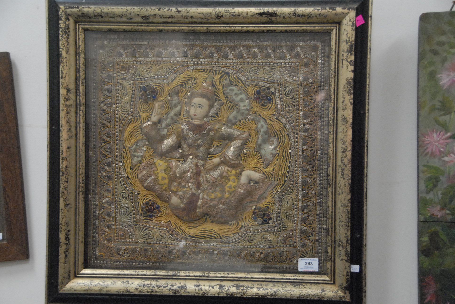 Lot 293: Two framed embroidered pieces to include Tibetan figure 19 x 19 and a silk bust of a woman in night sky 30 x 18 1/2.