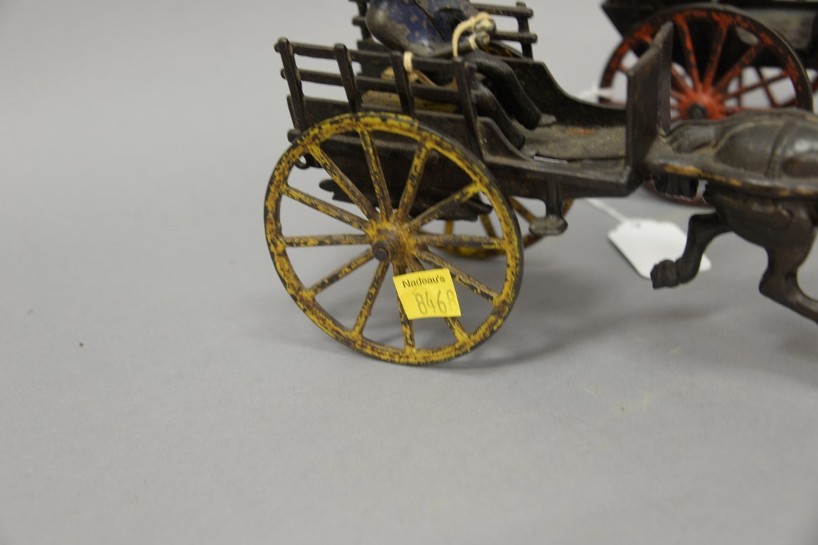 Lot 293: Two iron horse drawn wagons. lg. 10 1/2in. to 12 1/2in. Provenance: Estate of Arthur C. Pinto, MD