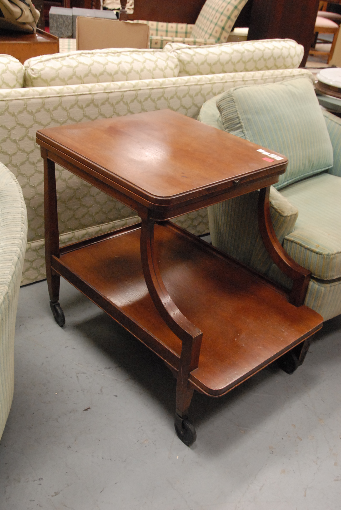 Lot 293: Unusual Mid-Century wooden teacart with hinged top, which slides and folds open to expand its surface area, ht. 27in.