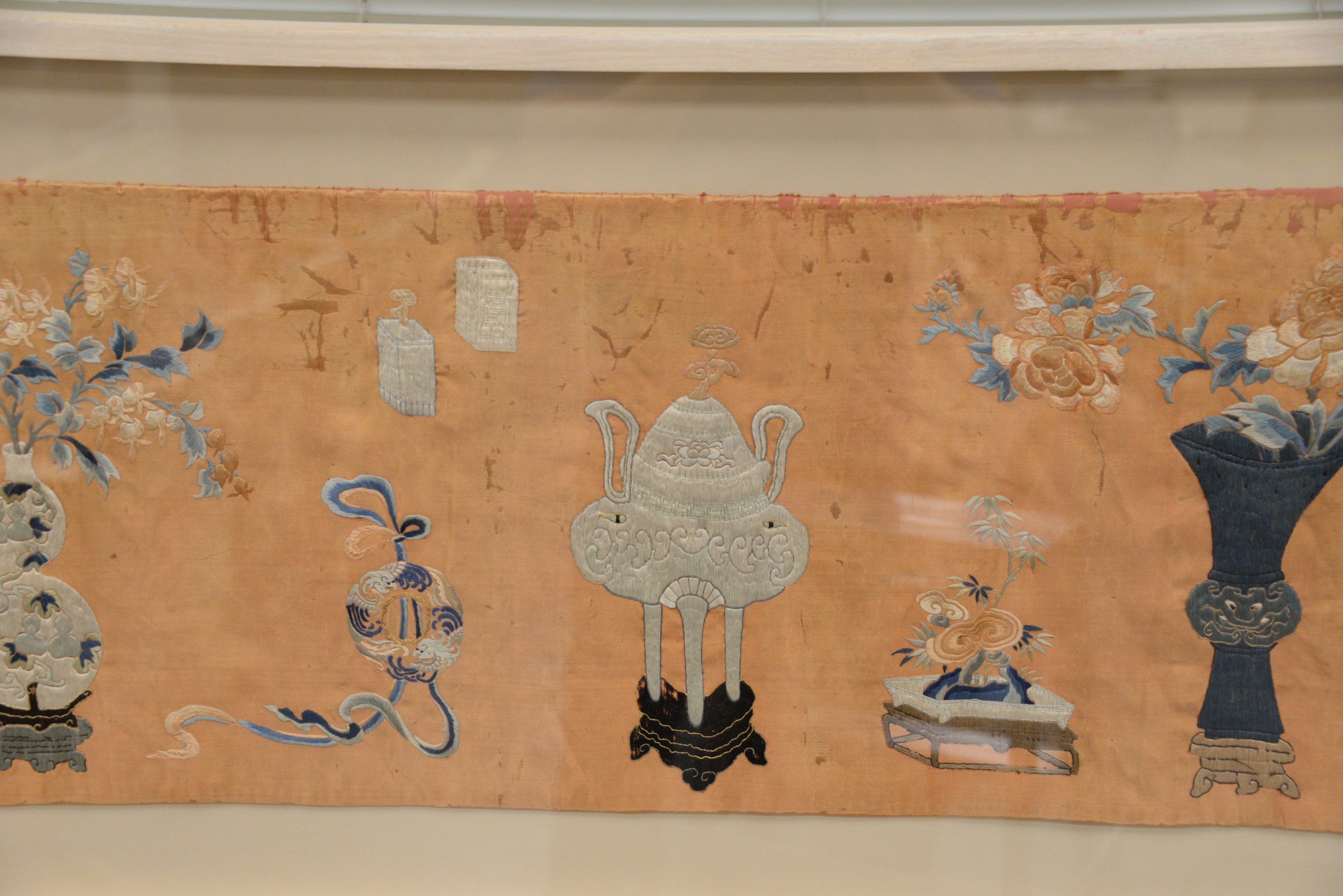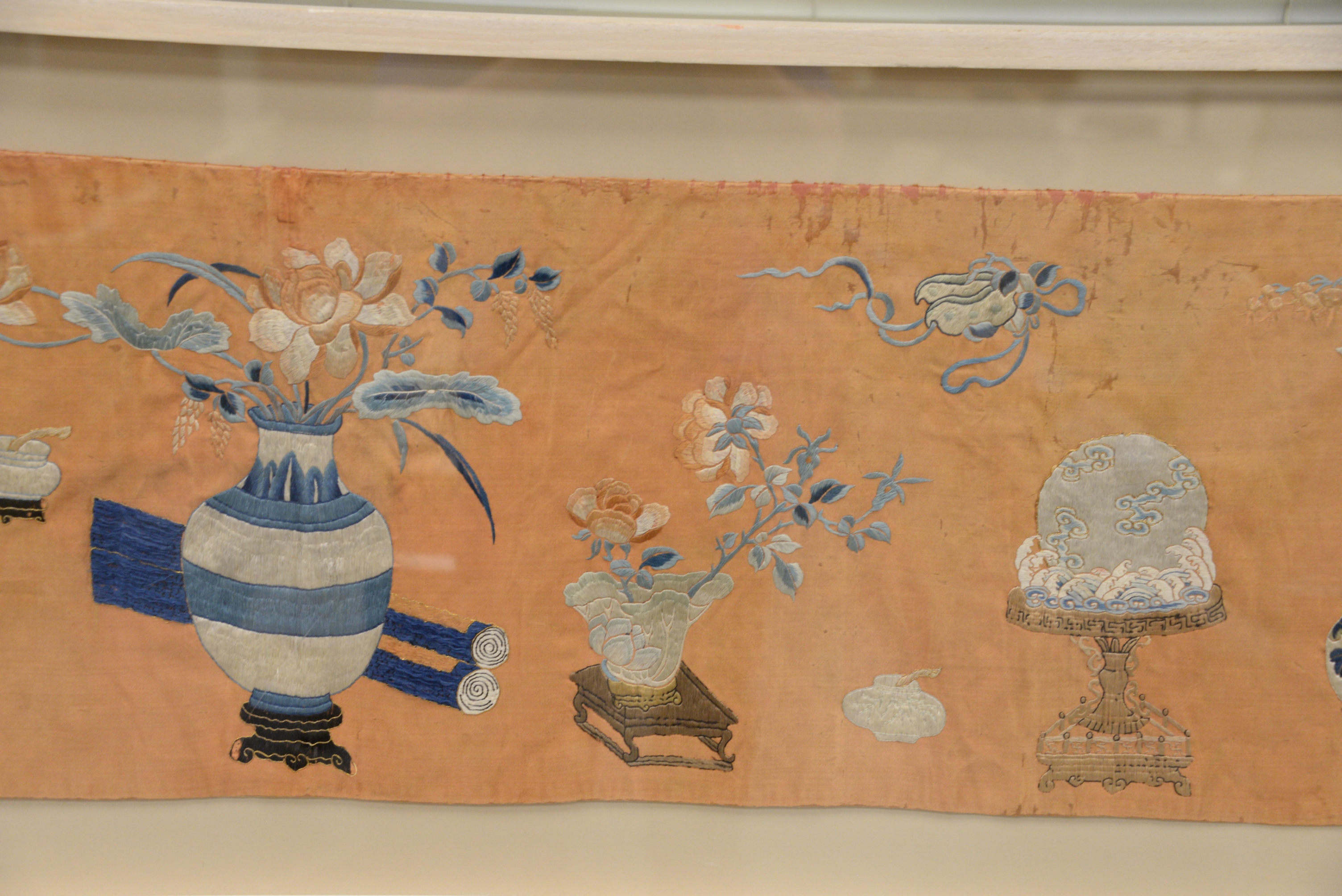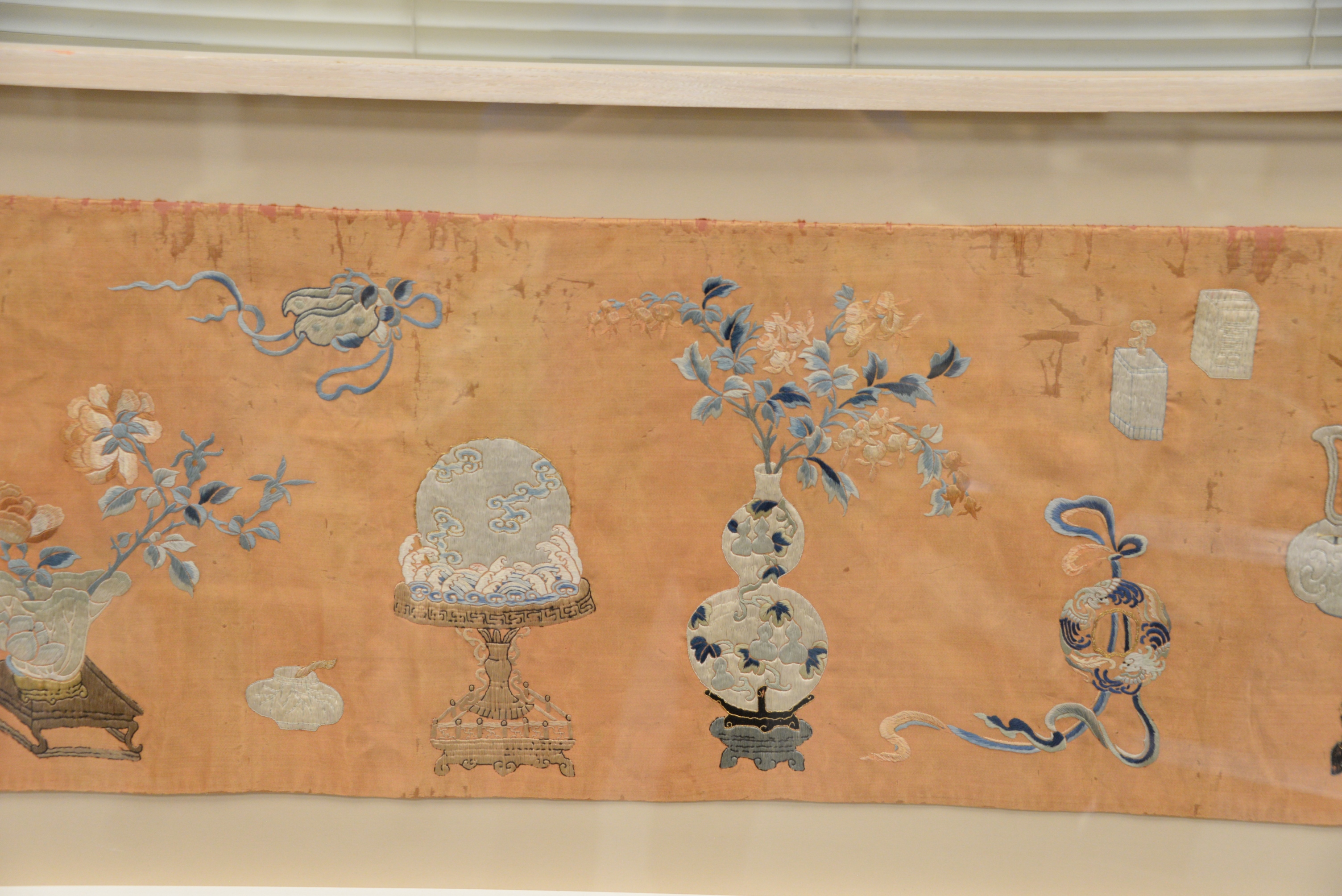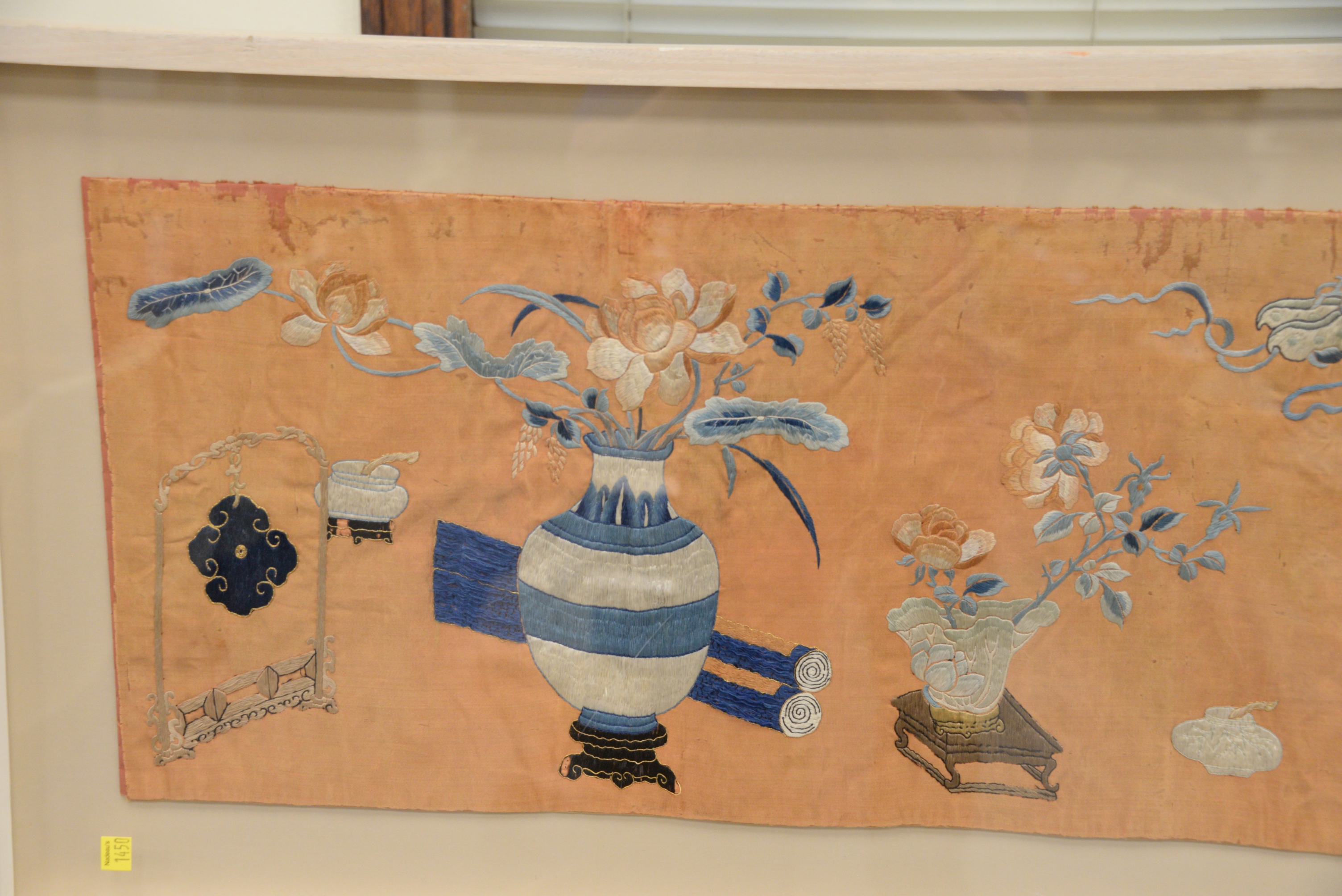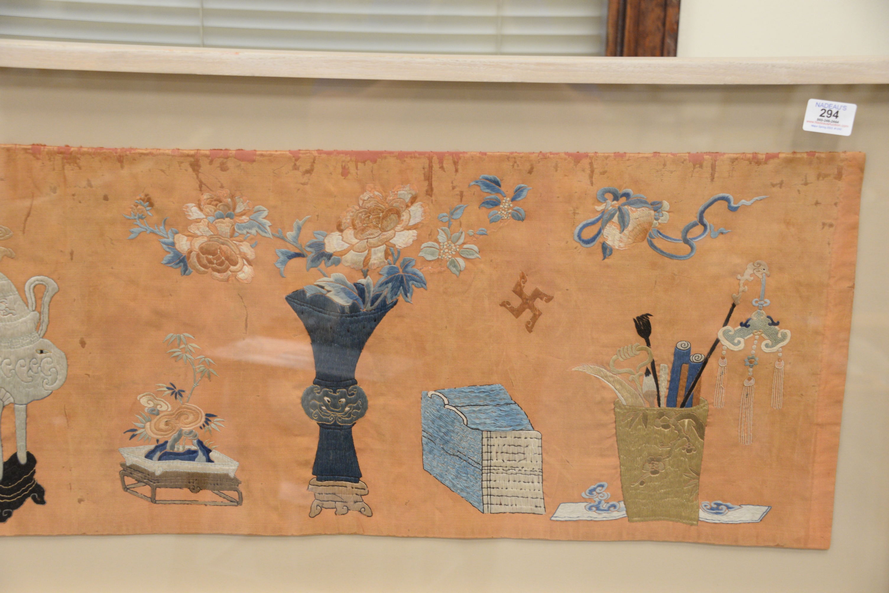 Chinese Ceremonial Hall Banner silk having embroidered figures and flowers paper size 15″ x 78″ frame size 20″ x 85″.