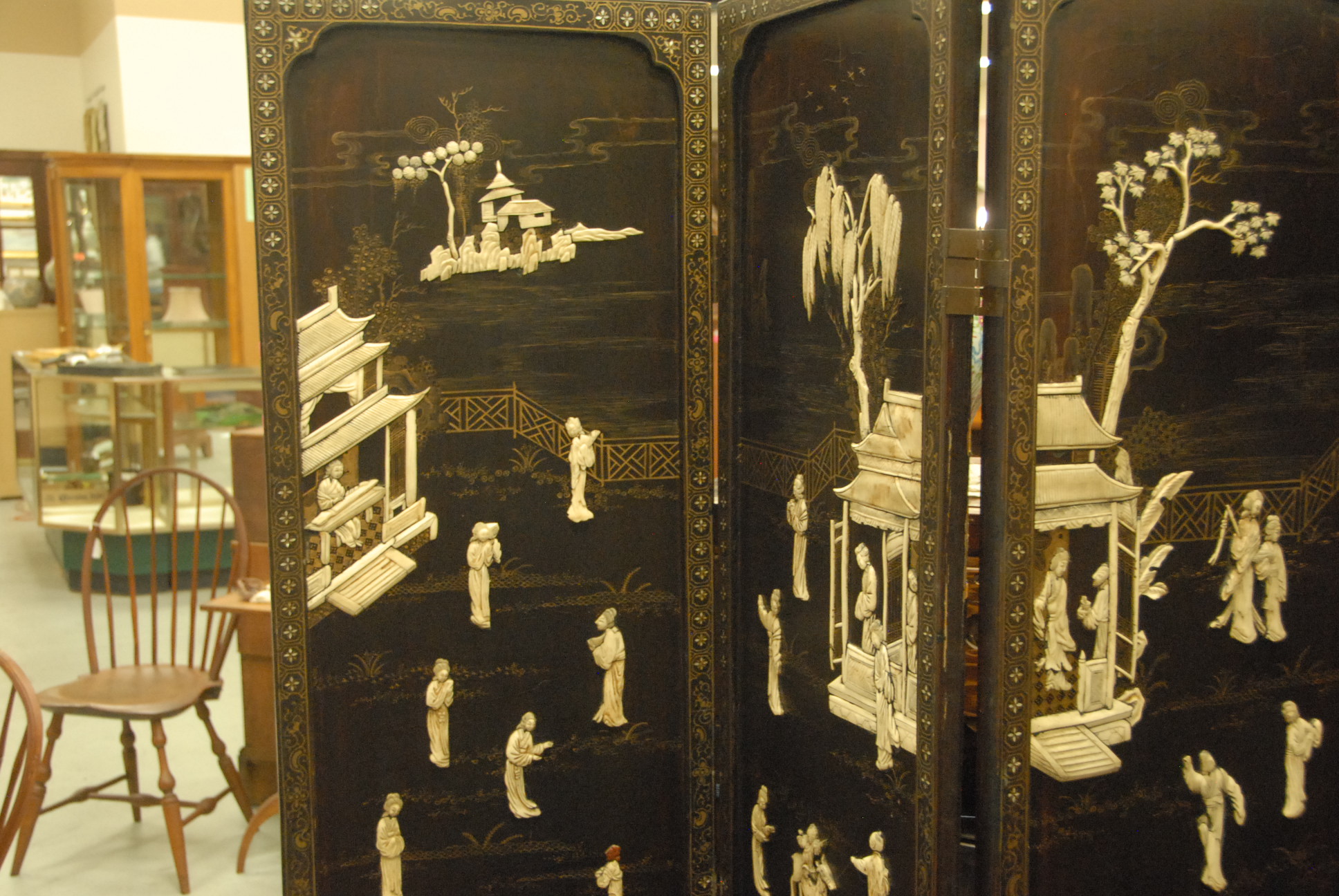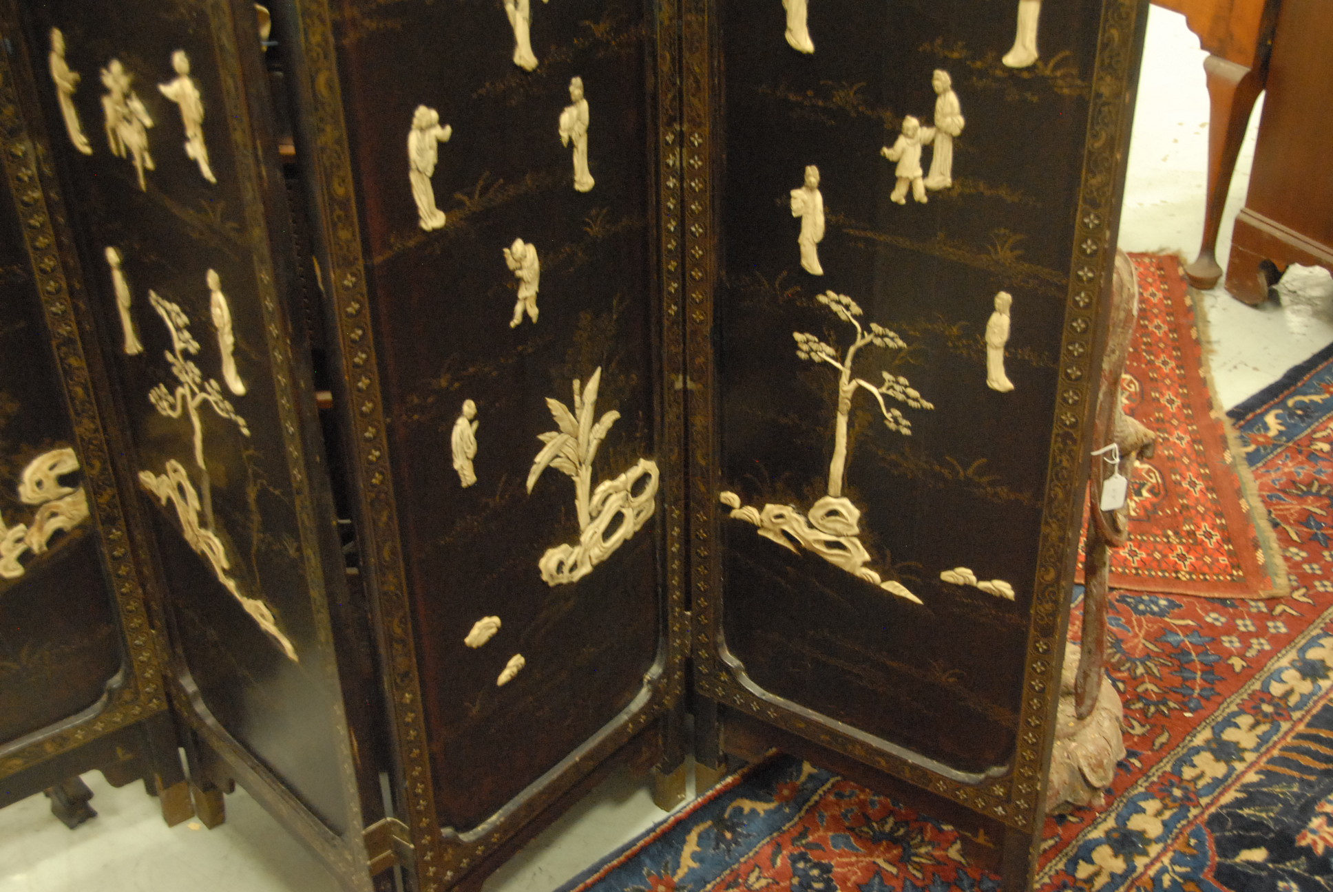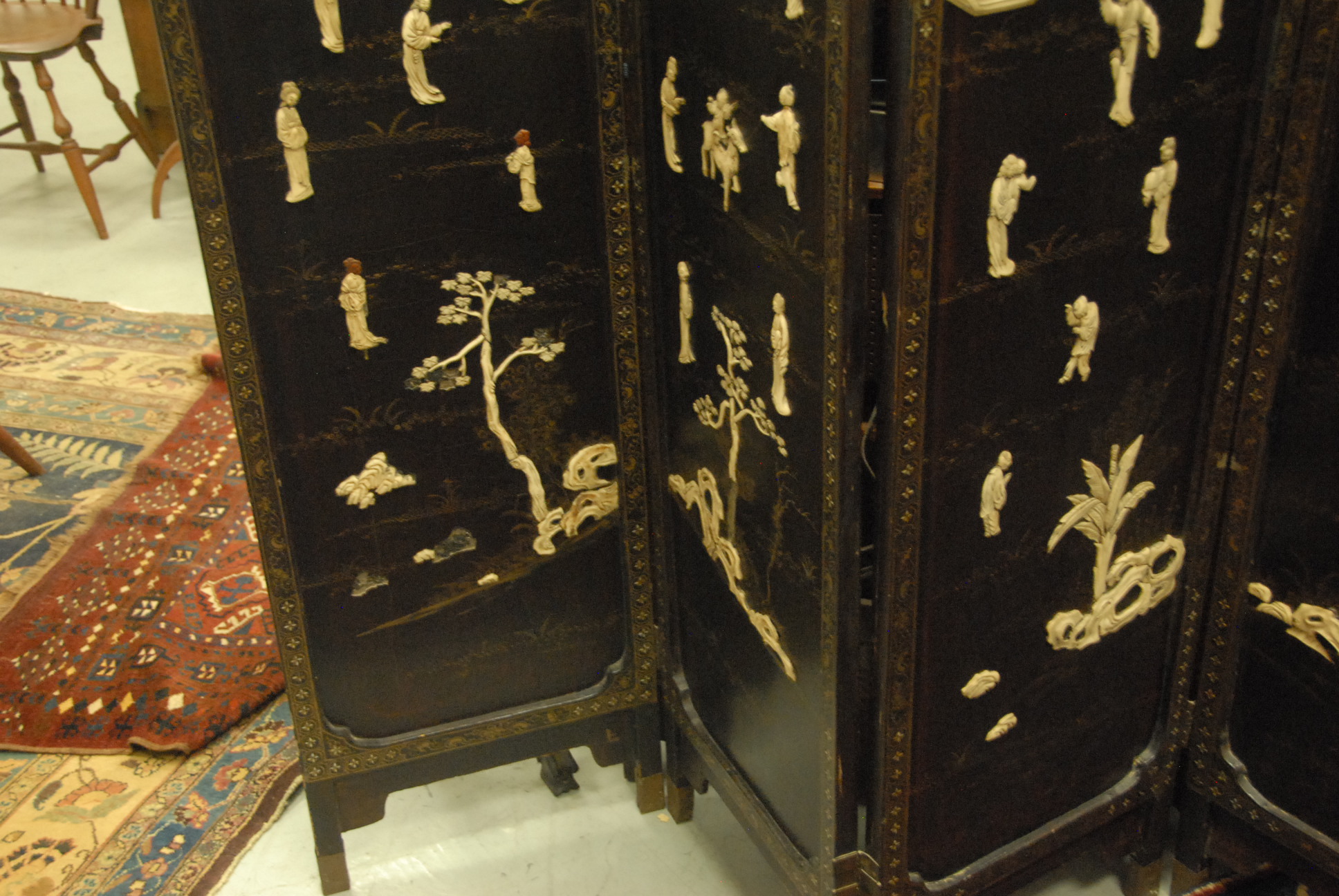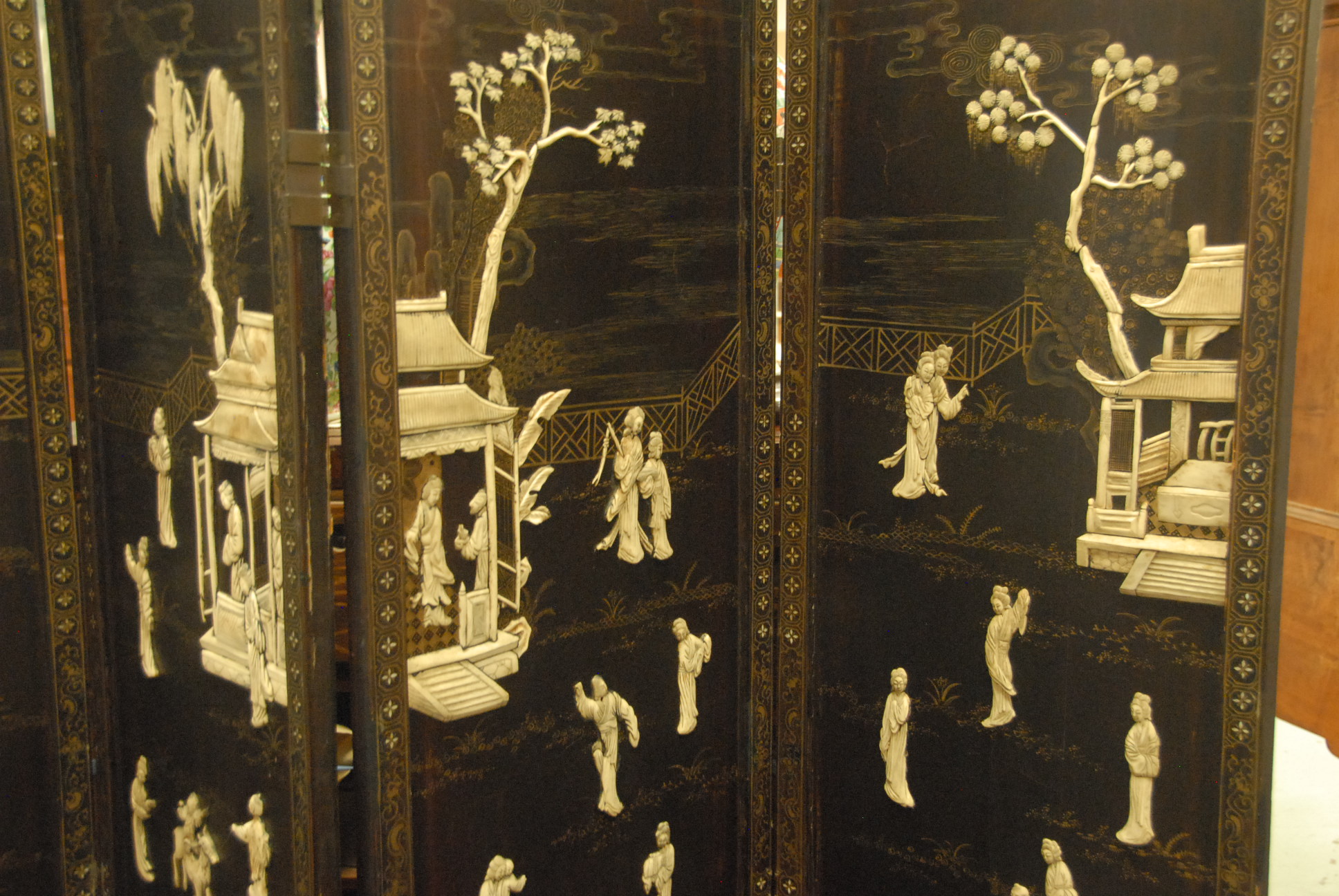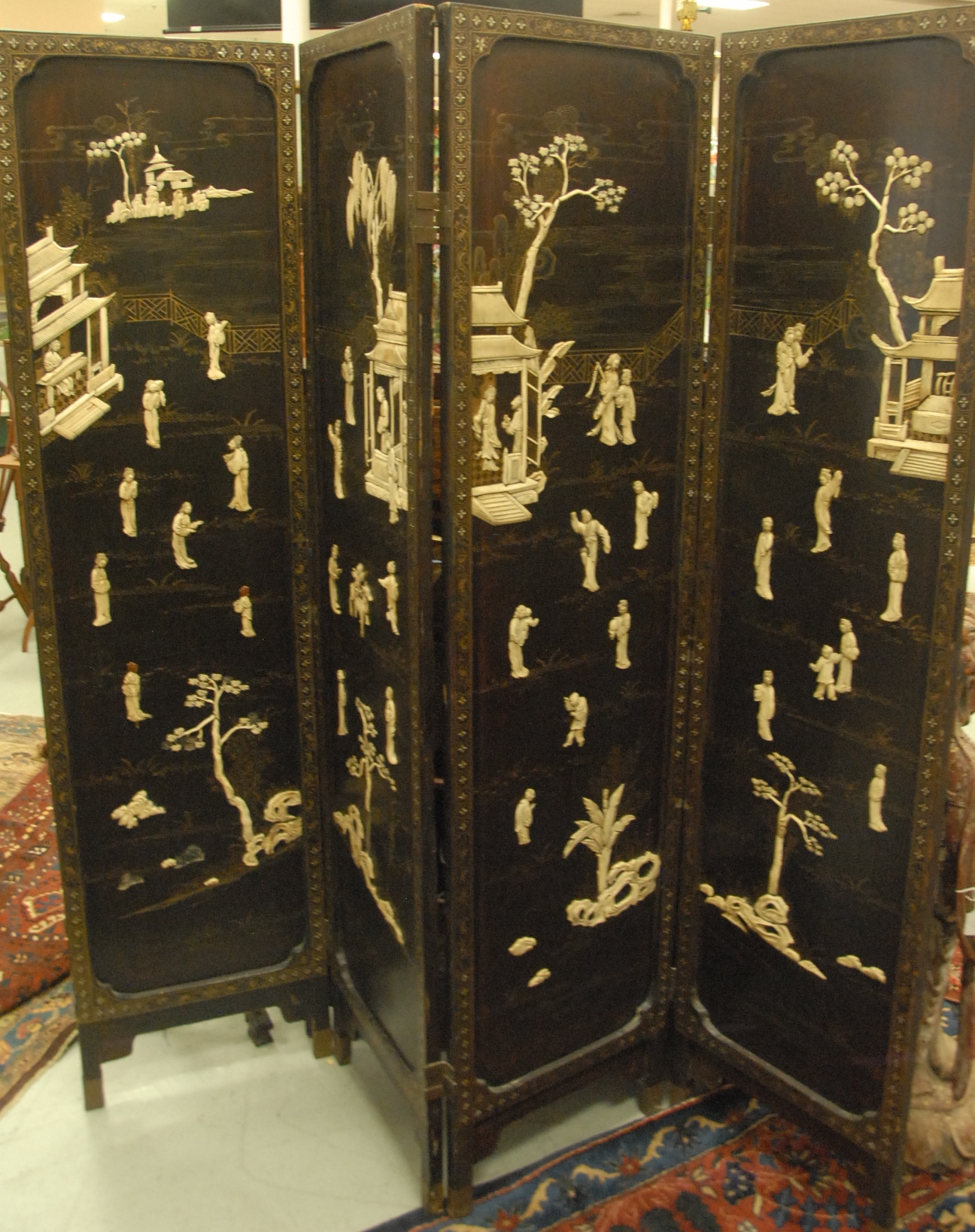 Lot 294: Chinese four fold dressing screen mounted with bone figures, buildings, and trees. ht. 71 in.