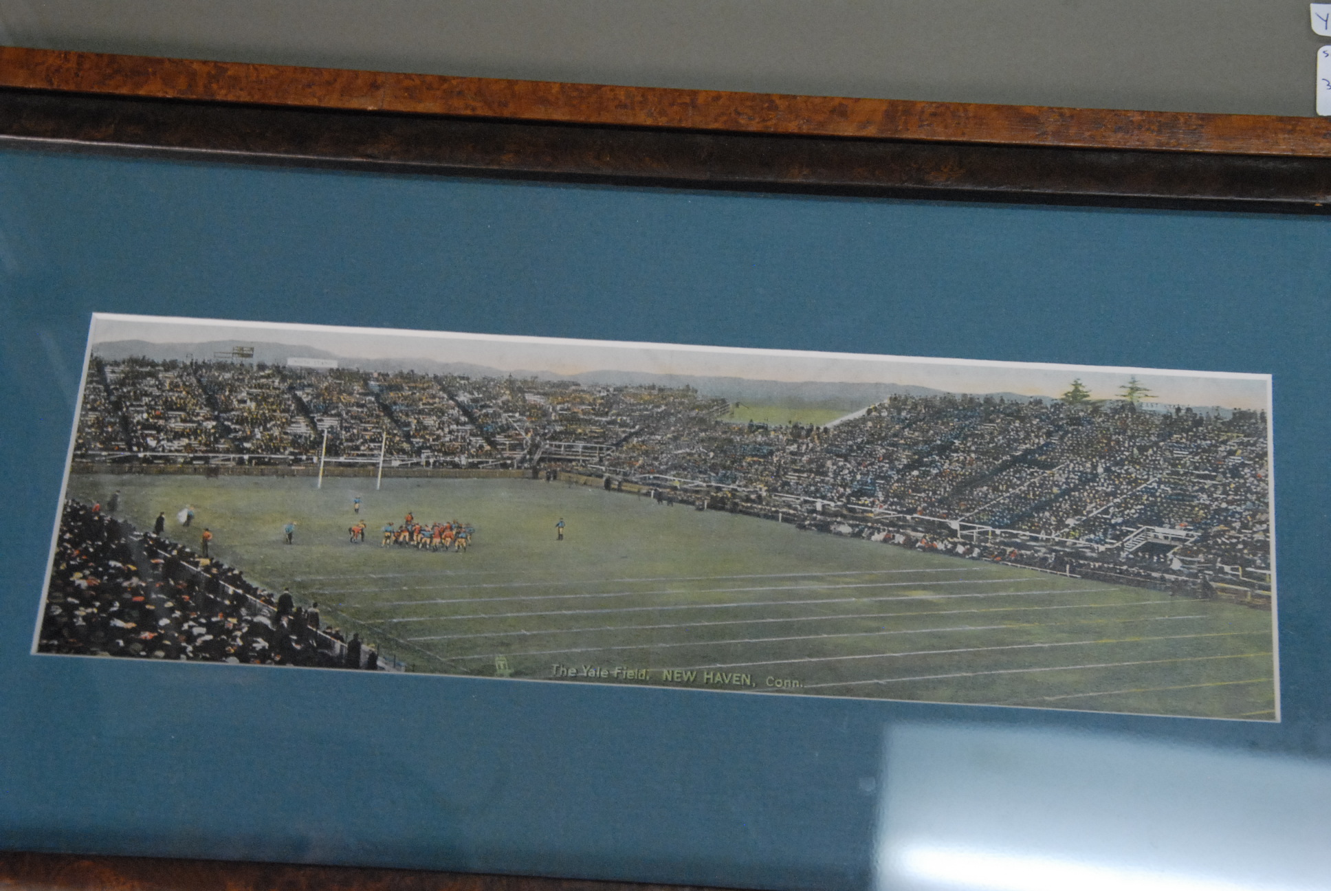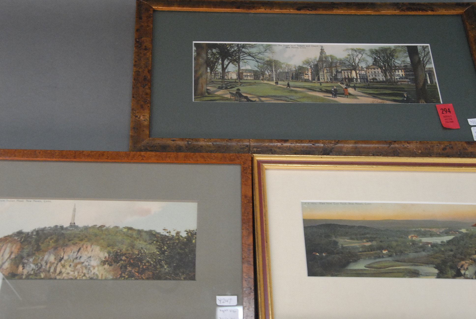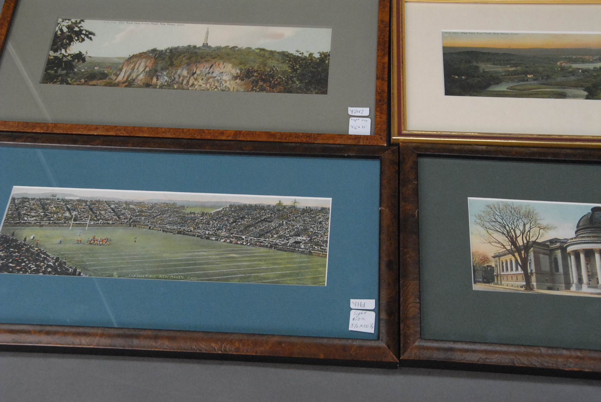 Lot 294: Five piece framed lot Yale pin backs, New Haven post card, Woolsey Hall postcard, and two East Rock post cards, 3 1/2 x 9 to 3 1/…
