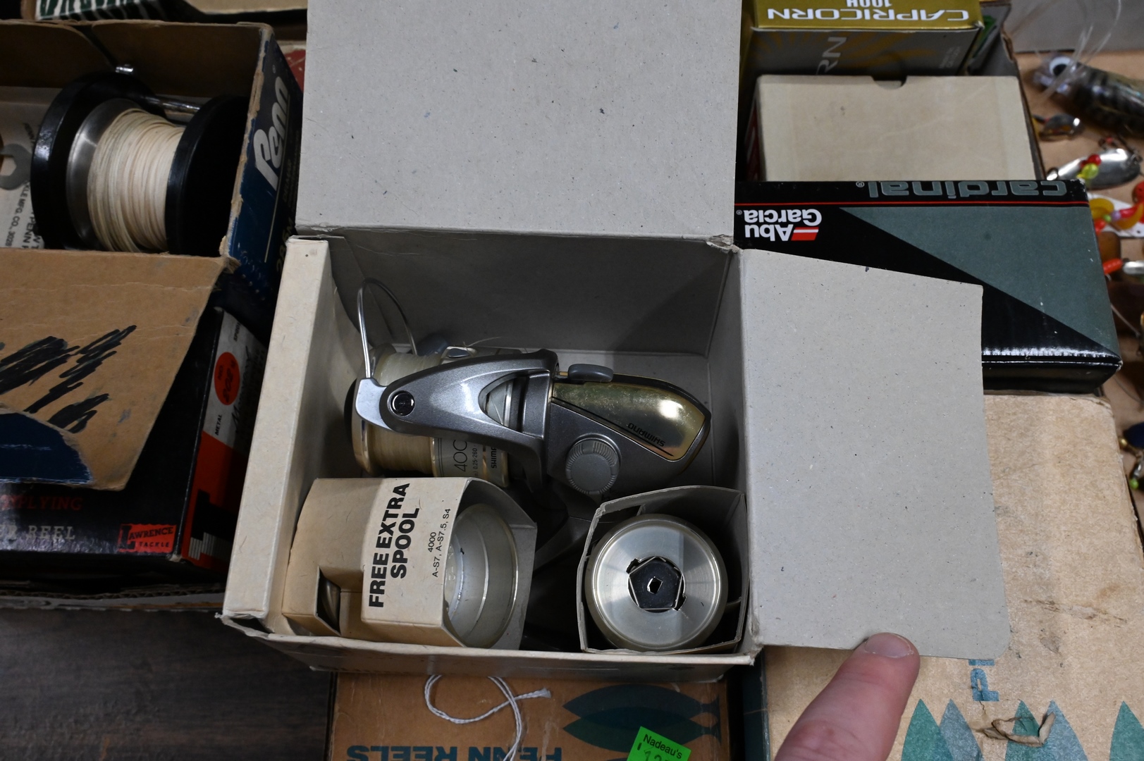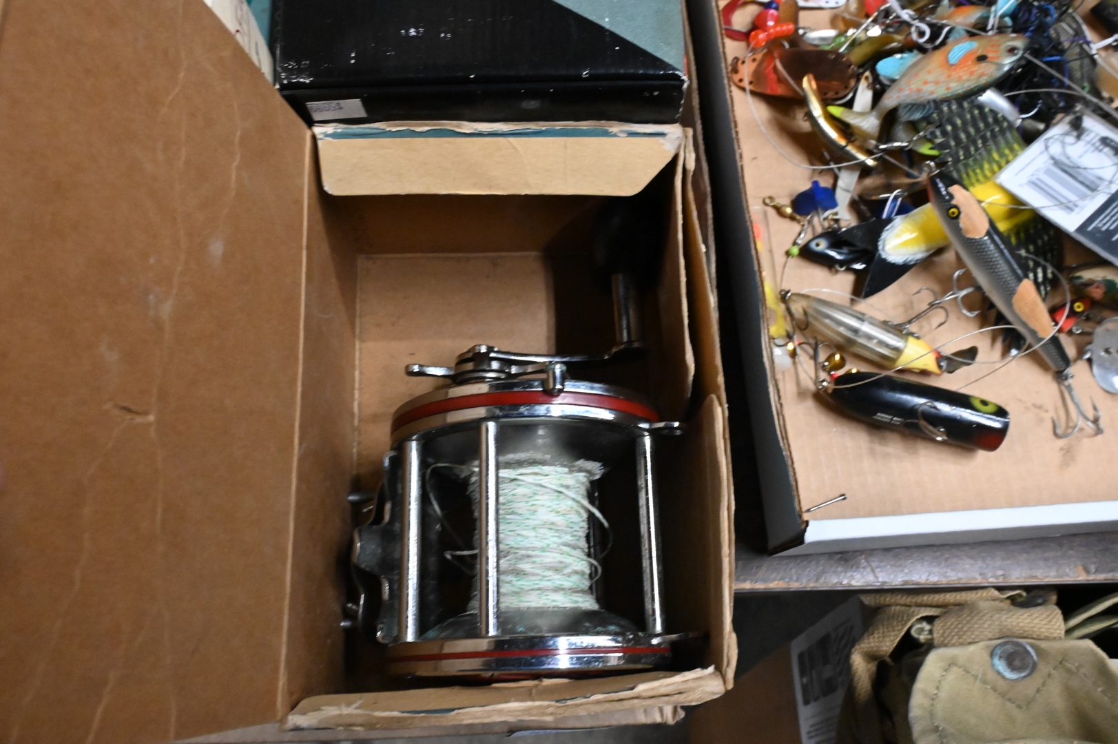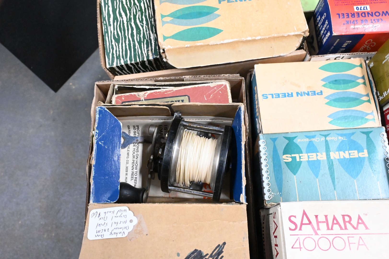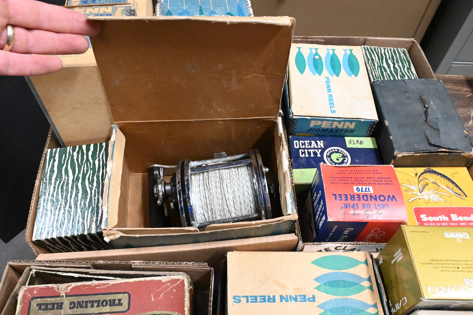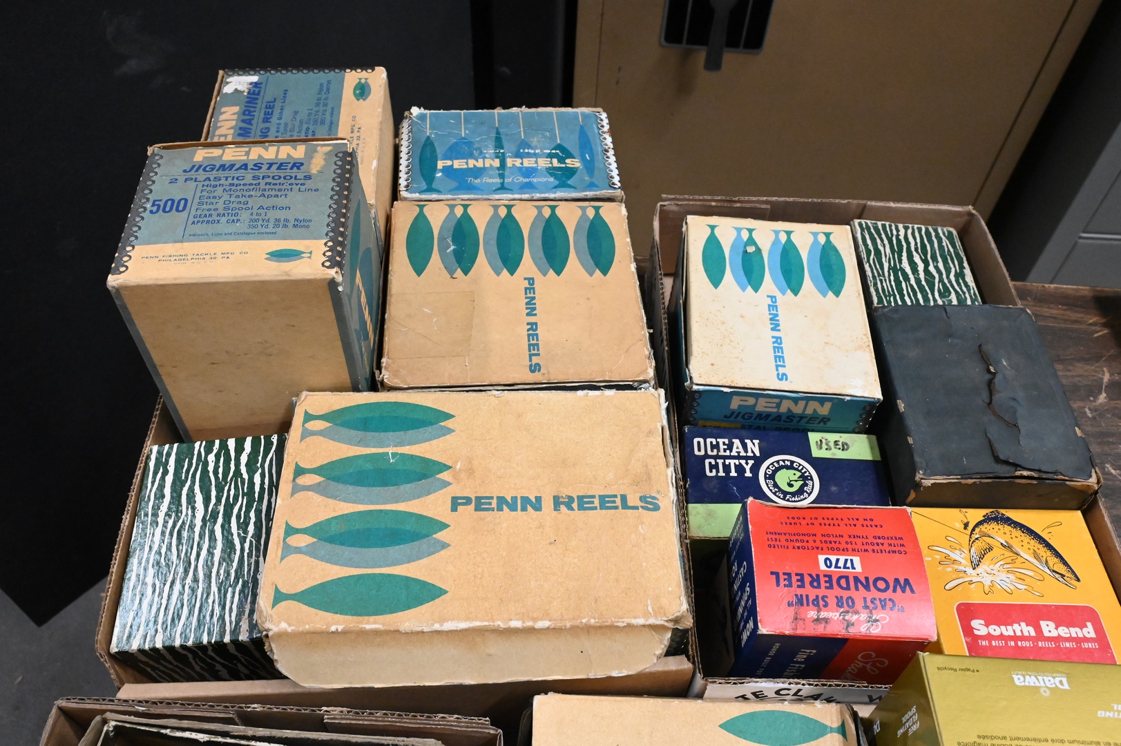 Group of Approximately 25 Fishing Reels in Boxes, brands include Ocean City, Penn, Lawrence, along with others. Provenance: Estate of Peter Tillou, Litchfield, Connecticut.