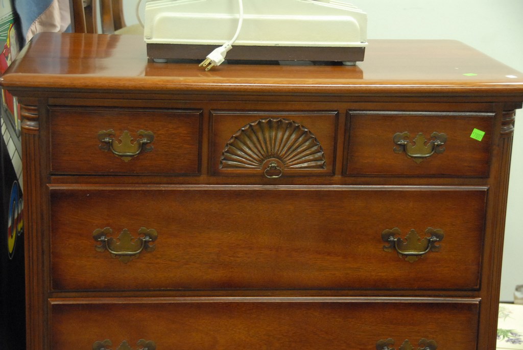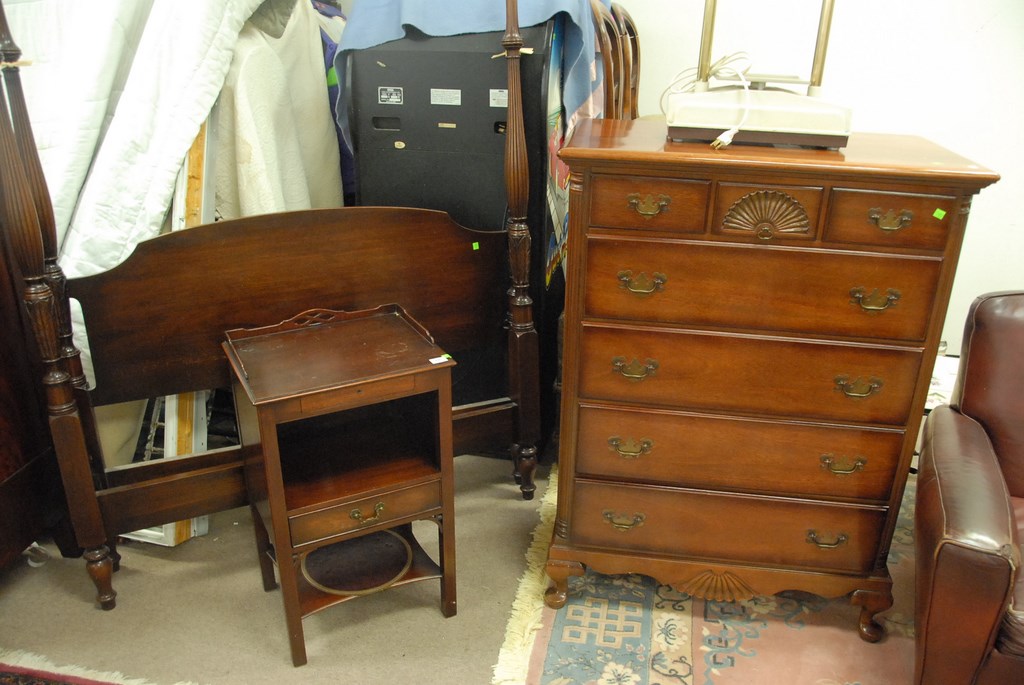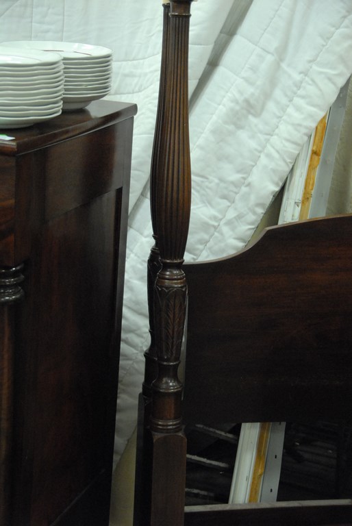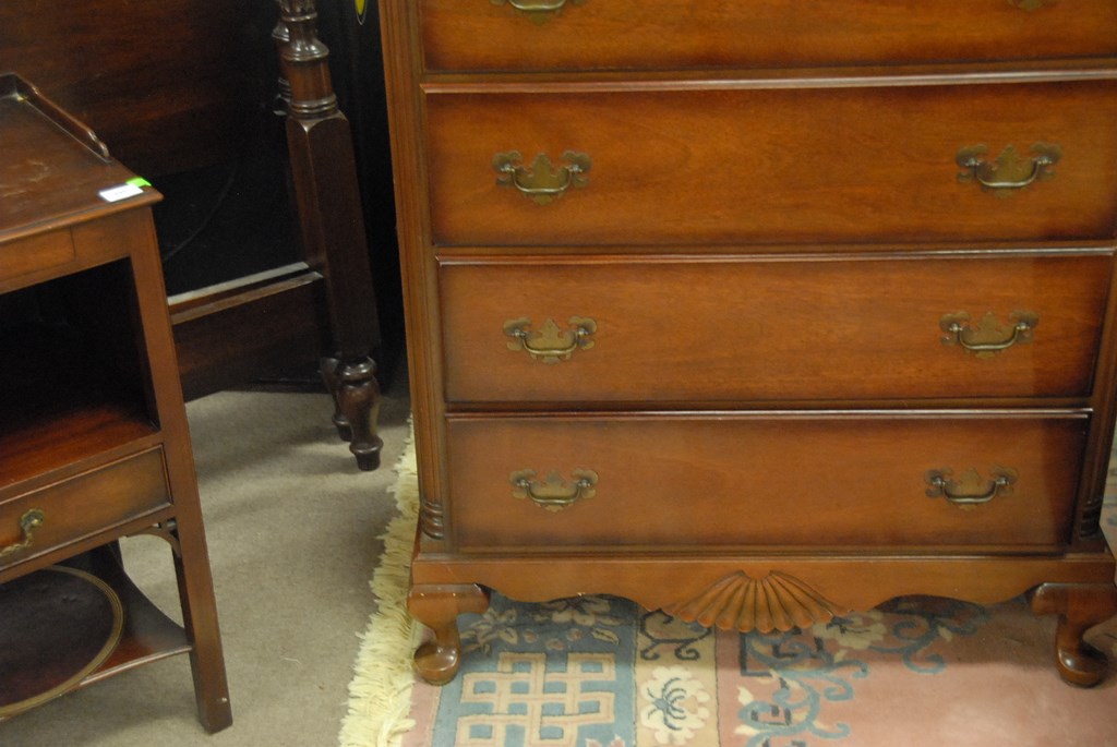 Lot 294: Kling mahogany tall chest ht. 49in. wd. 36in., pair of Kindel mahogany night tables and custom mahogany tall four post double bed.