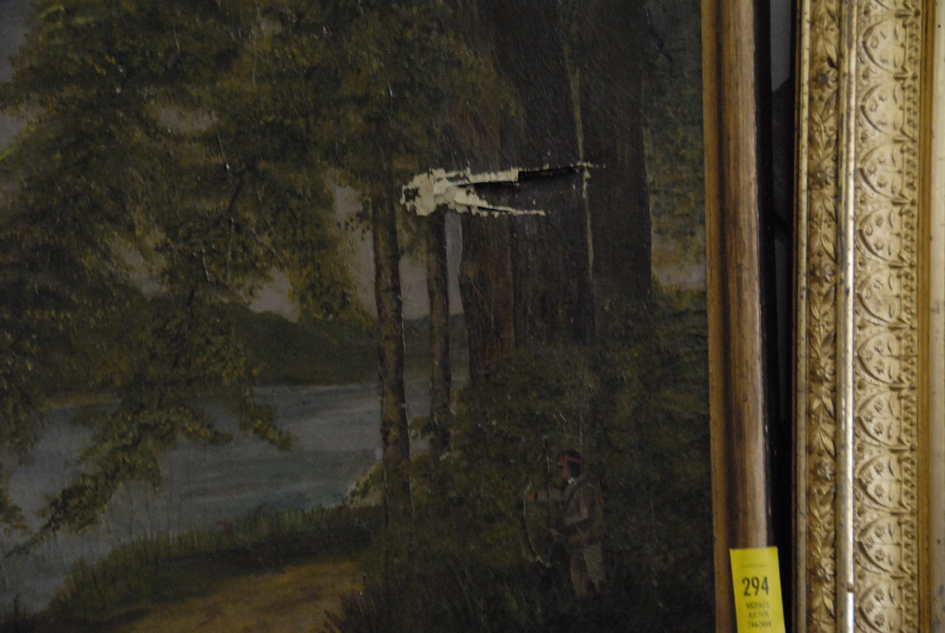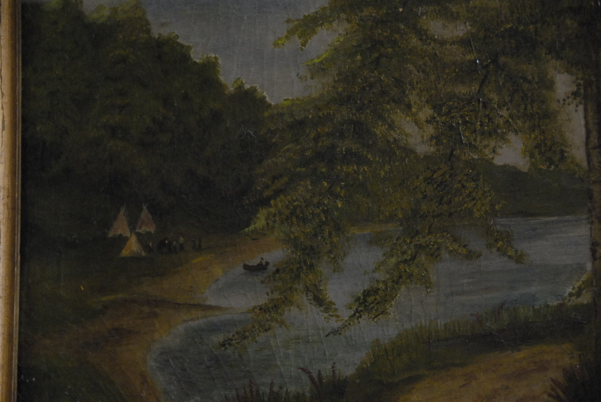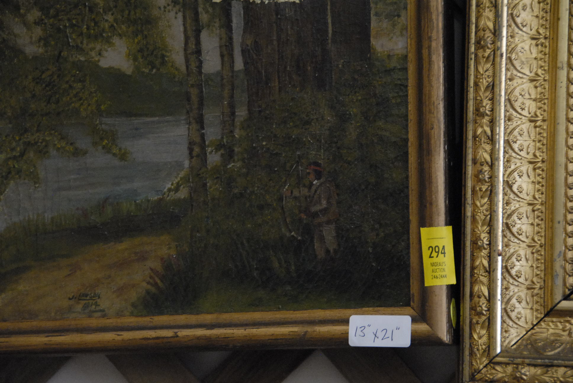 Lot 294: Oil on canvas of an Indian and encampment, has a