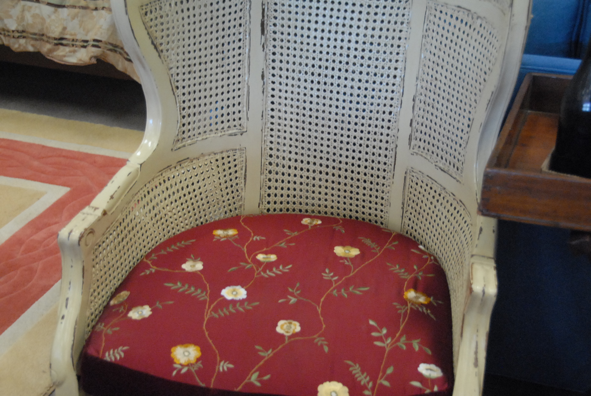 Pair of caned hooded armchairs with upholstered cushions, ht. 60in.
