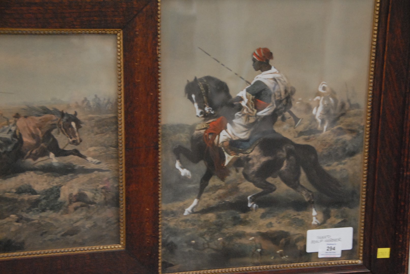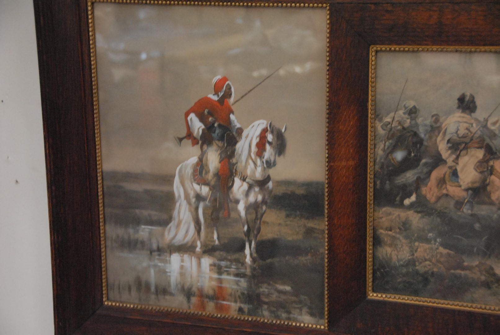 Lot 294: Set of three Adolf Schreyer colored lithographs, highlighted, one in large oak frame. 9 1/2 x 11 1/2