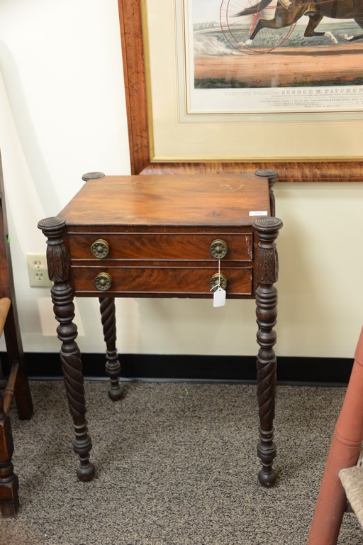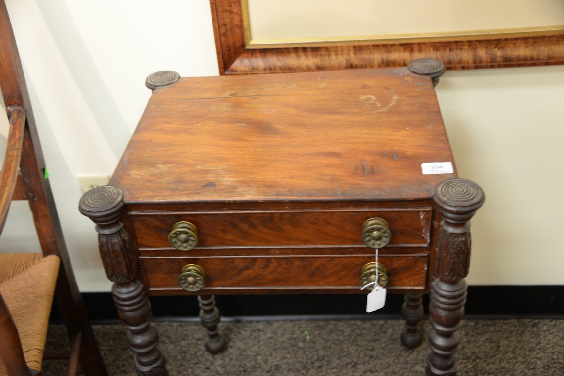 Lot 294: Sheraton mahogany two drawer stand with turret corners on carved turned legs ending in ball feet, Massachusetts circa 1830. top sp…