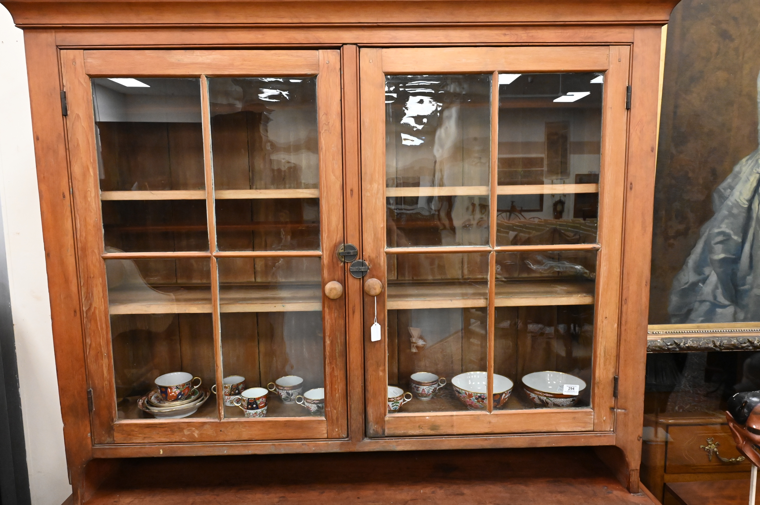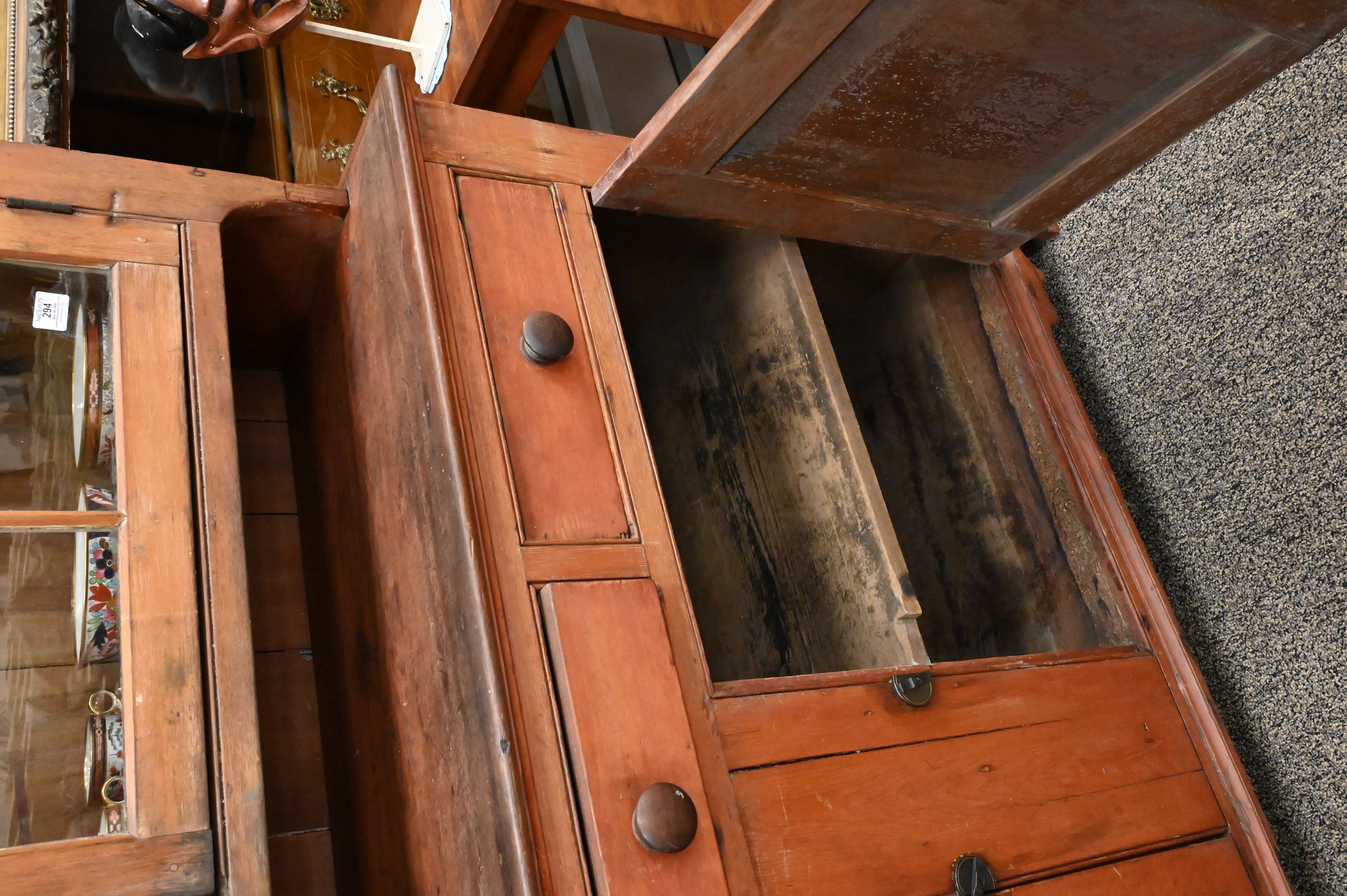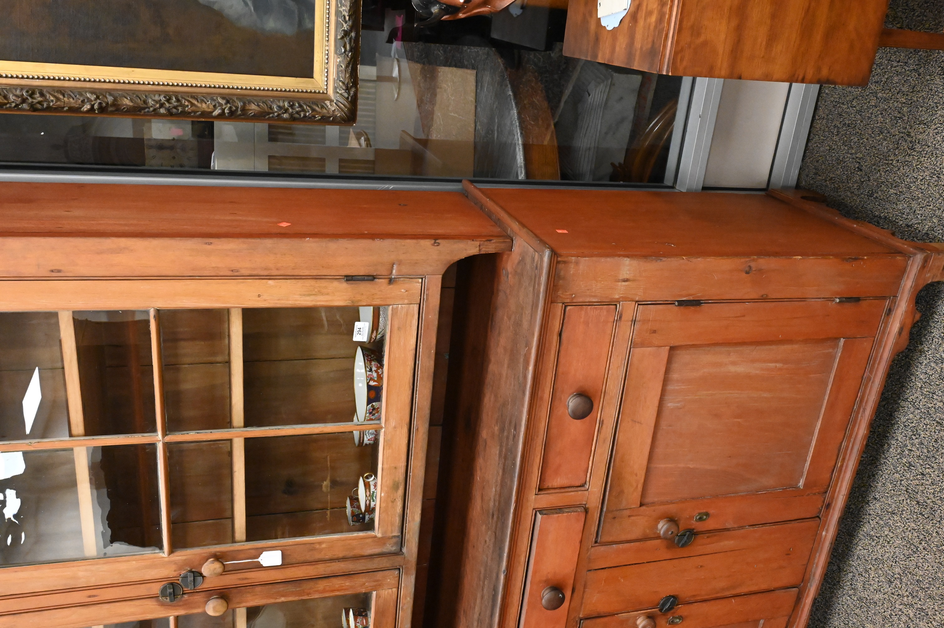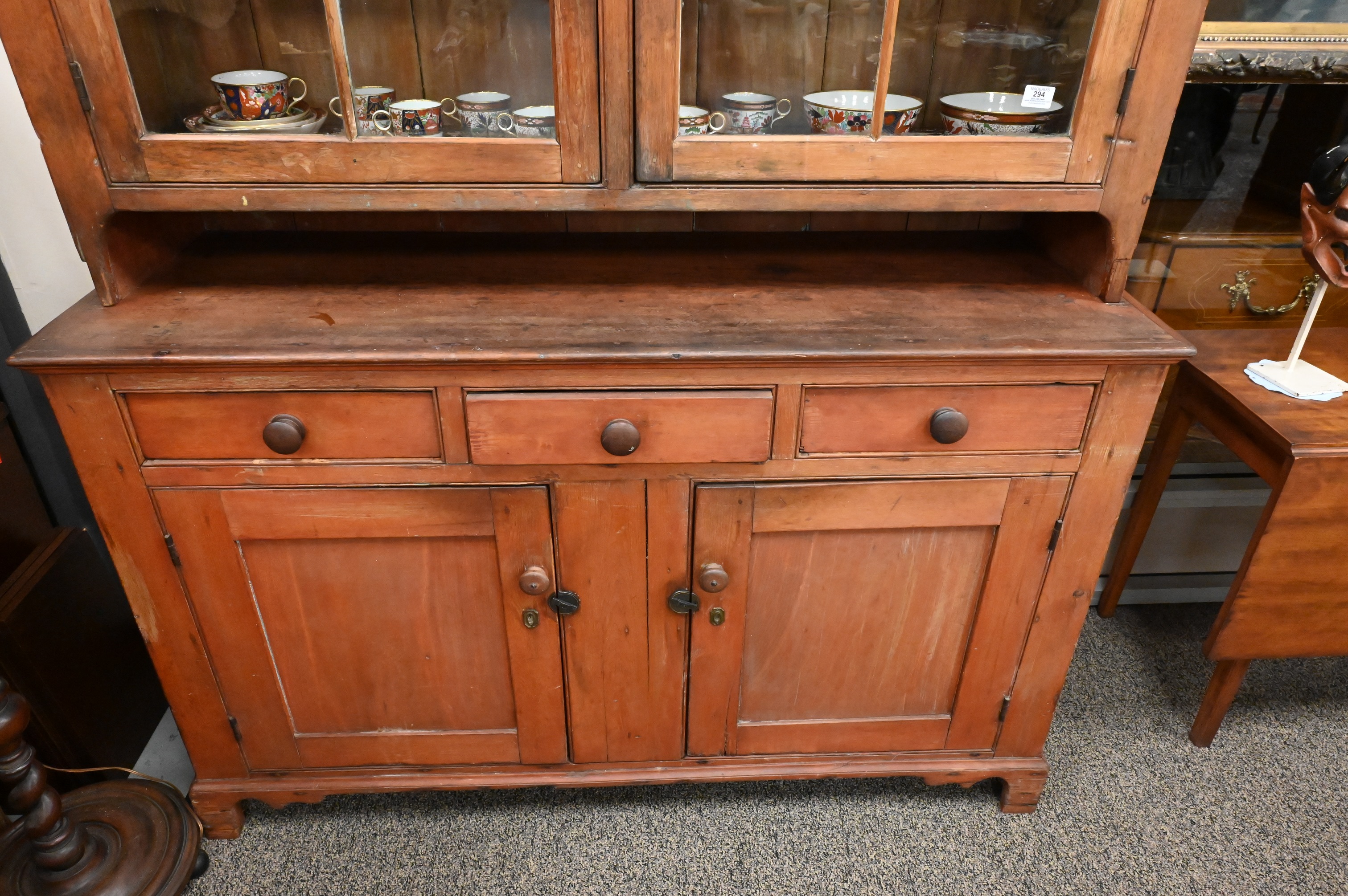 having glazed doors on lower section with three drawers and two doors, set on bracket base
