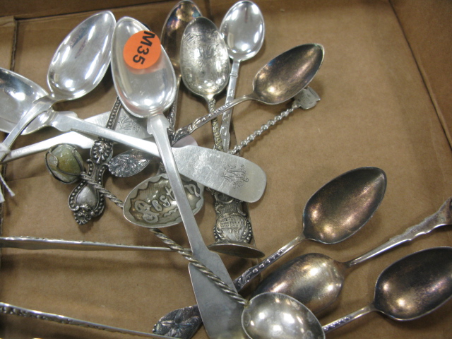 Sterling silver lot including sweater clips in the form of birds, coins, silver spoons, sterling silver spoons.