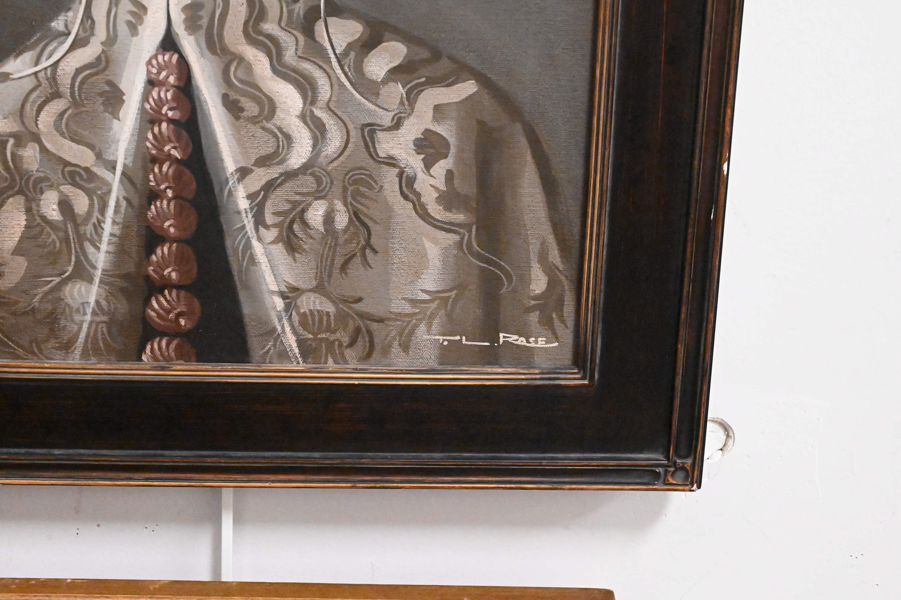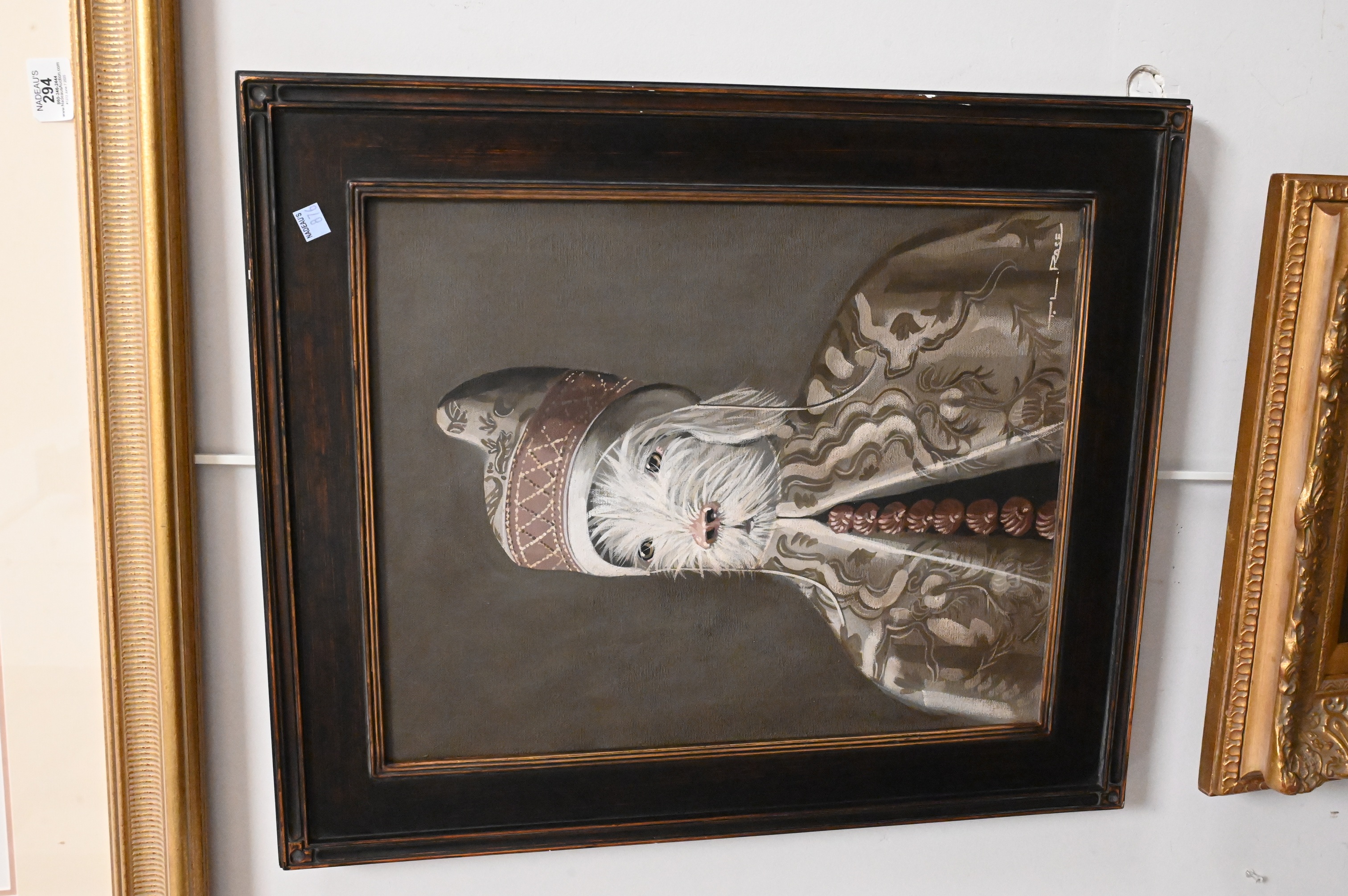 Portrait of a bearded Collie dog in a silk suit with a hat and cape, Oil on canvas, Signed lower right T.L. Rose