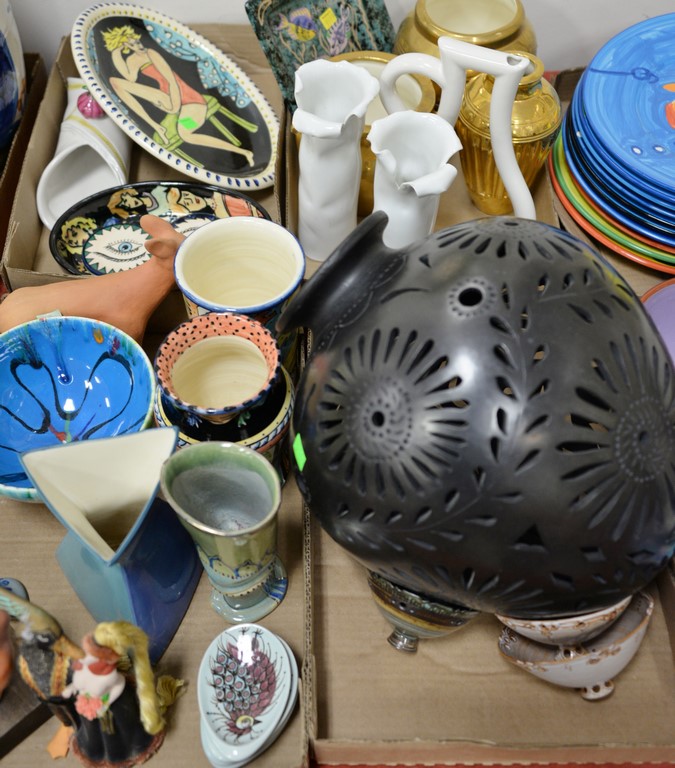 Three box lots of ceramic and art pottery pieces Wassi Art Jamaica dish, Loudware vase, Jane Willing, Dorothy Hopner vase, two gilt vases signed Dien, large reticulated black vase, etc.