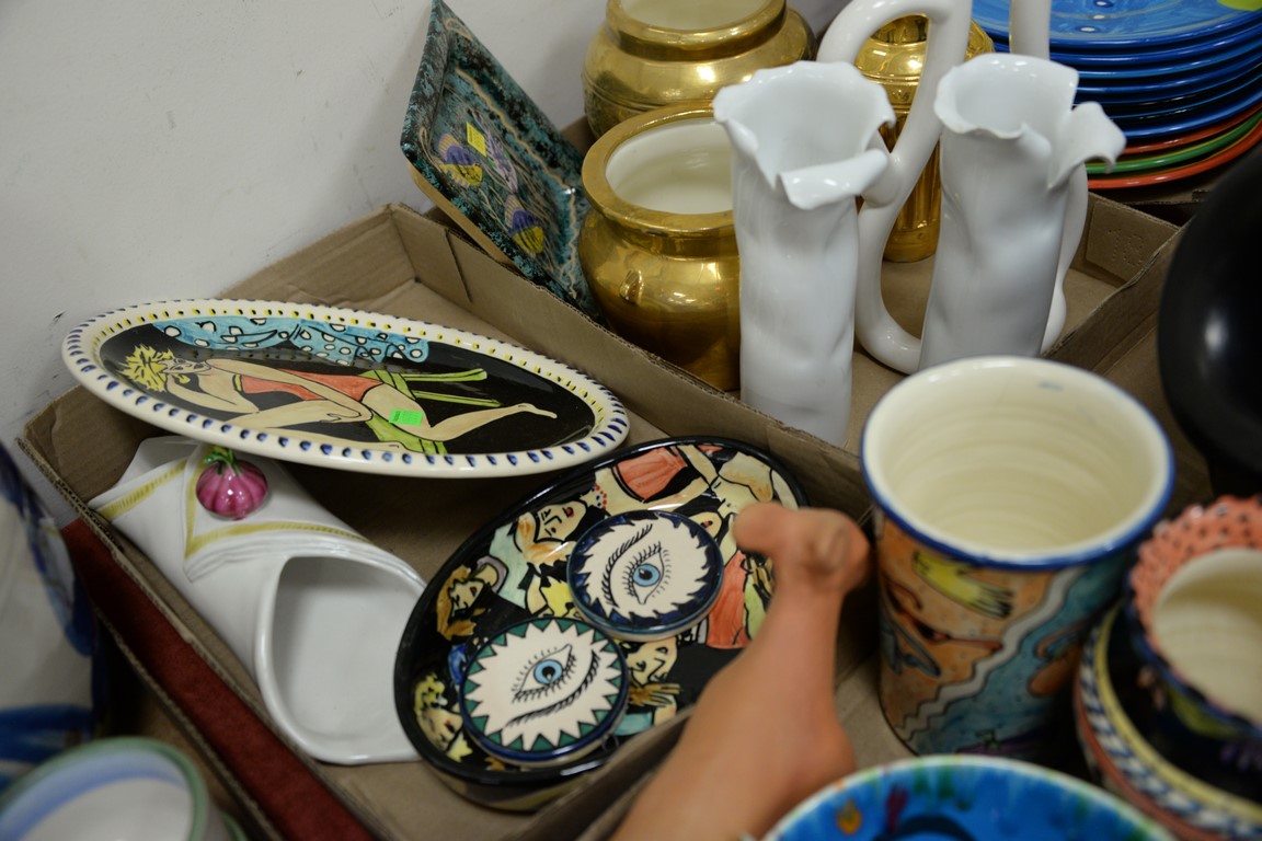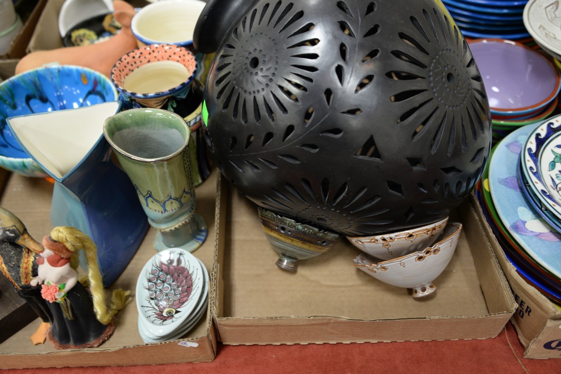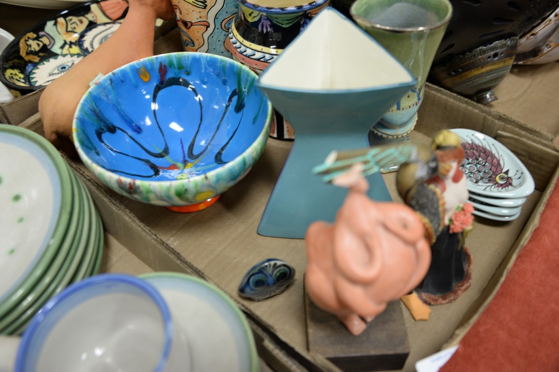 Lot 294: Three box lots of ceramic and art pottery pieces Wassi Art Jamaica dish, Loudware vase, Jane Willing, Dorothy Hopner vase, two gilt…