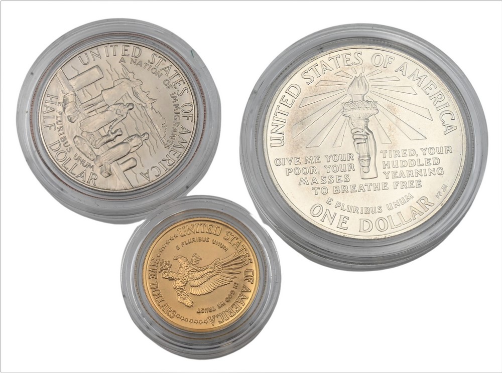 Three Piece 1986 Uncirculated Statue of Liberty Set, to include five dollar gold, one copper nickel half-dollar, along with one silver dollar.