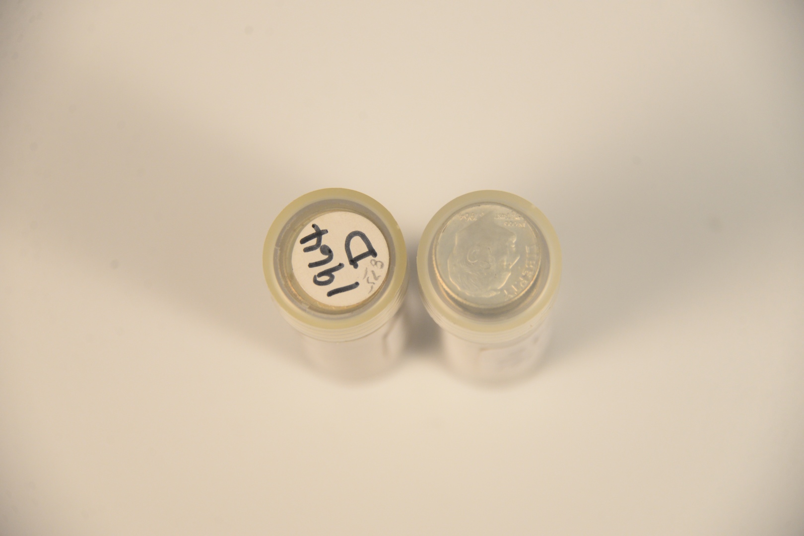 Two rolls of 1964 D Roosevelt dimes, uncirculated.