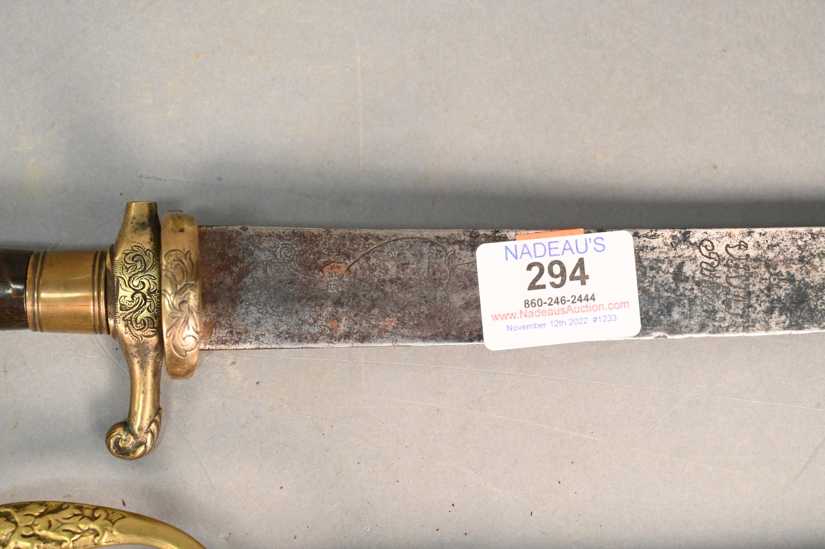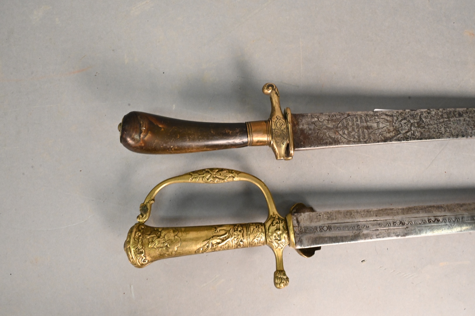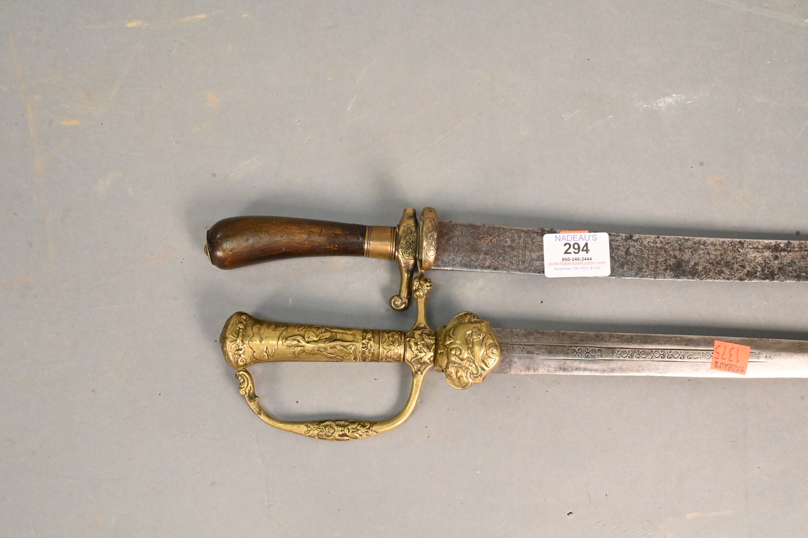 Two Swords, to include a presentation sword with incised blade, Vivo Pardur, and wood handle; along with a cuttoe hunting sword having brass handle with bear hurting dogs and figures, largest 24 inches, Provenance: Estate of Cyril H. Moore Jr, Kent, Connecticut.