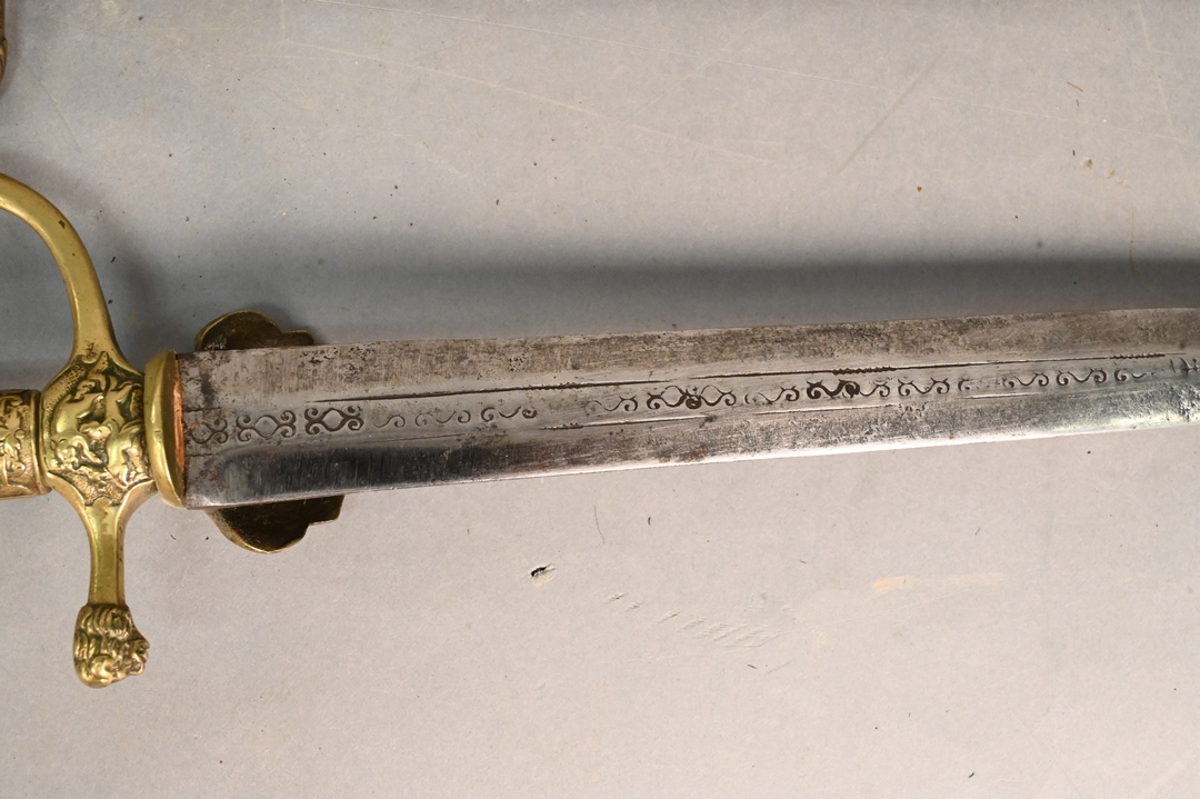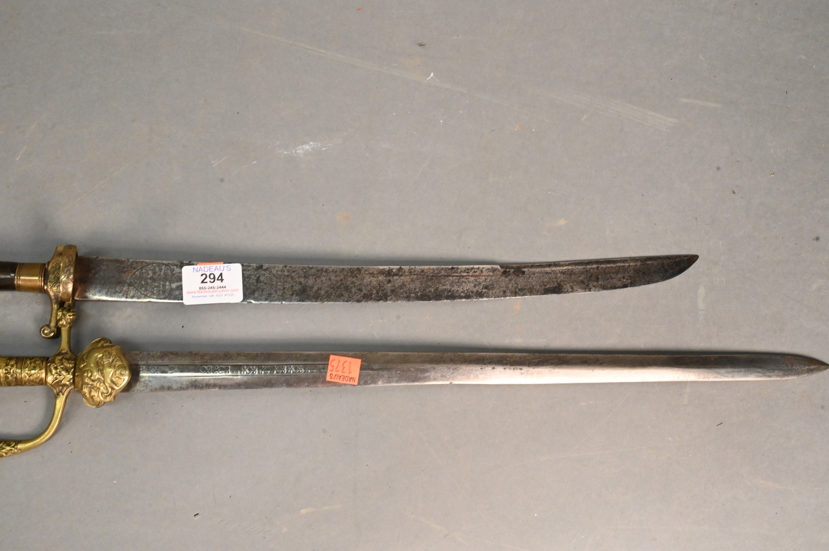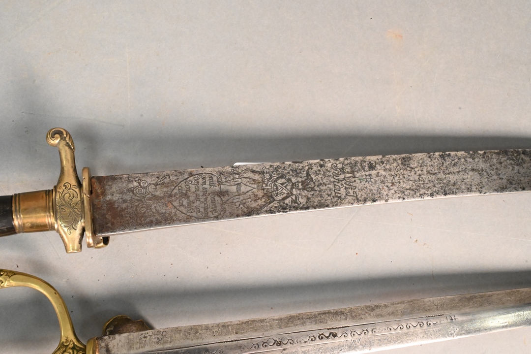 Two Swords, to include a presentation sword with incised blade, Vivo Pardur, and wood handle; along with a cuttoe hunting sword having brass handle with bear hurting dogs and figures, largest 24 inches, Provenance: Estate of Cyril H. Moore Jr, Kent, Connecticut.