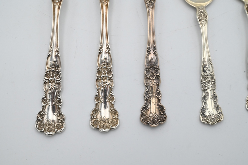 50 Piece Gorham Sterling Silver Partial Flatware Set, to include 11 dinner forks, 5 salad forks, 18 teaspoons, 3 weighted butter knives, 7 serving pieces, along with 6 soup spoons, probably buttercup pattern, 64.8 t.oz. and weighted knives, Provenance: Fifty Year Personal Collection of Clocks and American Antiques from Thomas Bailey, Manchester, Connecticut.
