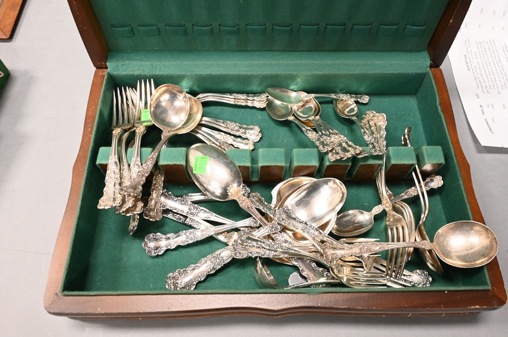 Lot 295: 50 Piece Gorham Sterling Silver Partial Flatware Set, to include 11 dinner forks, 5 salad forks, 18 teaspoons, 3 weighted butter knives, 7 serving pieces, along with 6 soup spoons, probably buttercup pattern, 64.8 t.oz. and weighted knives, Provenance: Fifty Year Personal Collection of Clocks and American Antiques from Thomas Bailey, Manchester, Connecticut.