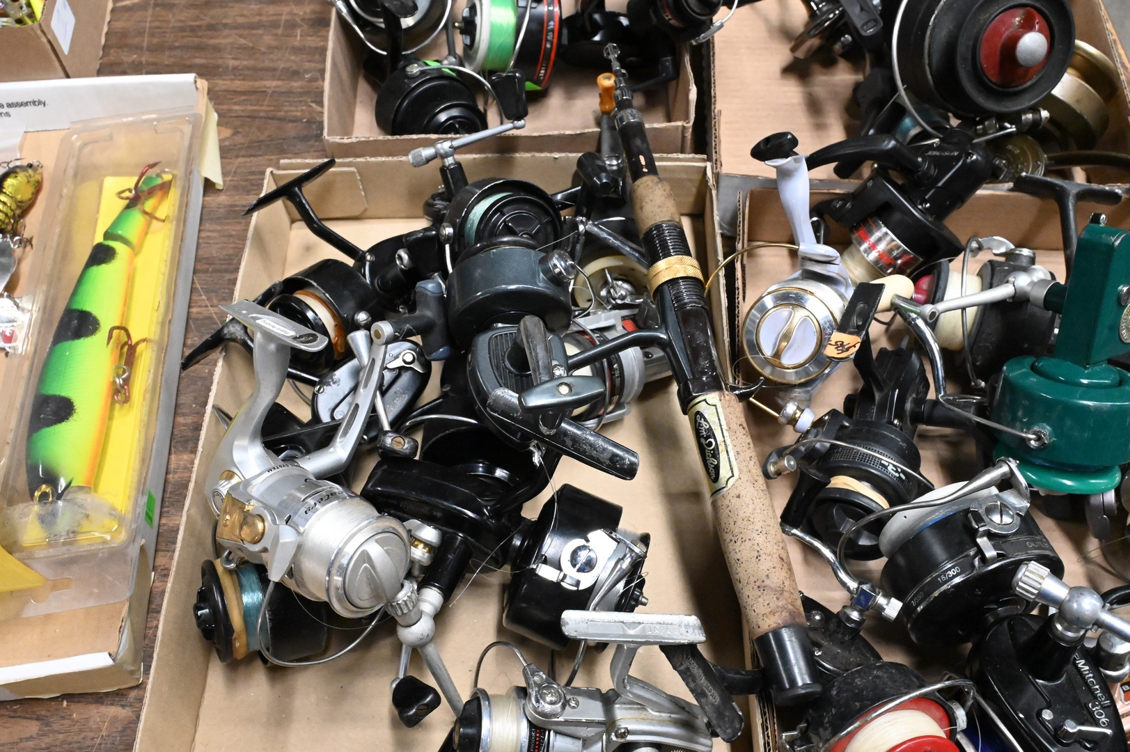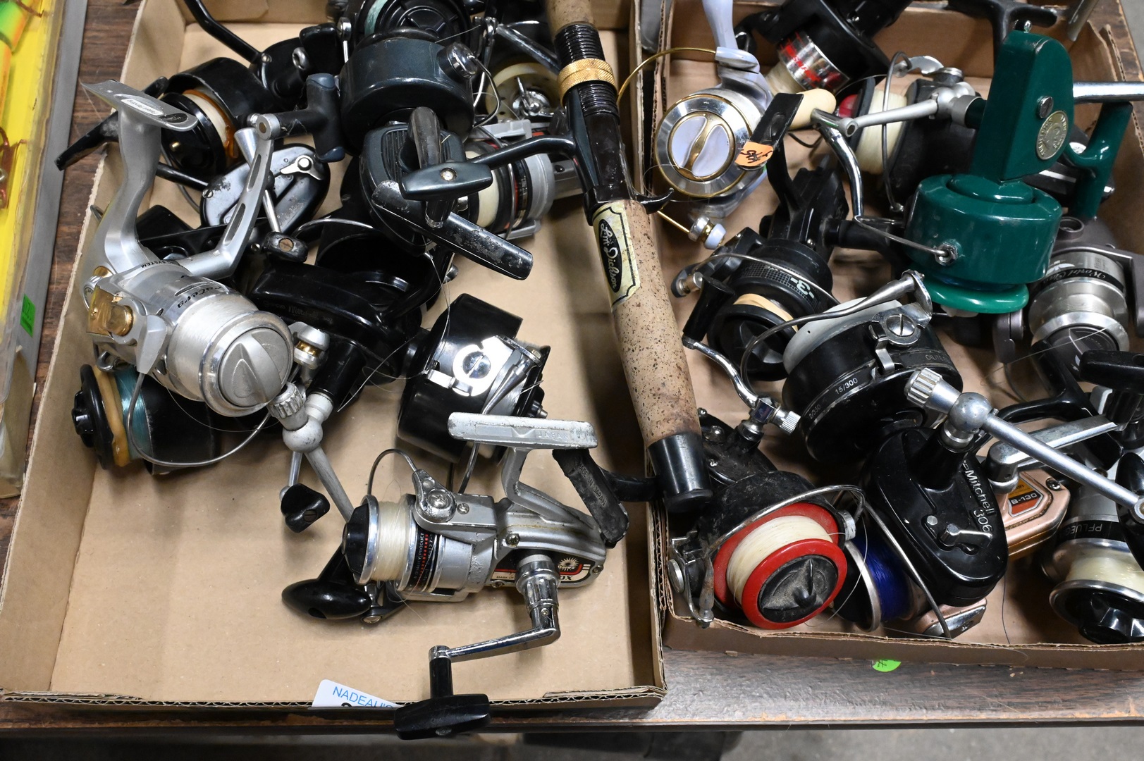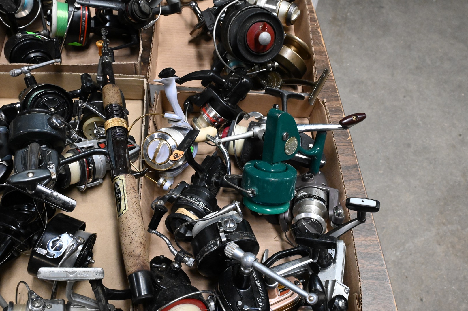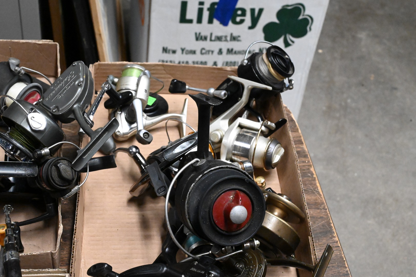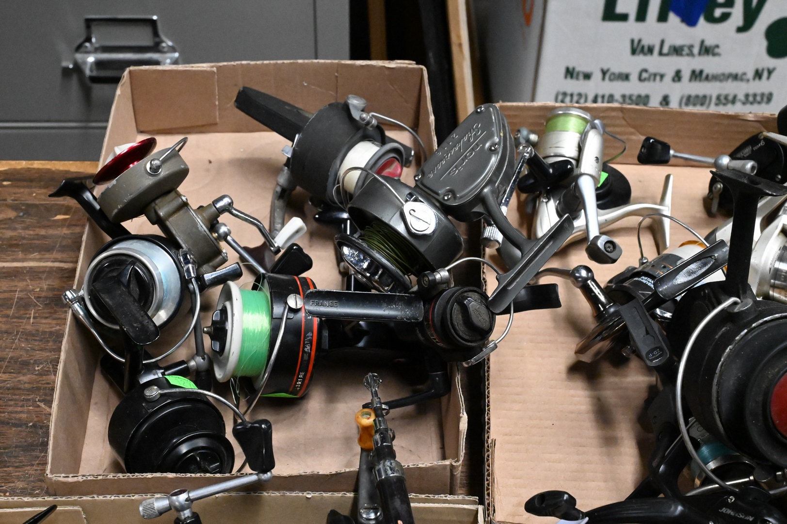 Approximately 34 Spincast Fishing Reels, brands include Mitchell, Penn, L.L. Bean, Catera, along with others. Provenance: Estate of Peter Tillou, Litchfield, Connecticut.