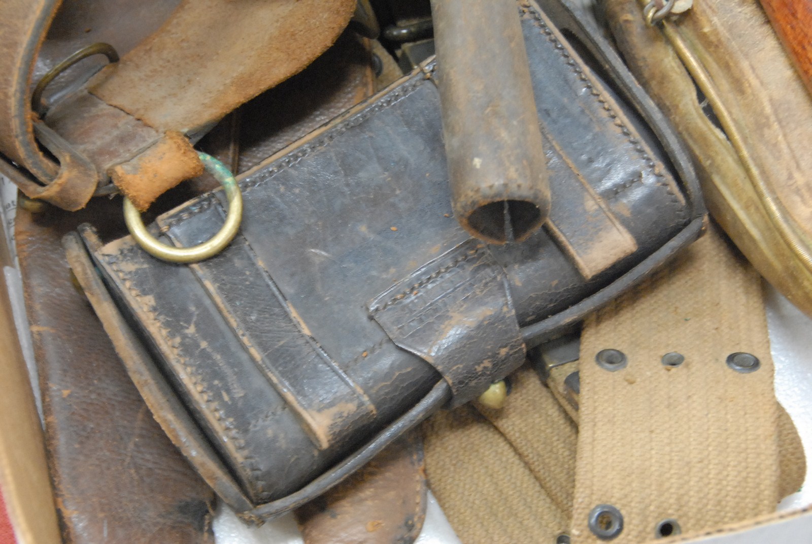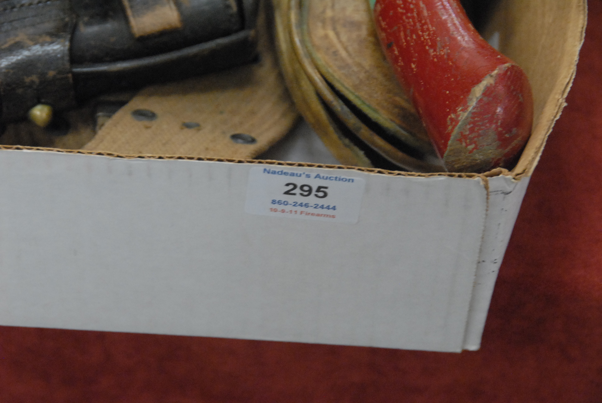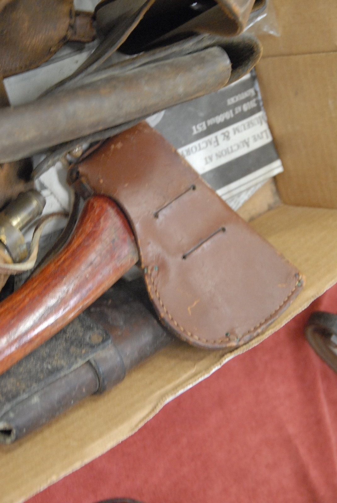 Box of leather holsters, powder horns, hatchet parts, etc.