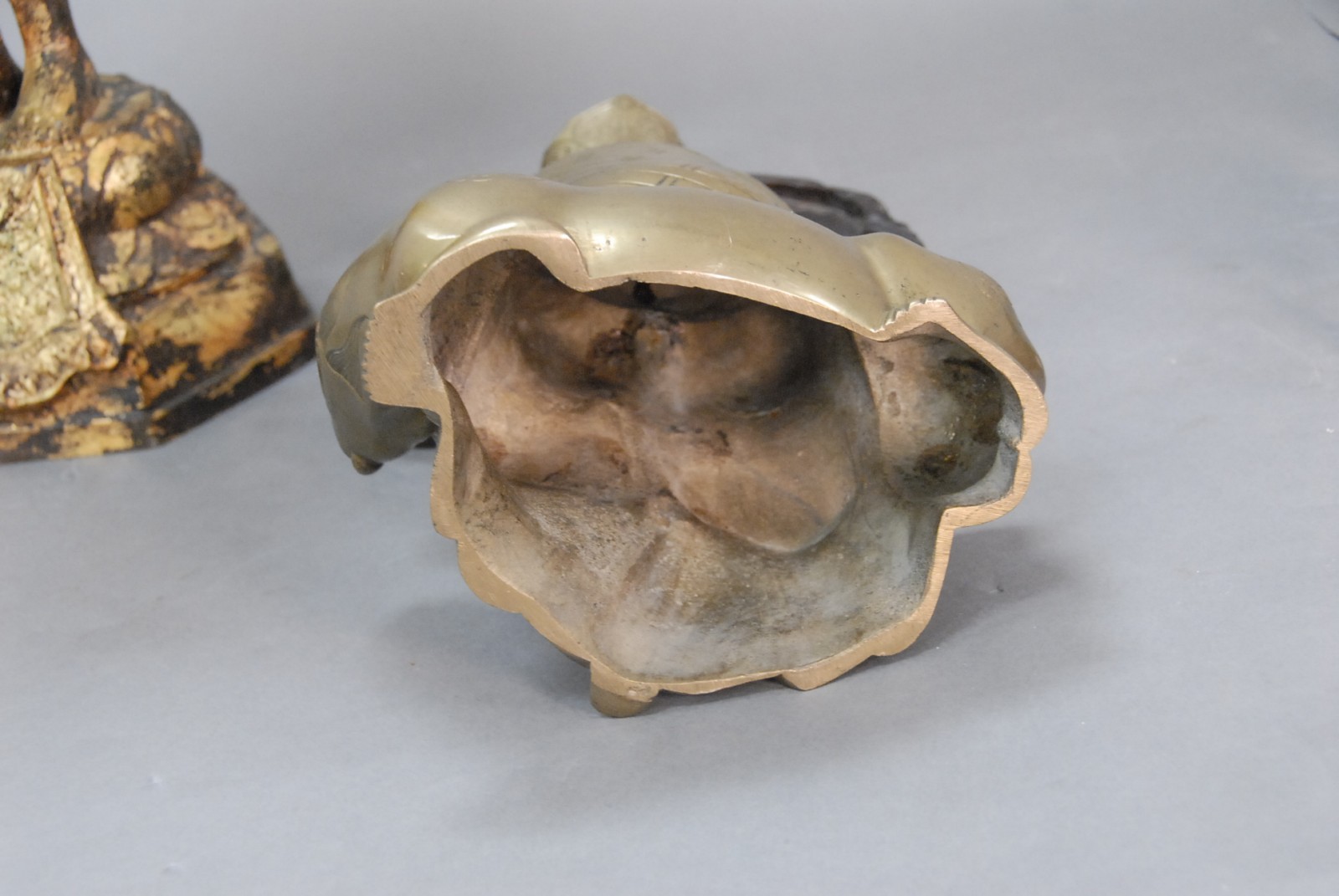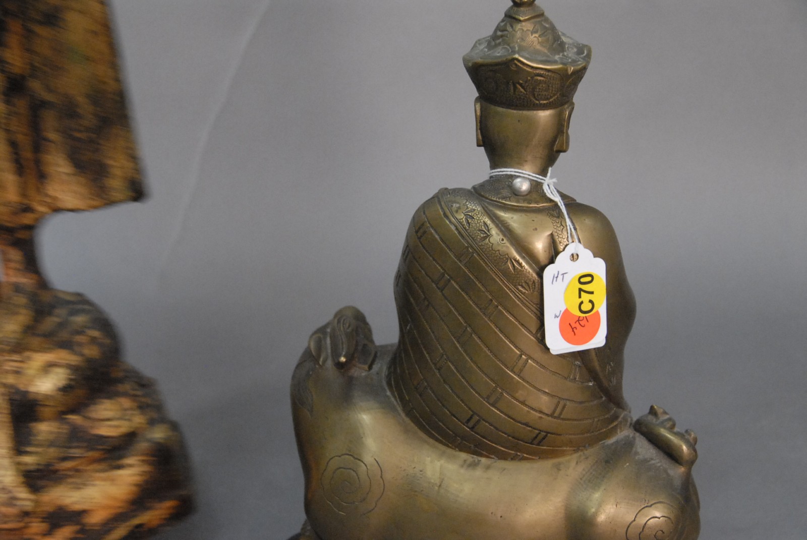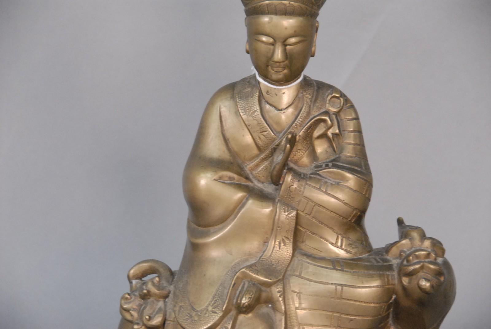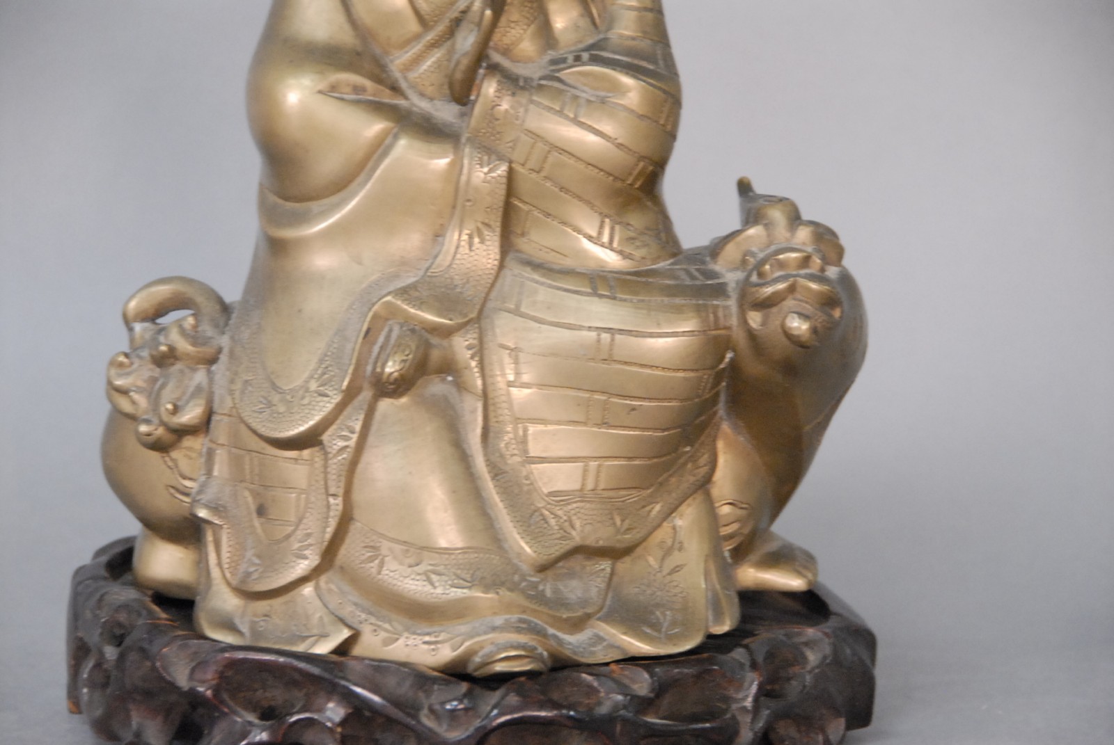 Chinese brass figure of seated mandarin on kilin with fitted wooden base, 19th century – 20th century.