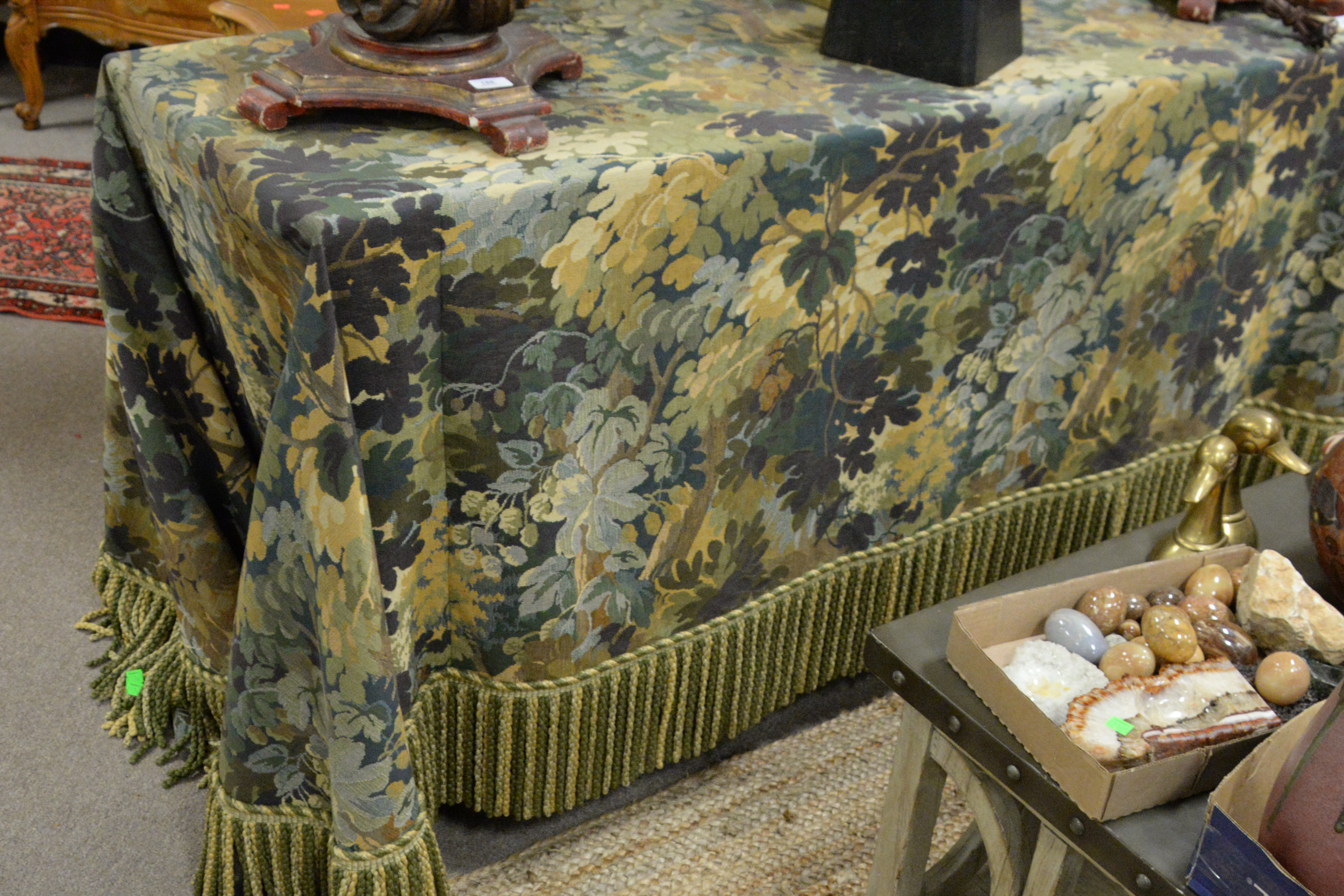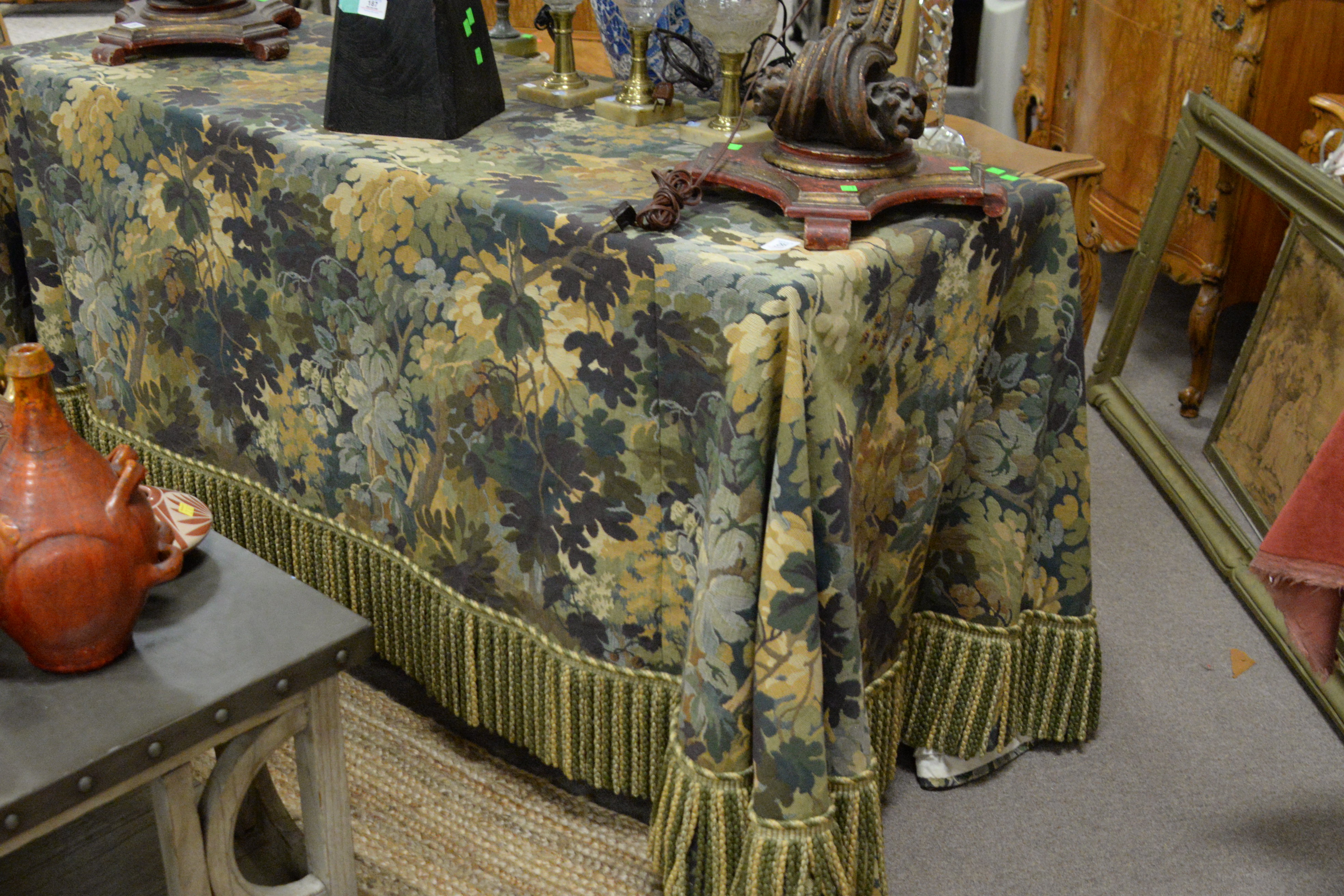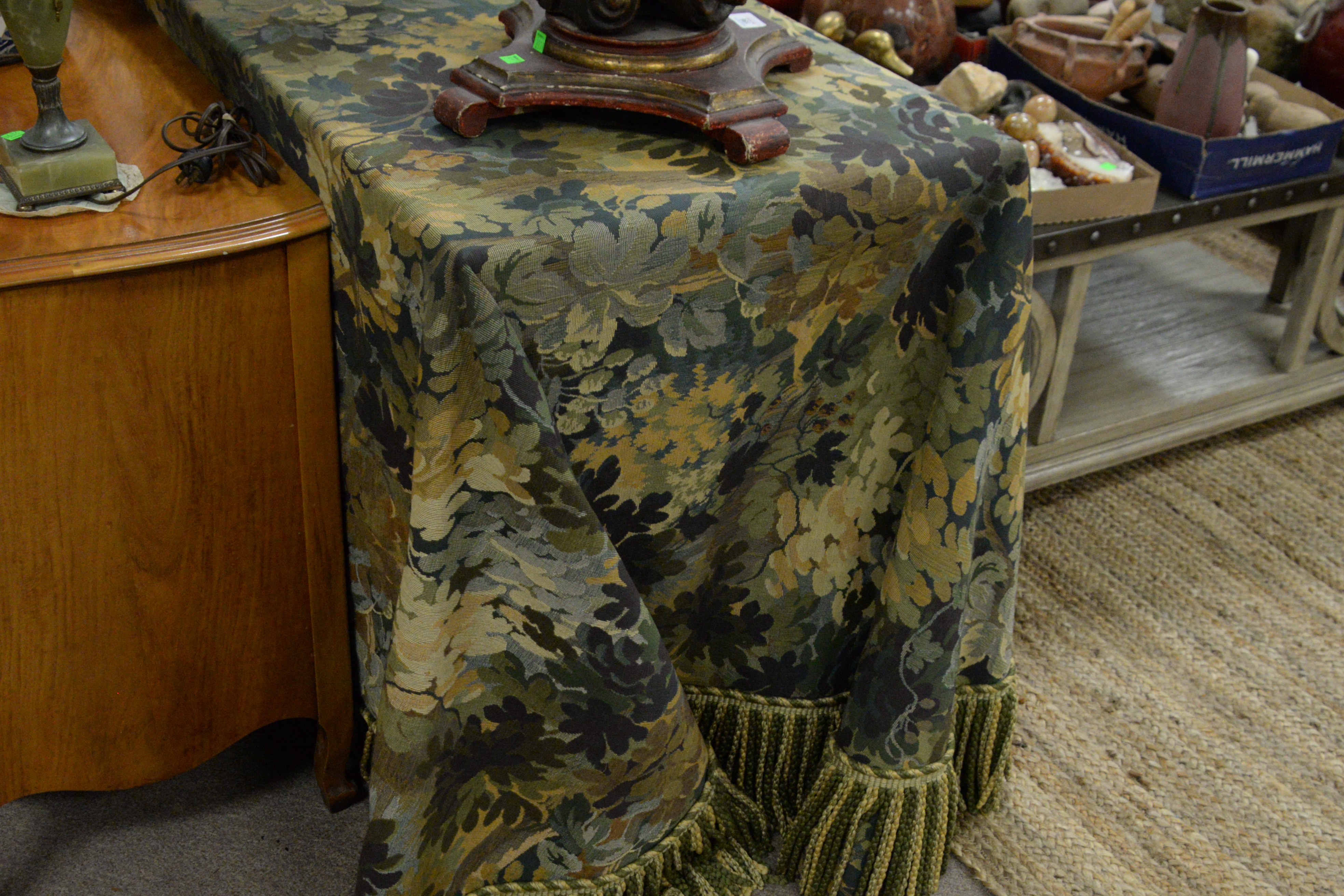 Custom Hall / Sofa Table, having custom floral tablecloth with fringe, height 33 inches, top 22″ x 66″