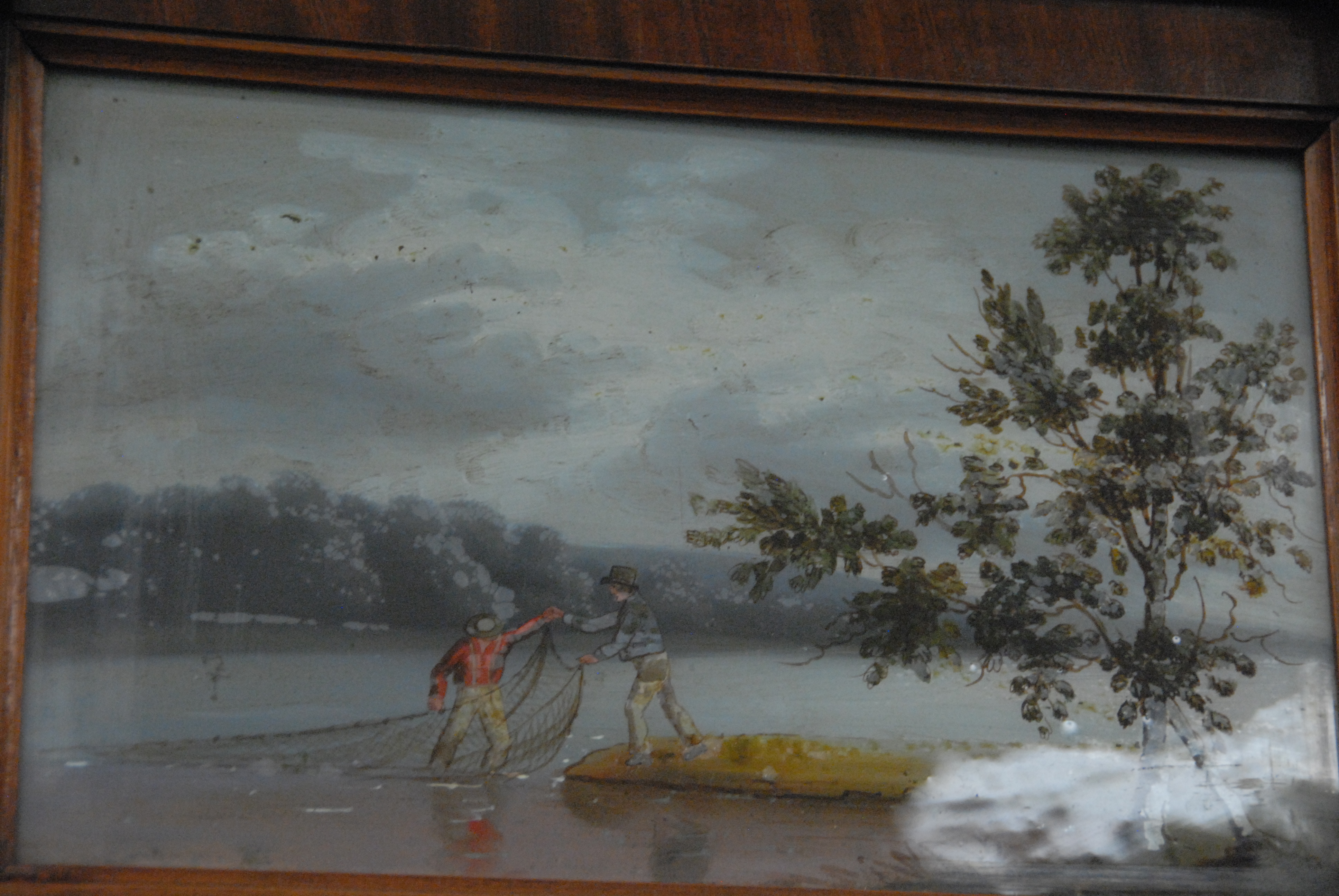 Federal mahogany two part mirror with reverse painted panel of two men fishing. ht. 37in.