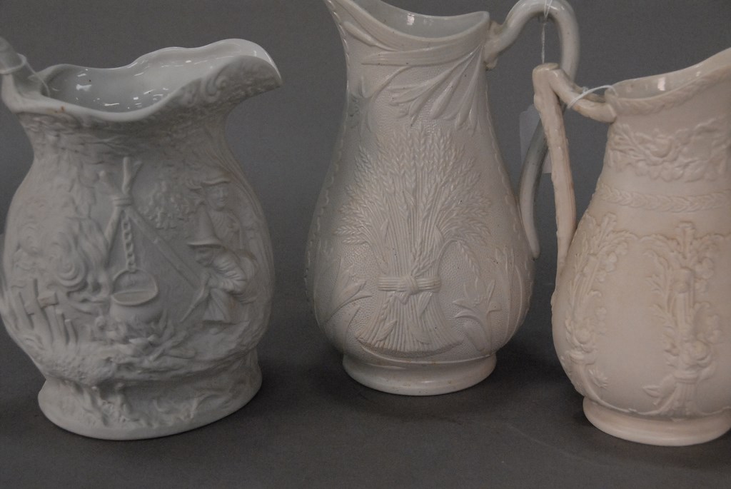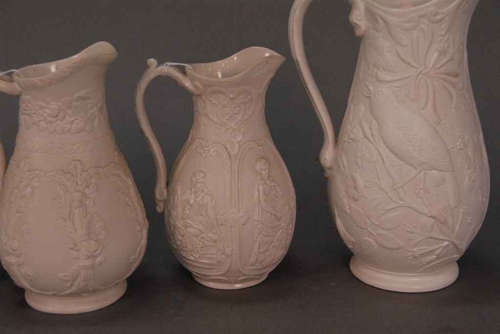 Five pitchers to include two basalt and three glazed. ht. 7in. – 10in.