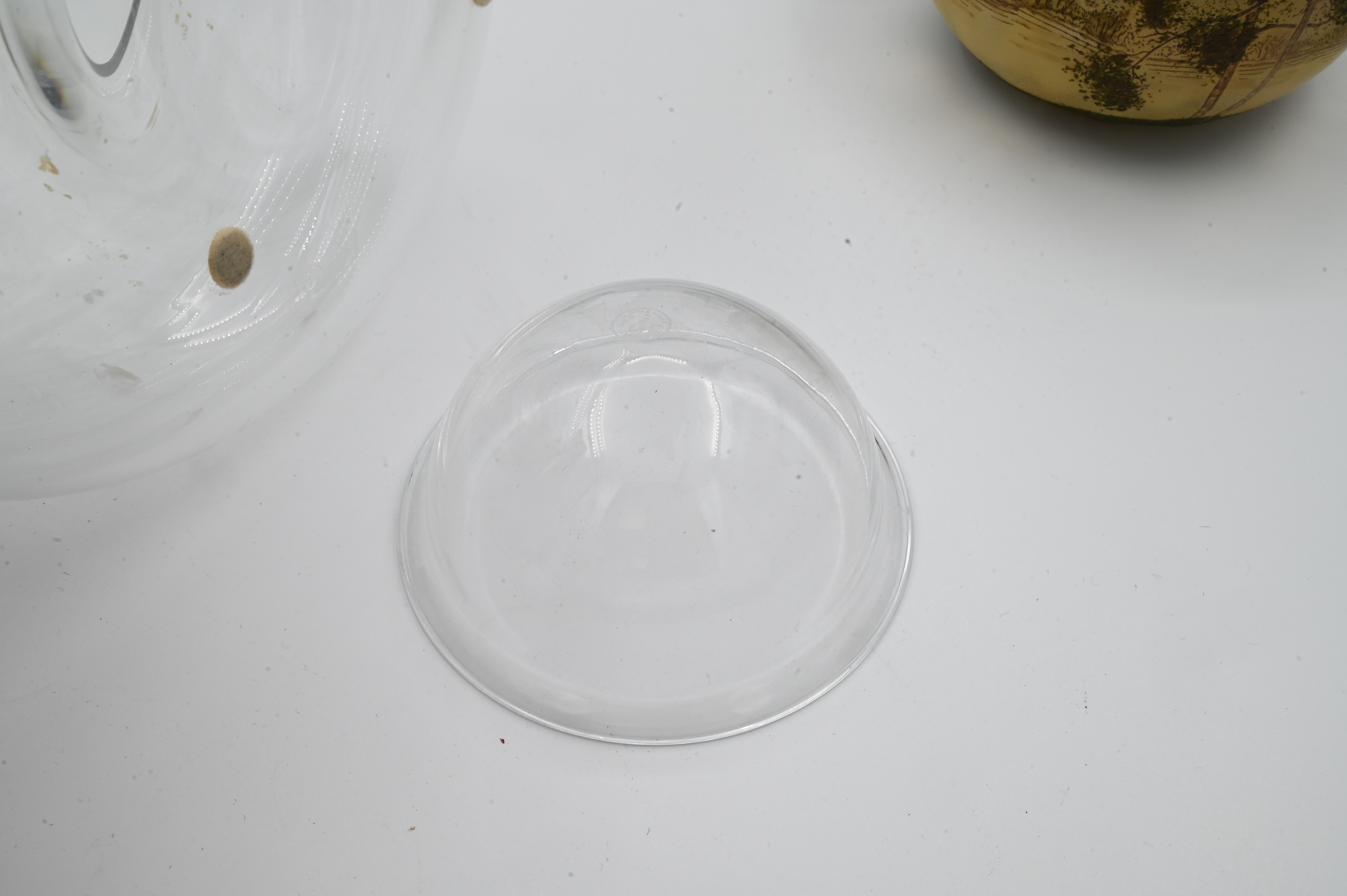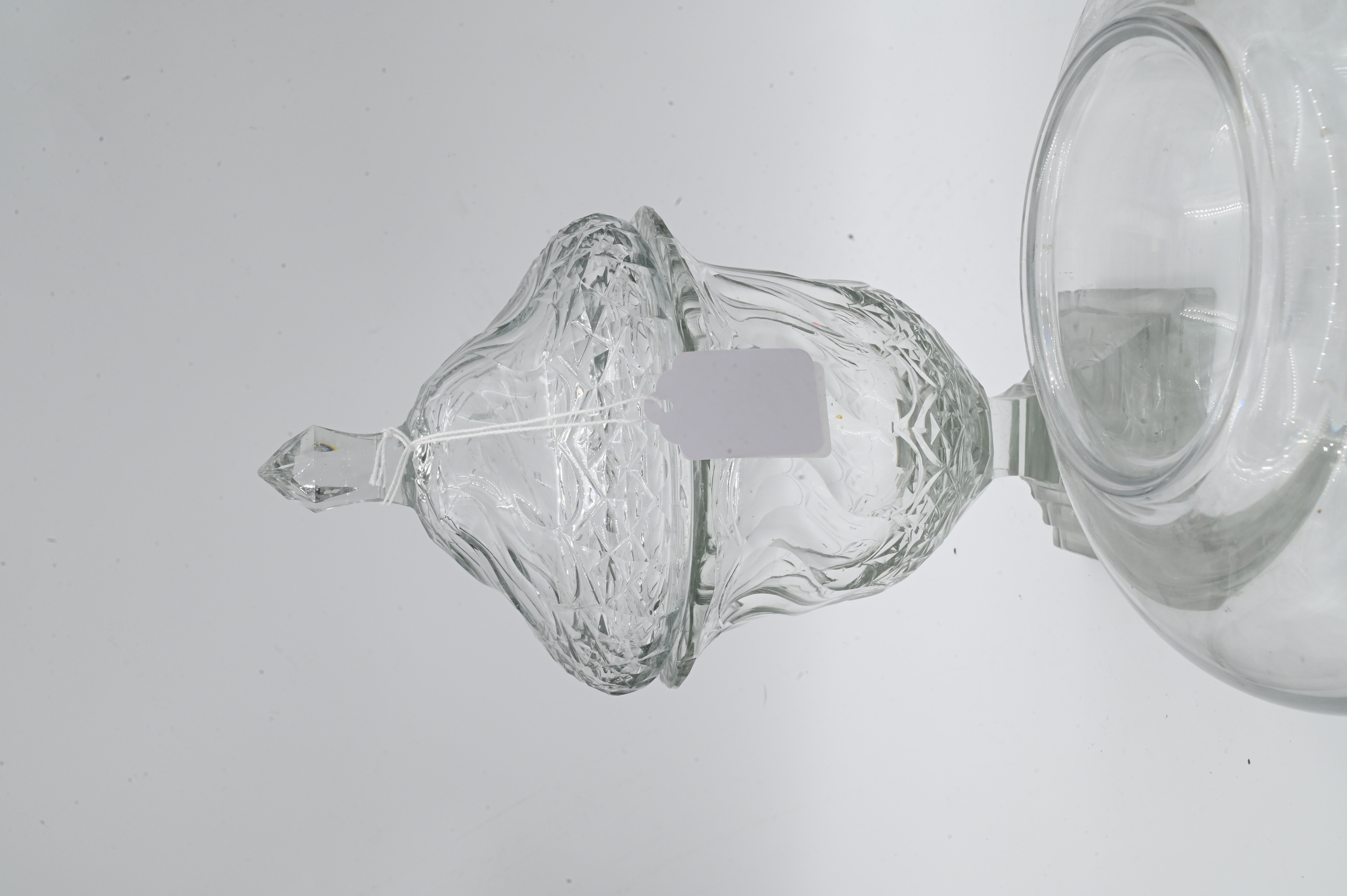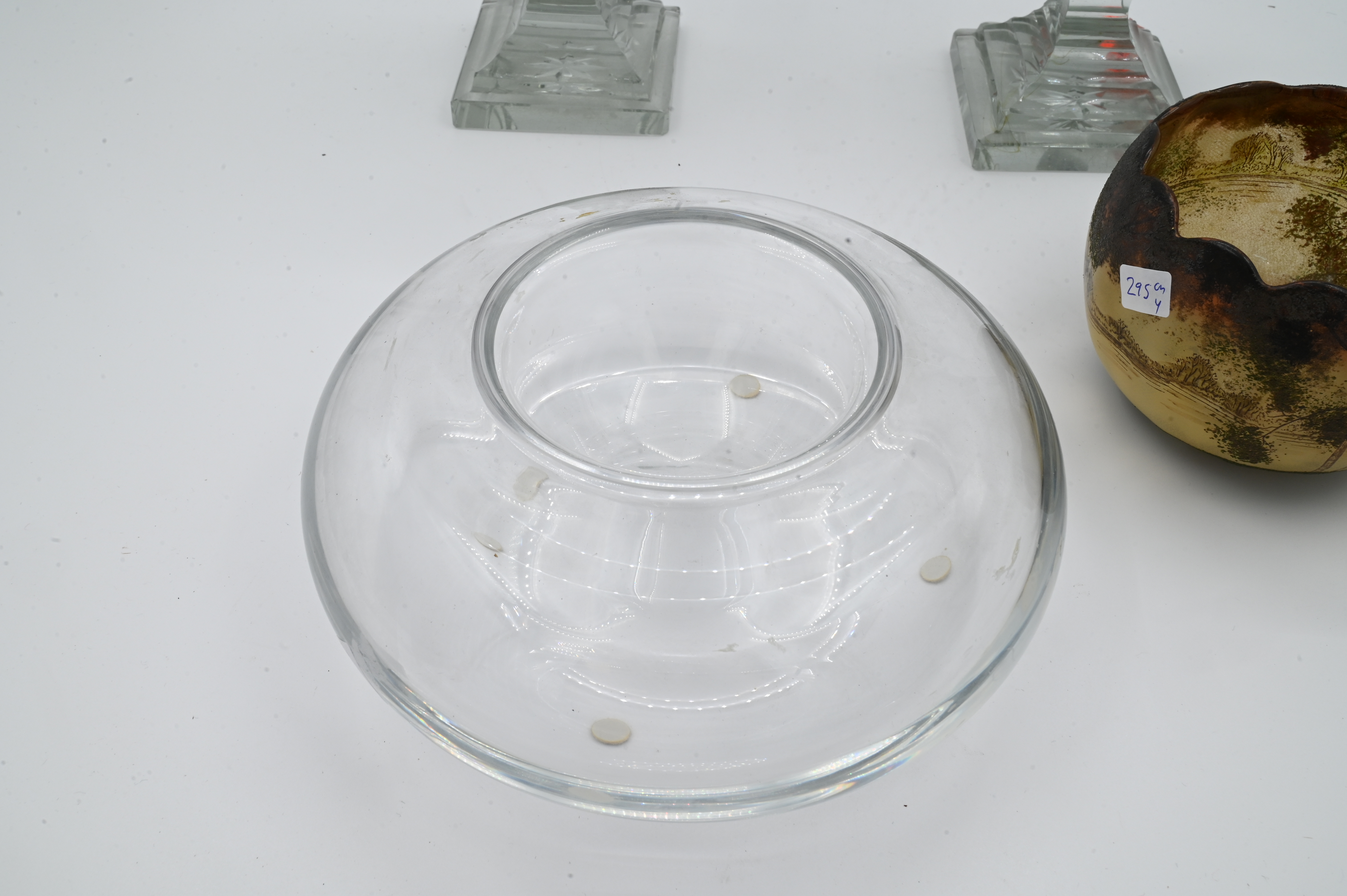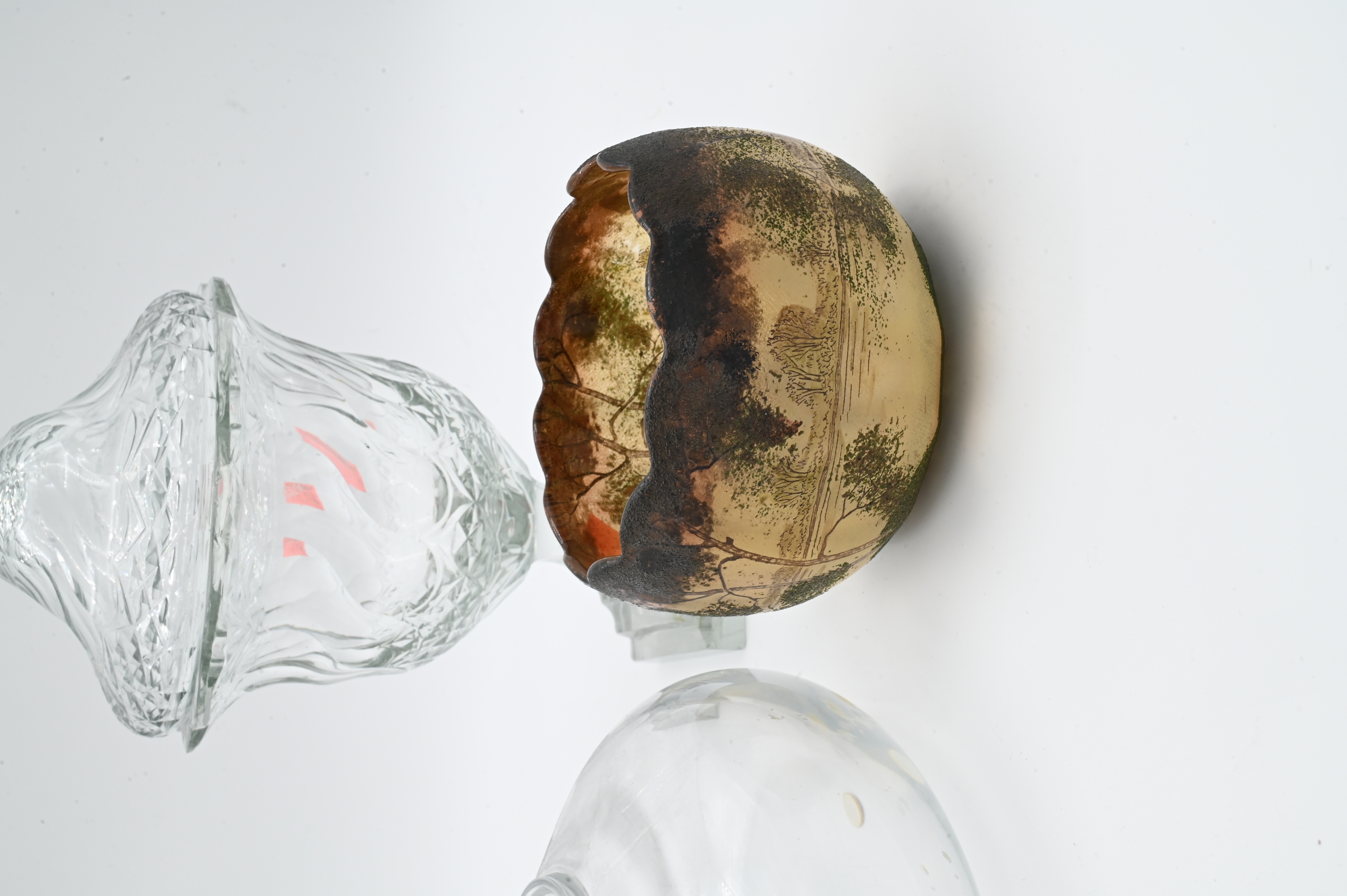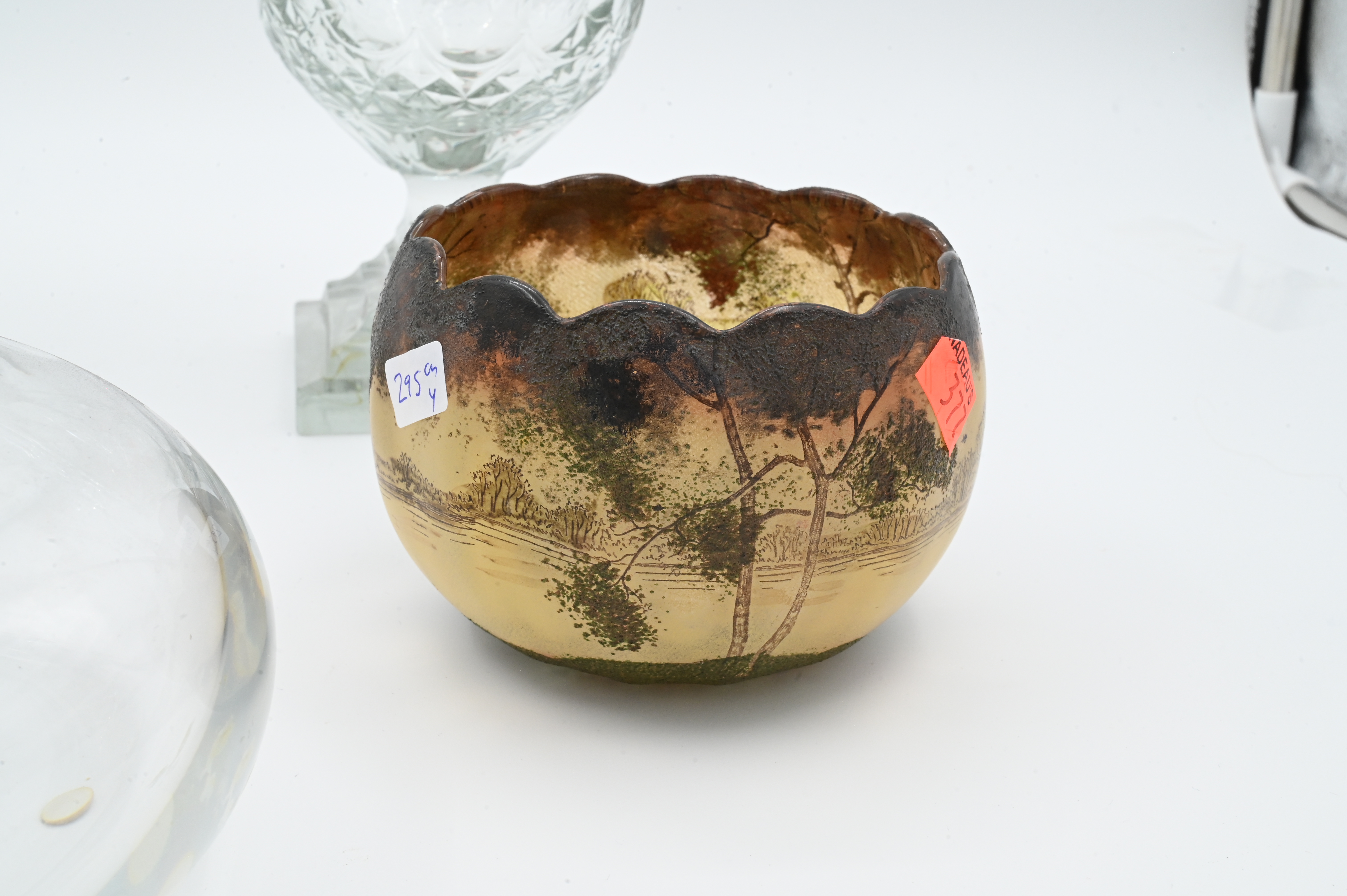 pair of cut crystal sweetmeat covered urns chip to bases of urns, Baccarat glass caviar server in two parts and marked, and cameo glass bowl having enamel and etched scene of trees and a lake with scallop rim