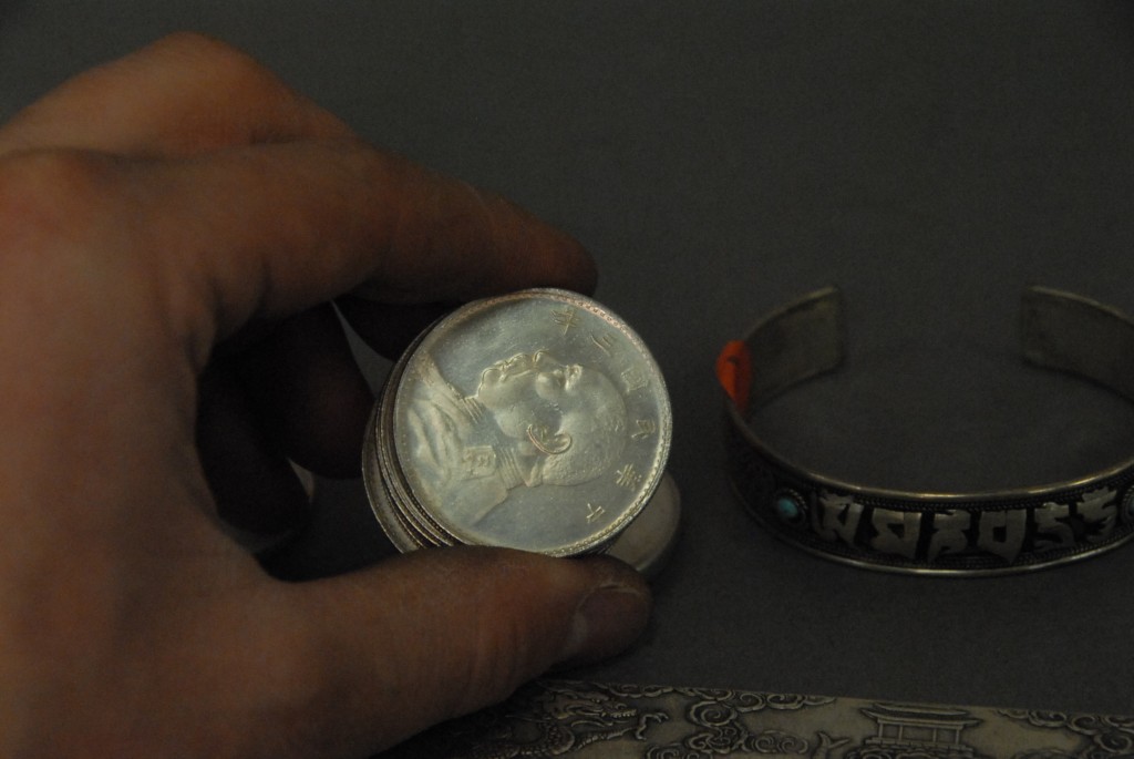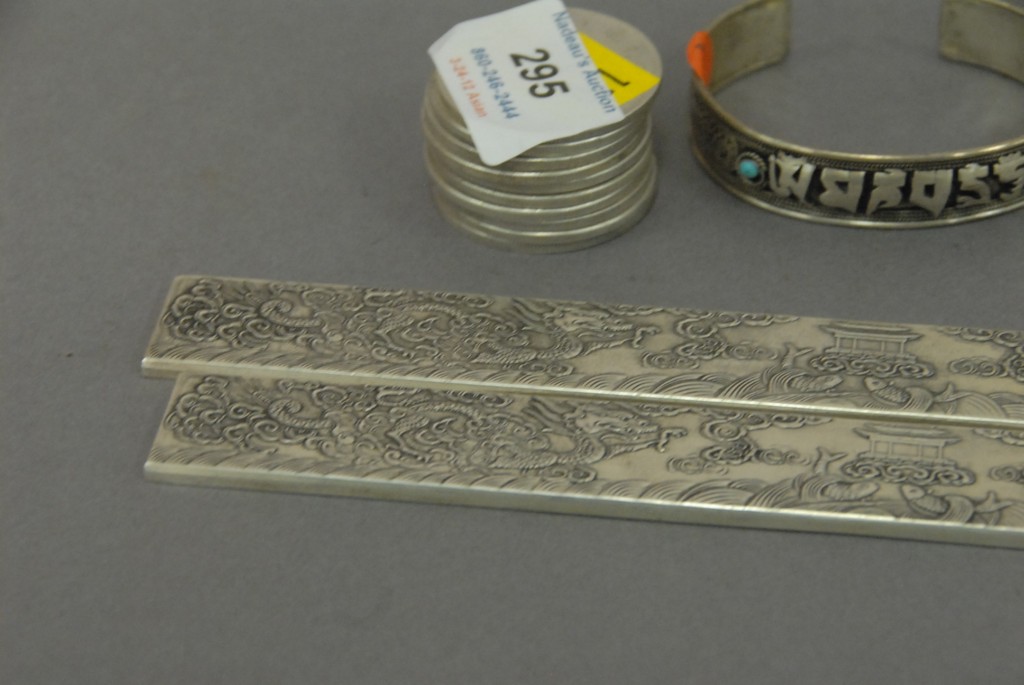 Fourteen piece lot pair of silver bracelets with turquois color beads, dia. 2 1/2, pair of silver Chinese paperweights with pagoda and dragons, lg. 9, and a Group of ten Chinese silver coins.