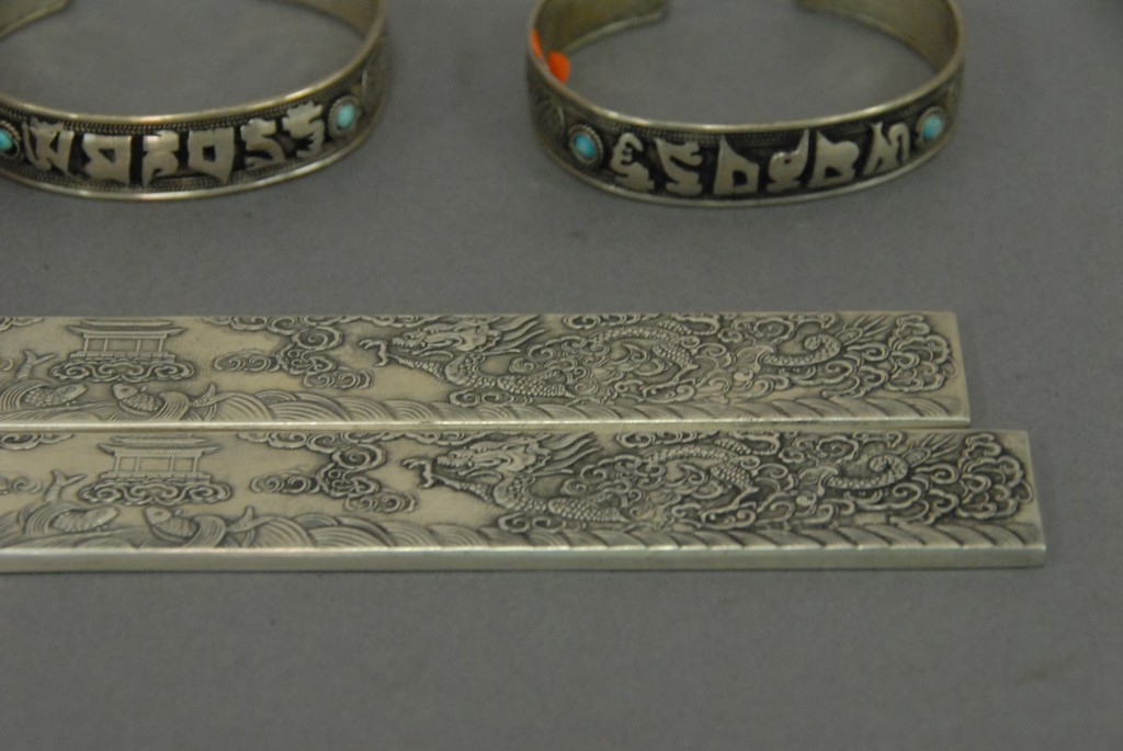 Lot 295: Fourteen piece lot pair of silver bracelets with turquois color beads, dia. 2 1/2, pair of silver Chinese paperweights with pagoda…