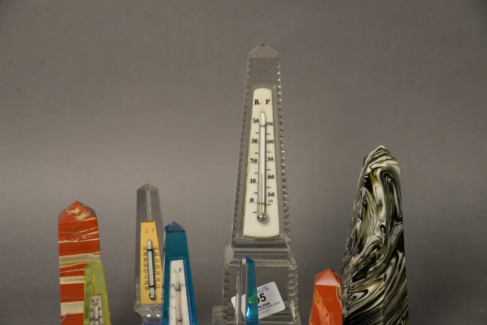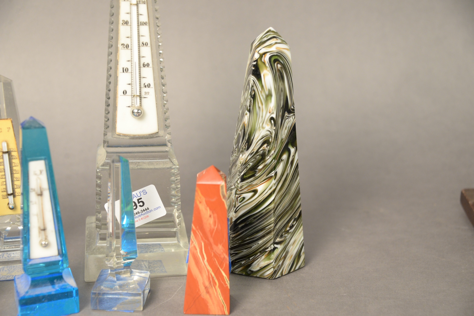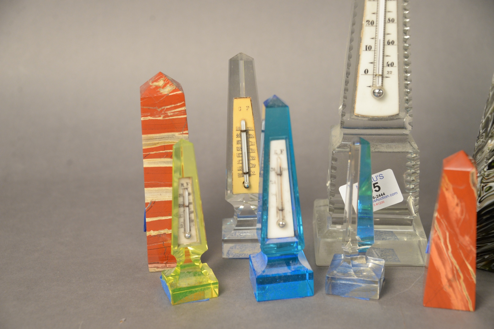 Lot 295: Group of Eight Marble and Crystal Obelisks and Thermometers, 19th century or later, tallest height 10 1/2 inches.