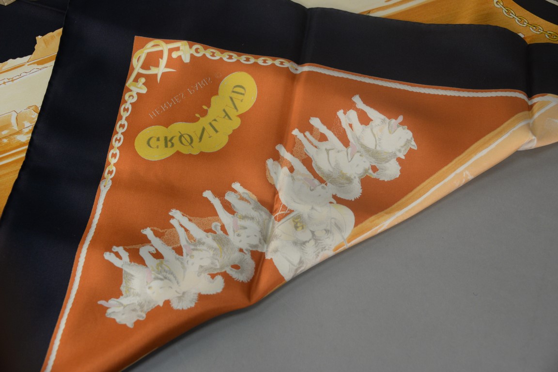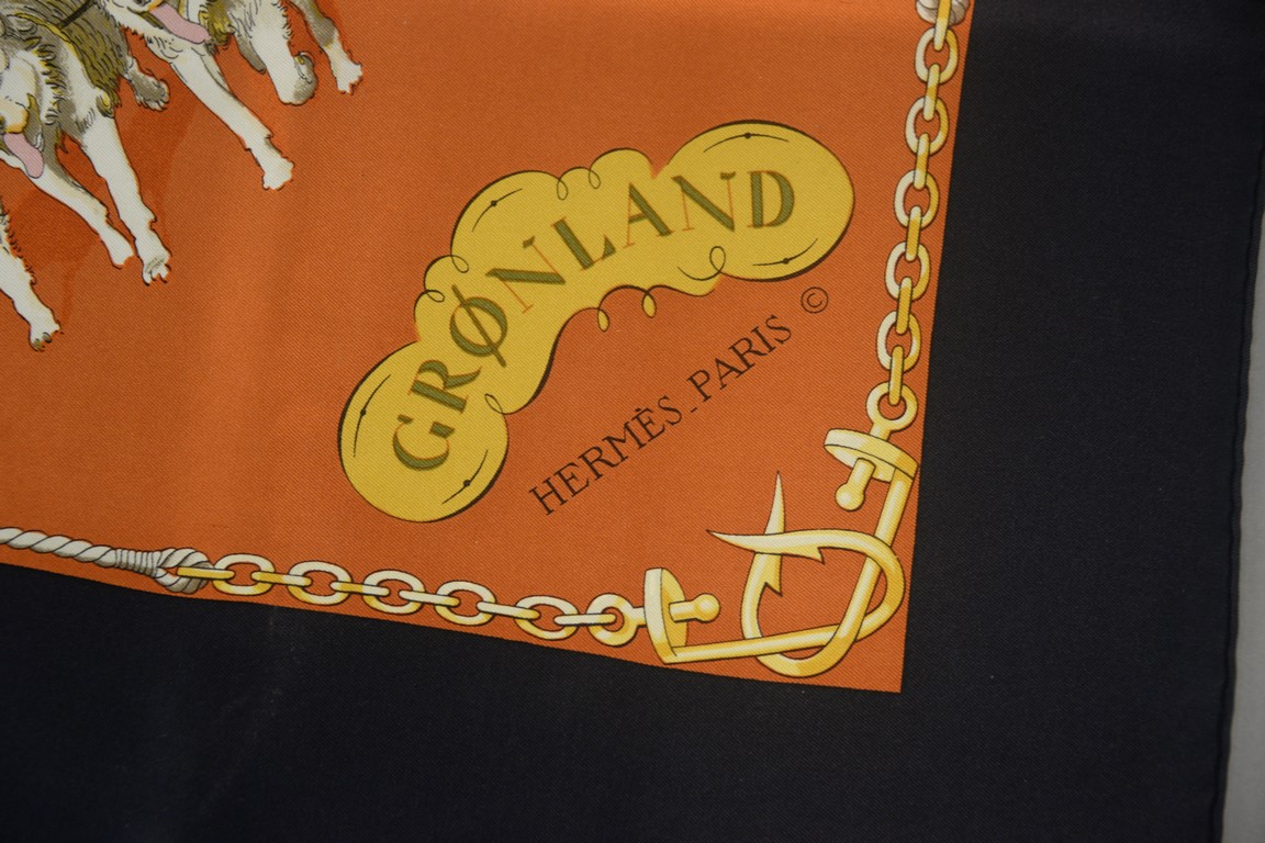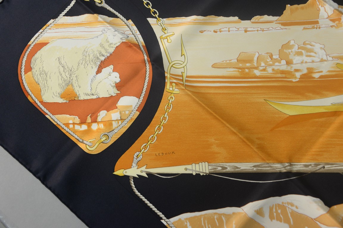 Lot 295: Hermes Paris silk scarf Gronland by Philippe Ledoux, black and tan colors. 34 x 35