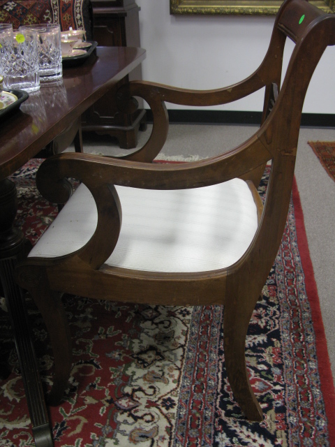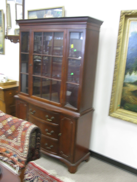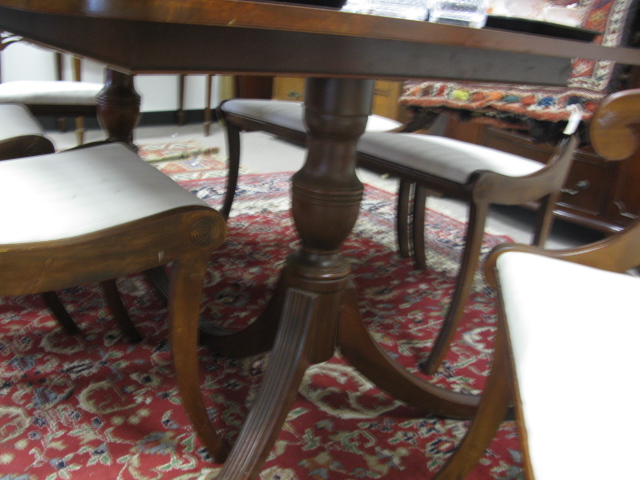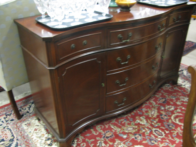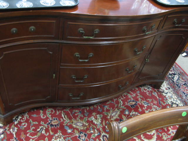 Nine piece mahogany dining room set breakfront, table with leaves, 6 chairs and credenza.
