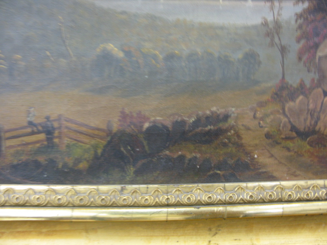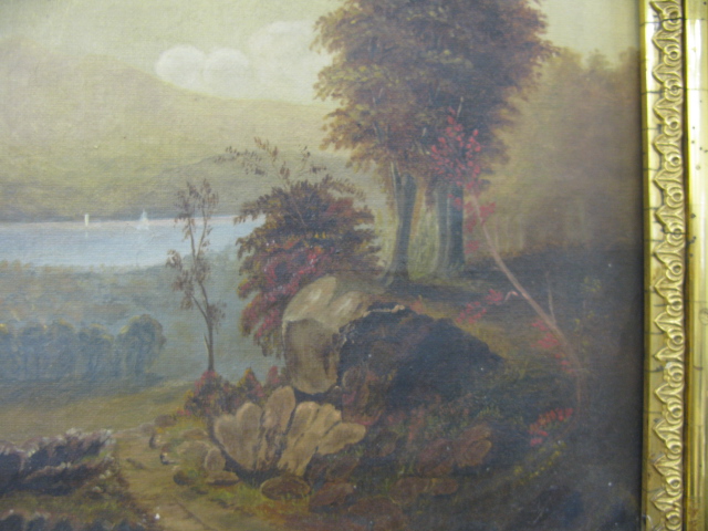 Oil on canvas landscape with lake in background Hudson River School style in Victorian gilt frame
