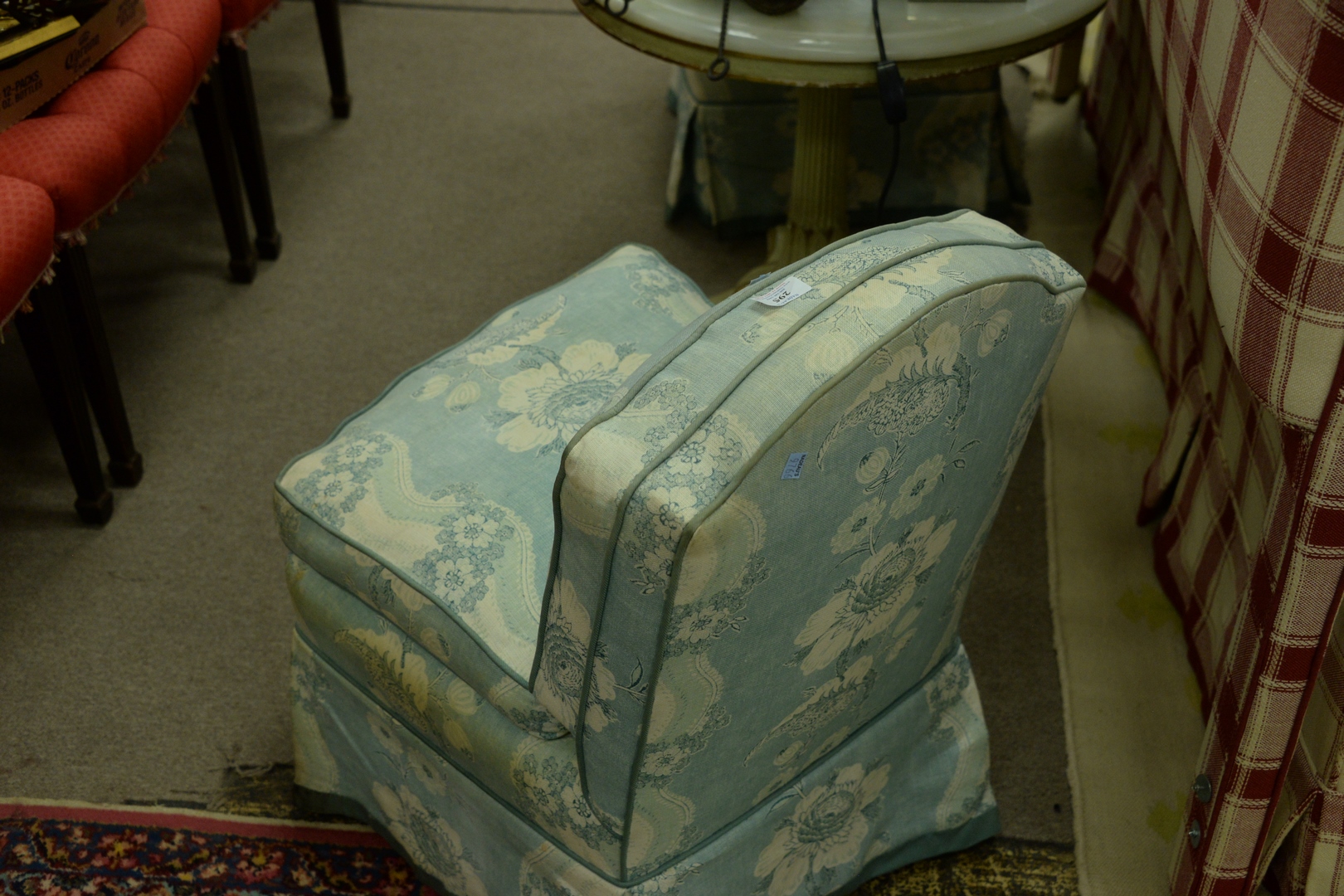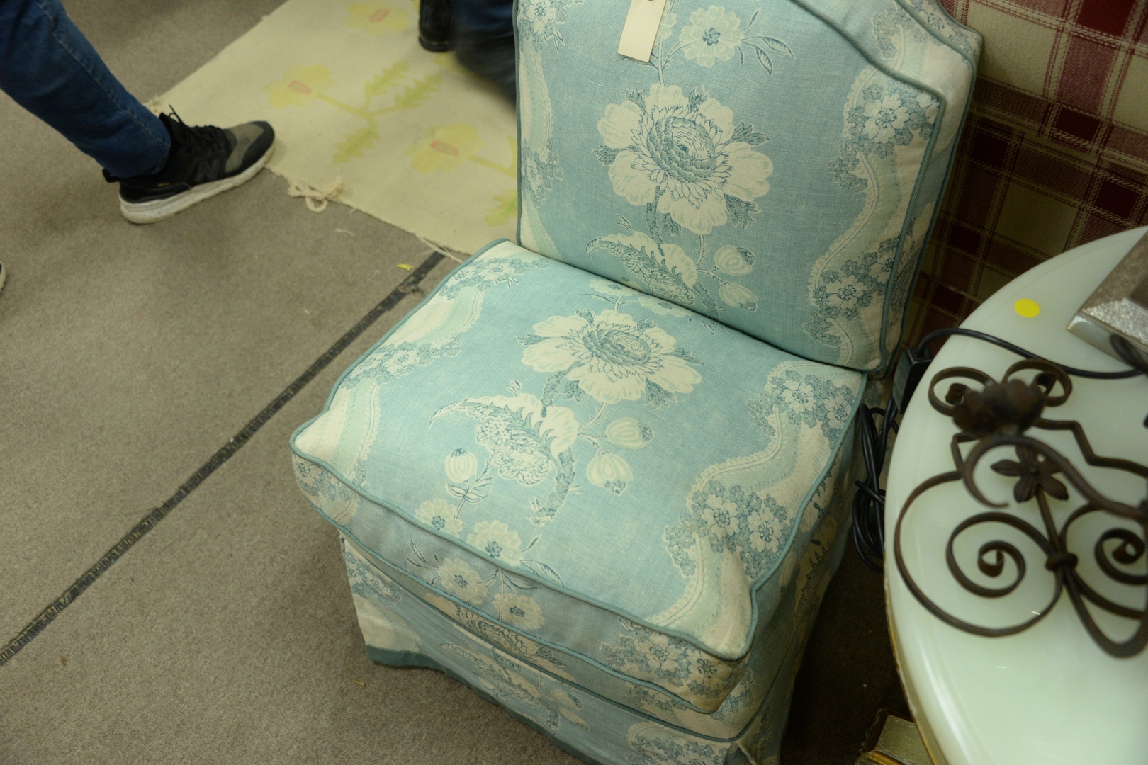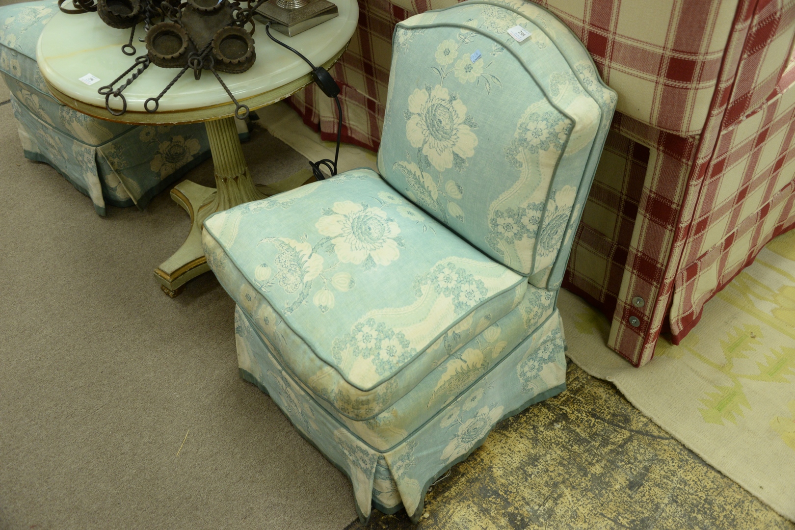 Pair Custom Upholstered Side Chairs, one cushion front soiled, height 30 inches.