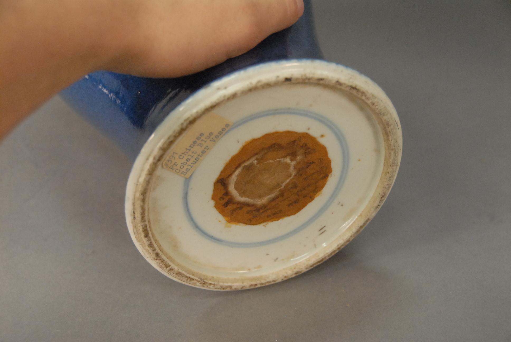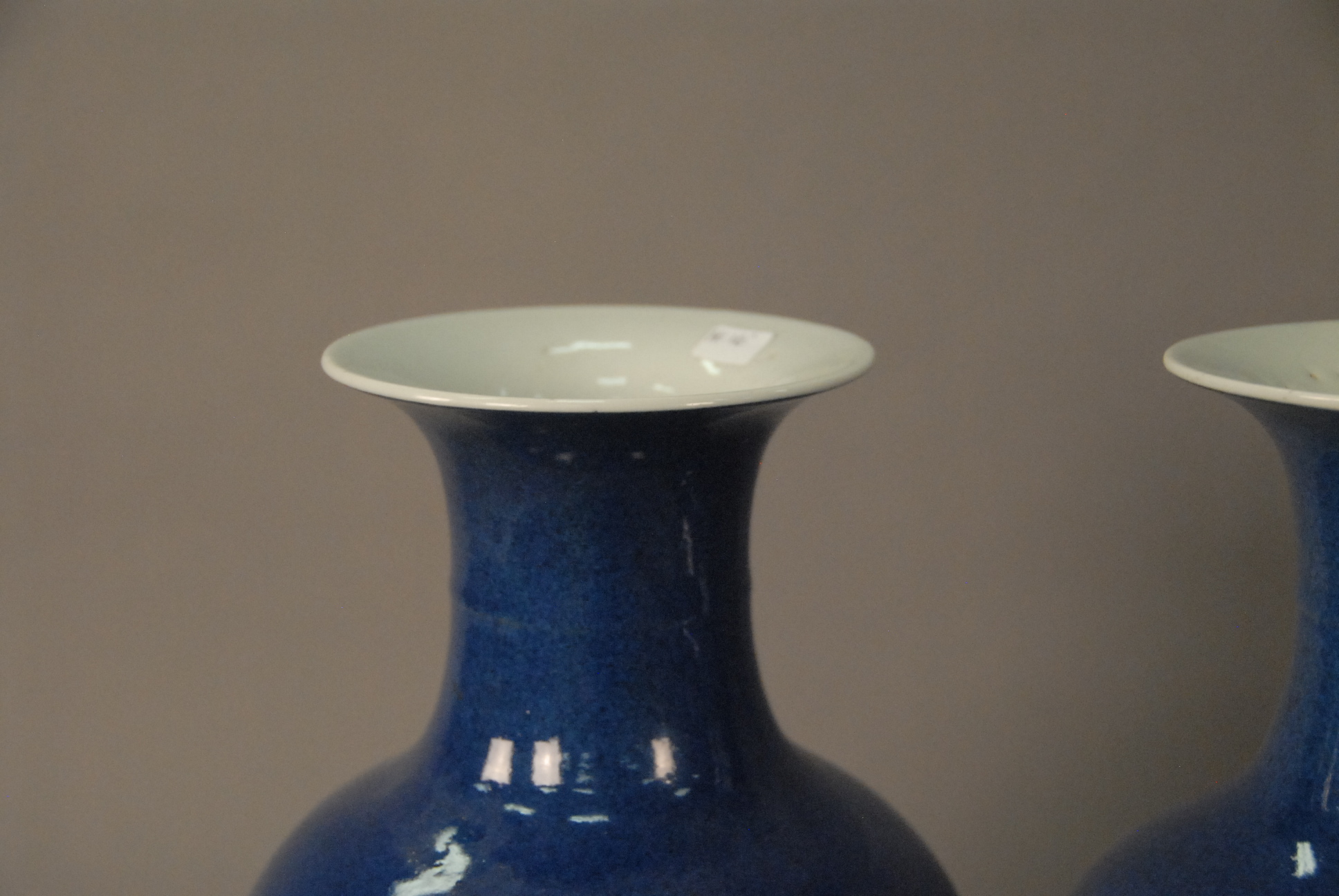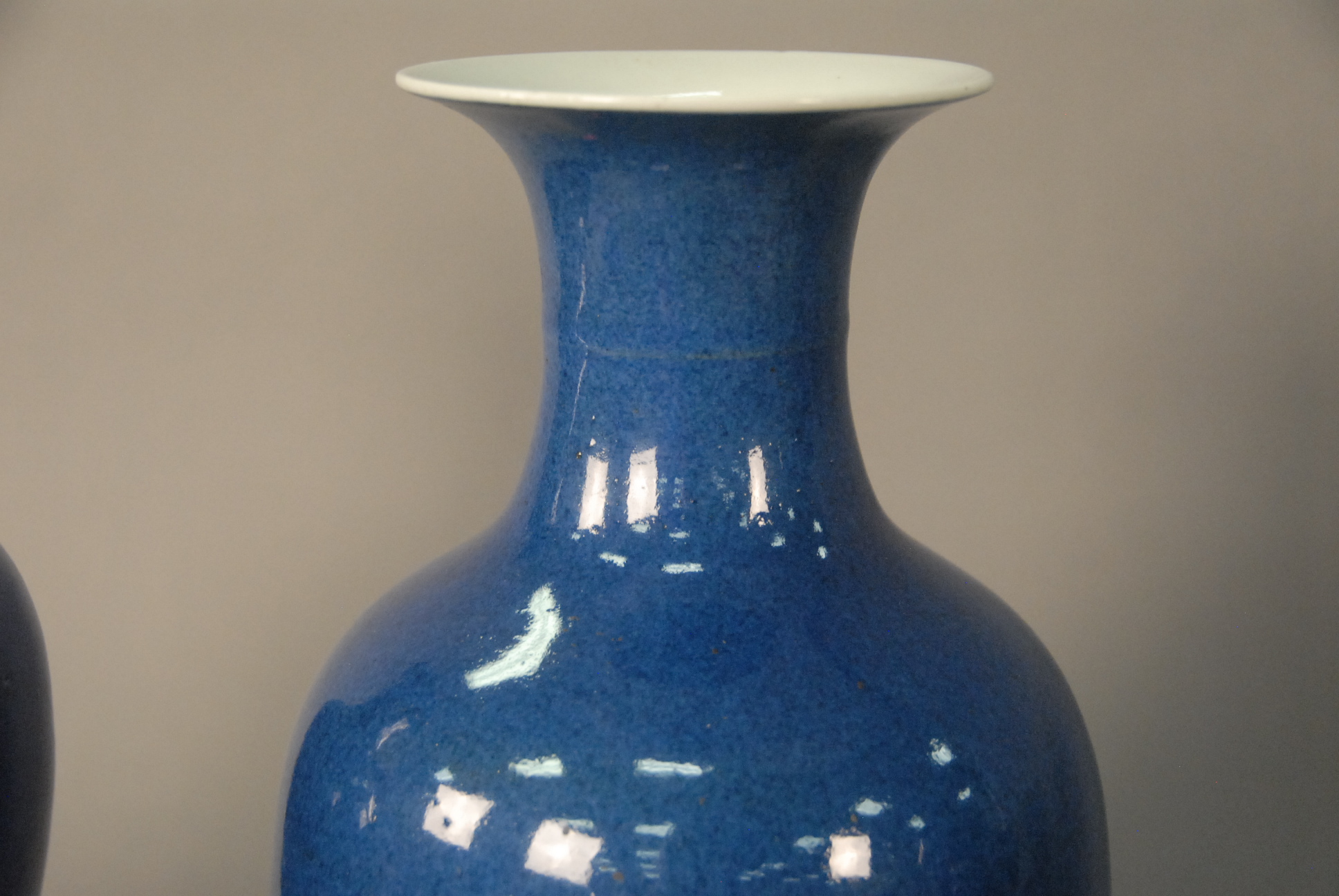 Lot 295: Pair of 19th century Chinese blue glaze baluster vases with old paper label and double blue circles on base. ht. 16 in.