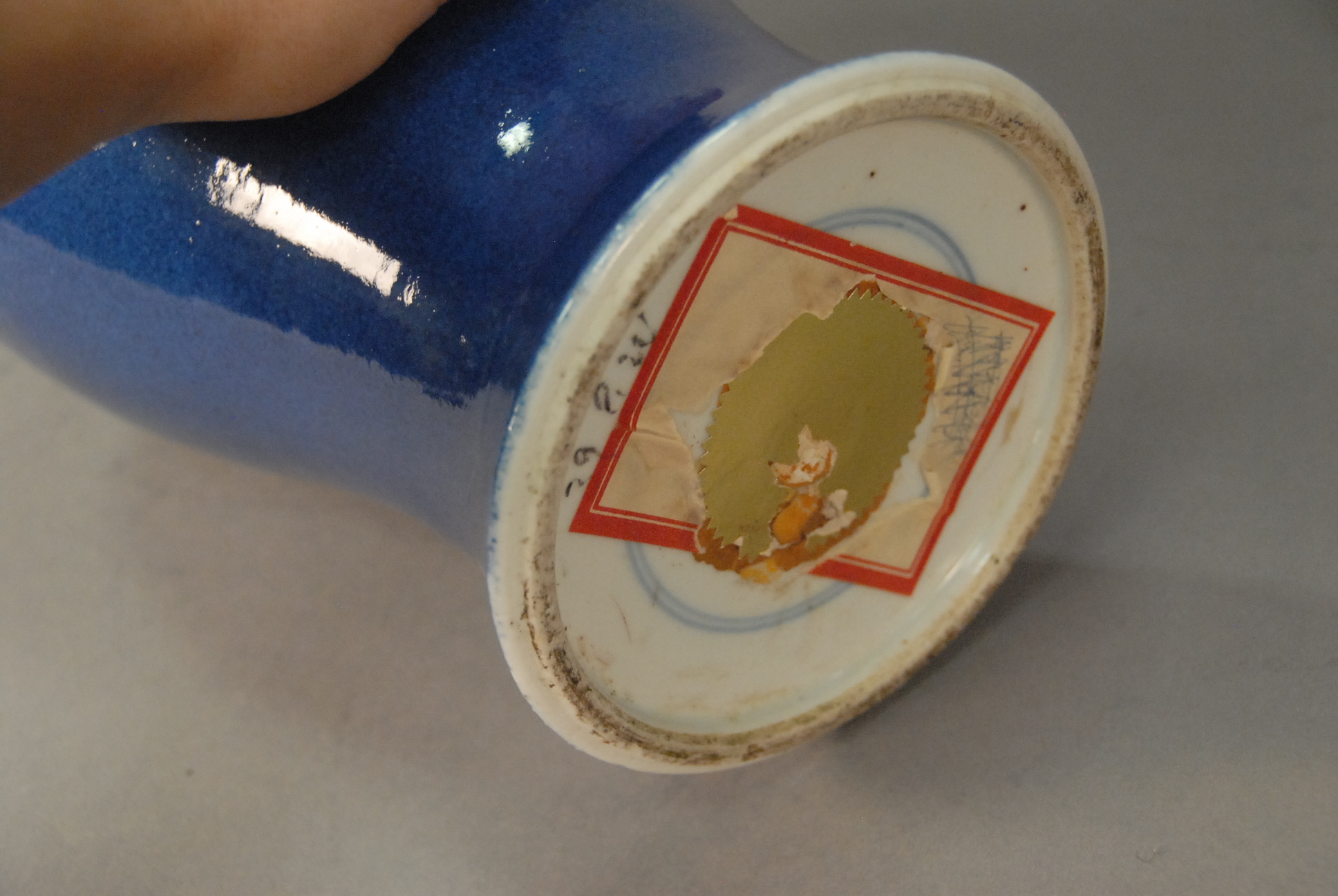 Pair of 19th century Chinese blue glaze baluster vases with old paper label and double blue circles on base. ht. 16 in.