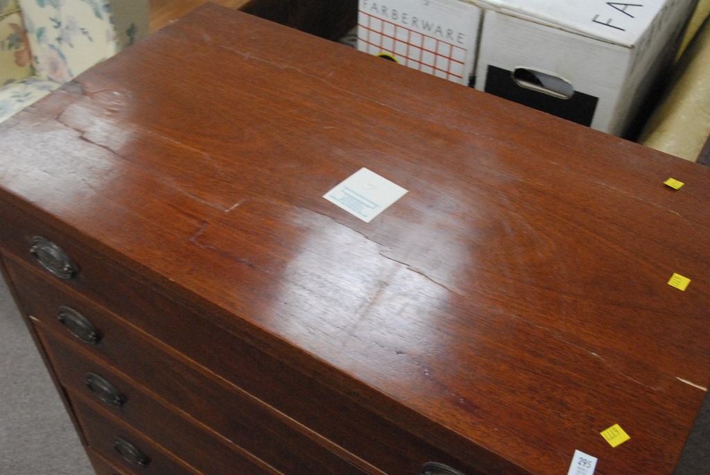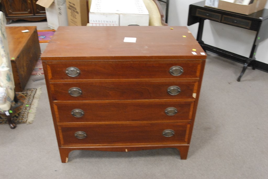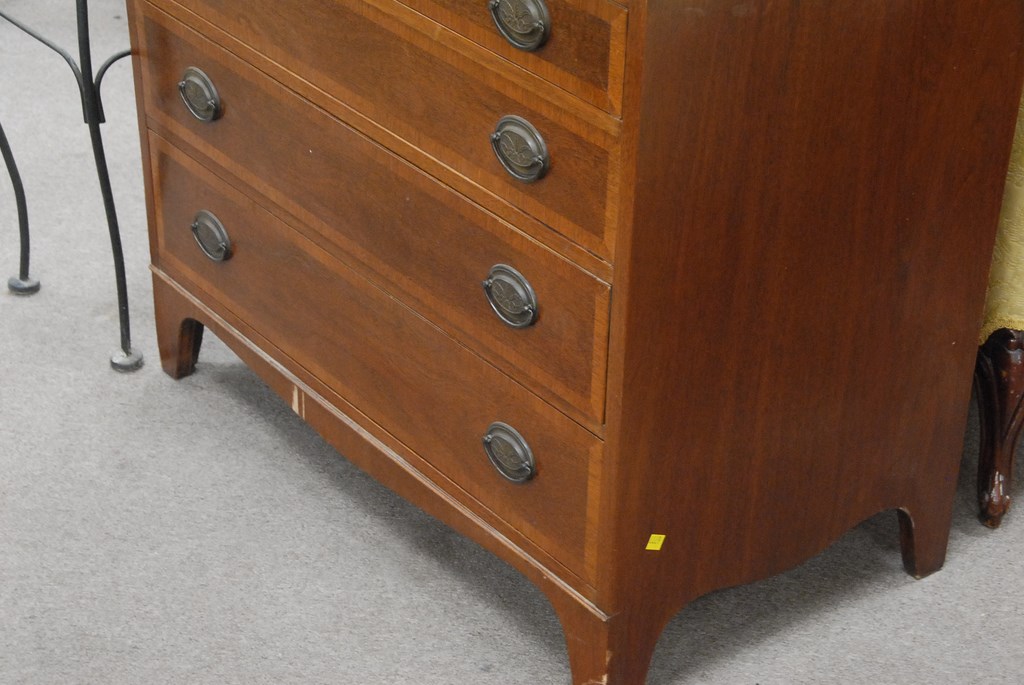 Lot 295: Pair of mahogany four drawer chests with banded inlaid drawers with small veneer chips, wd. 36 in. ht. 33 in.