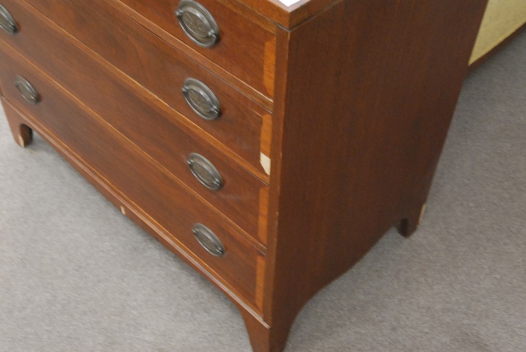 Pair of mahogany four drawer chests with banded inlaid drawers with small veneer chips, wd. 36 in. ht. 33 in.