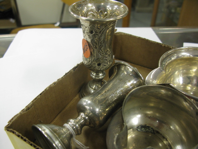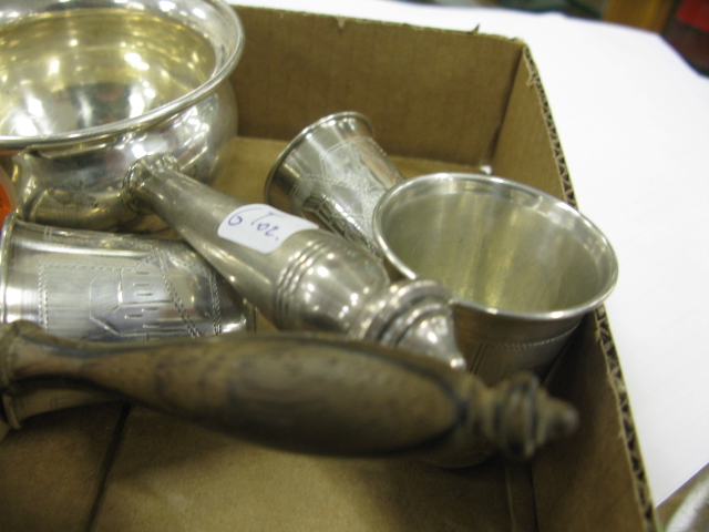 Seven piece lot, two sterling silver pots, one with a wooden handle, three shot glasses and two cordials in Sterling.