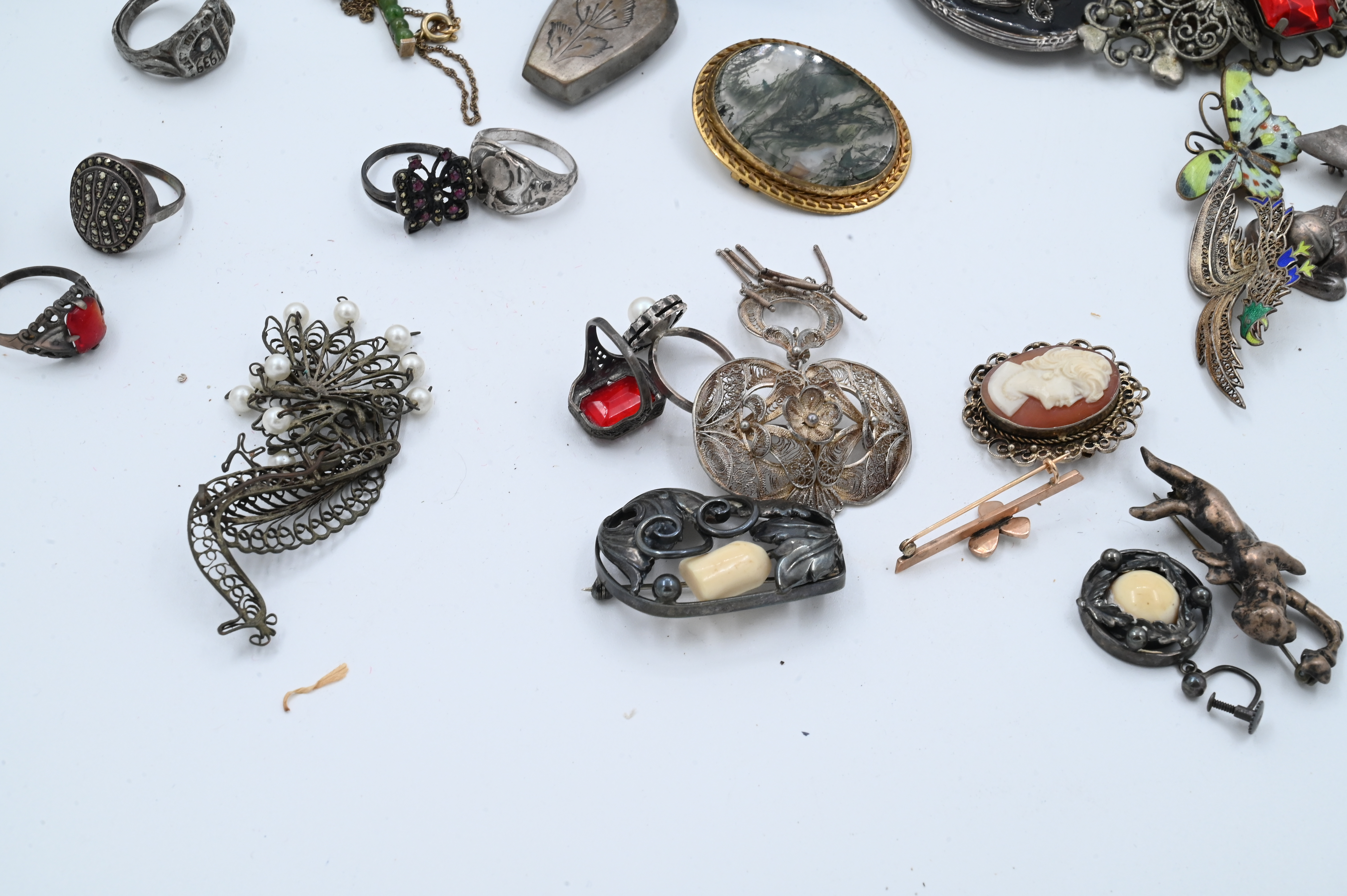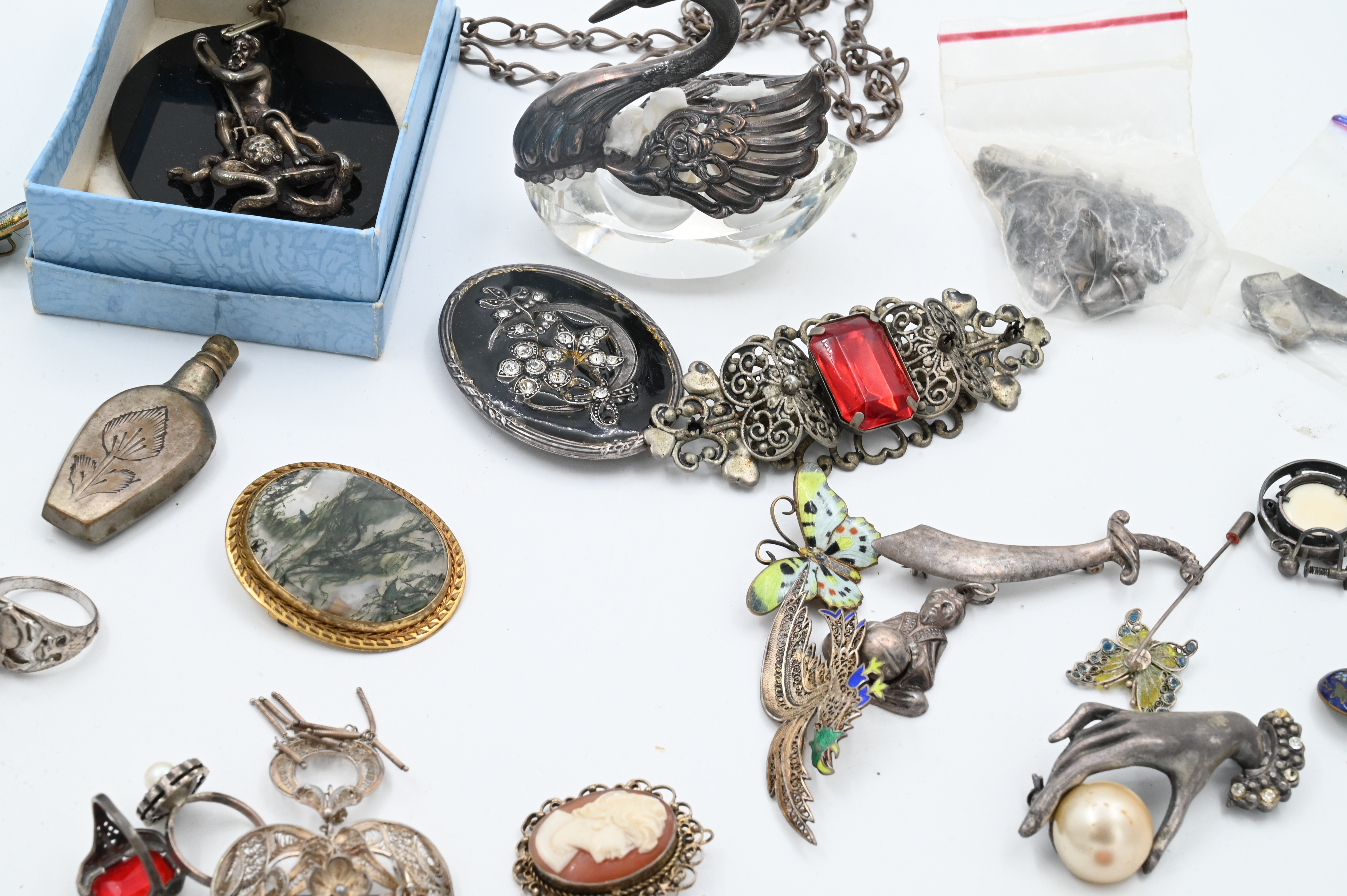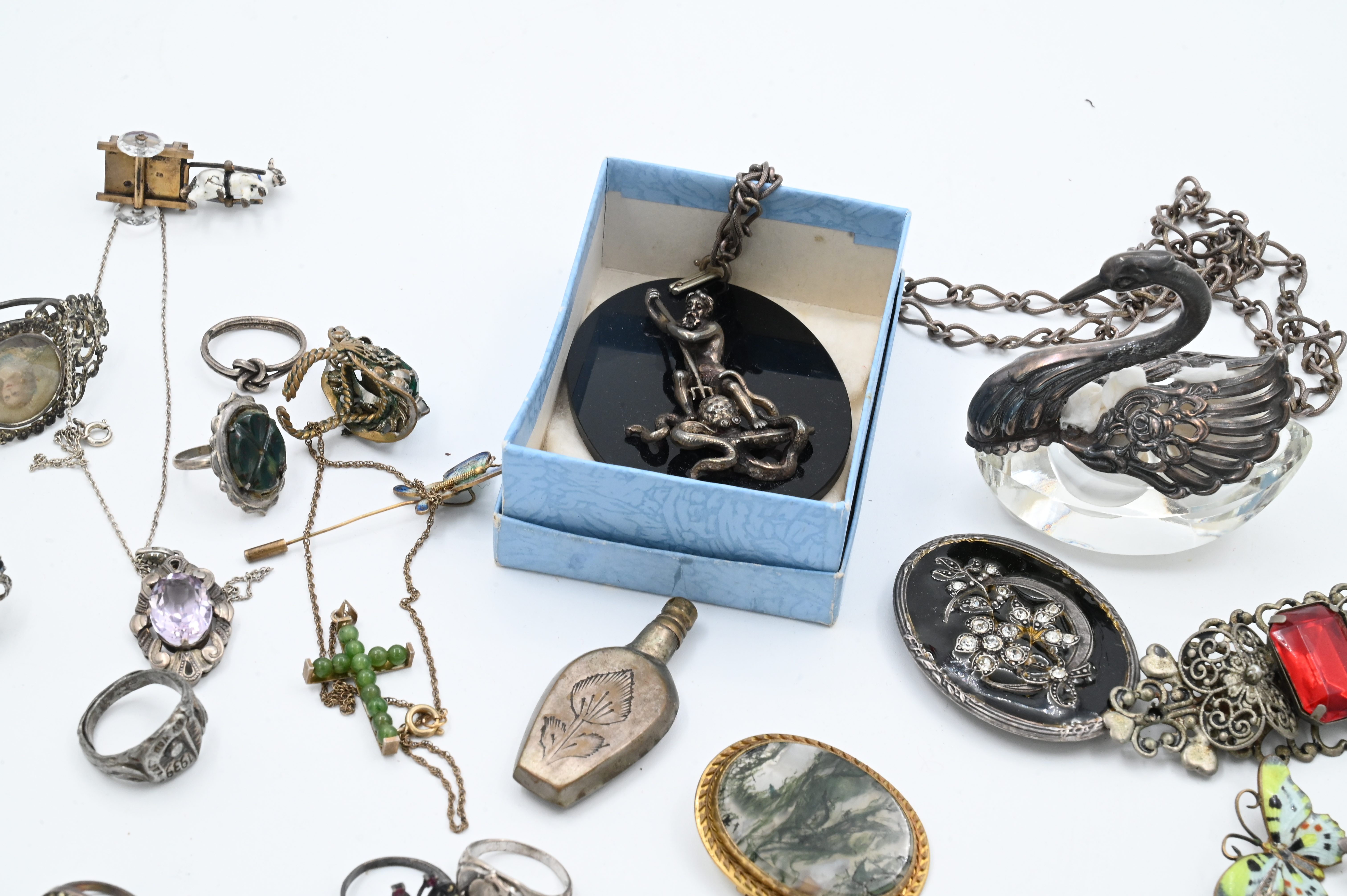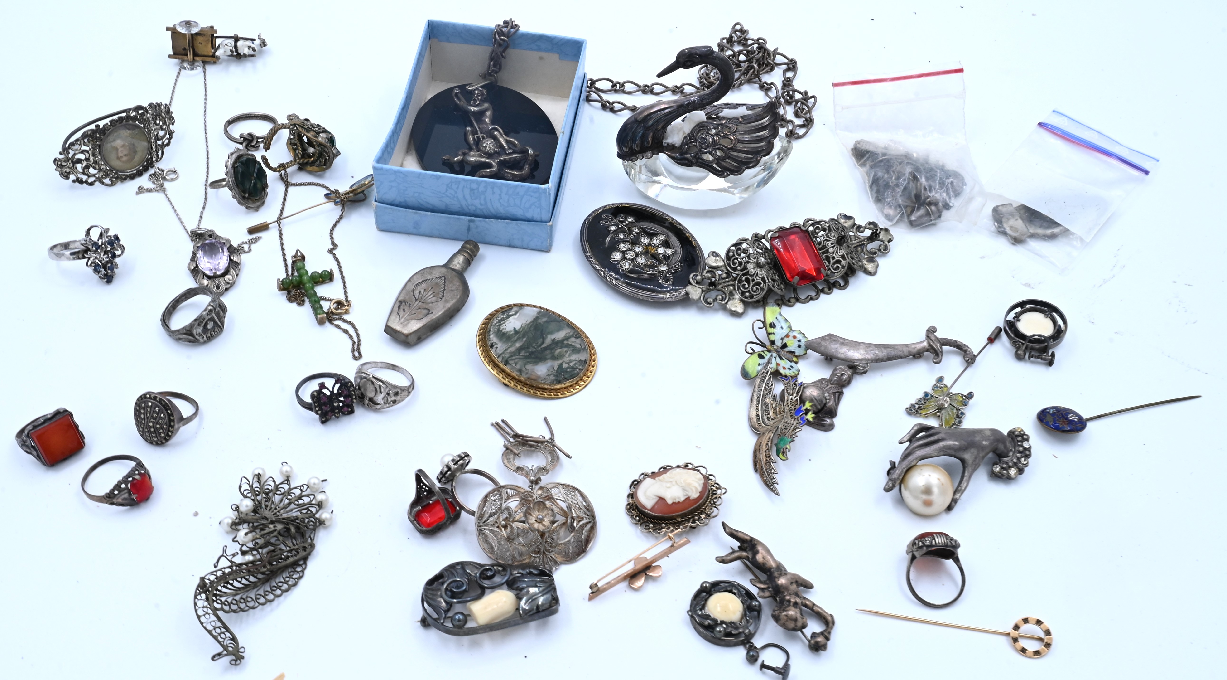 to include moss agate pin, silver overlay perfume bottle, snuff bottle, rings