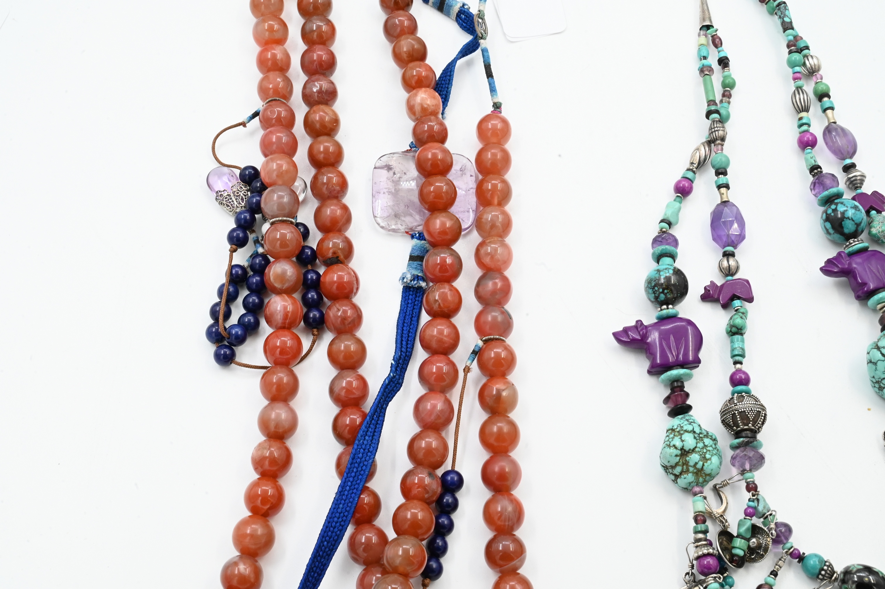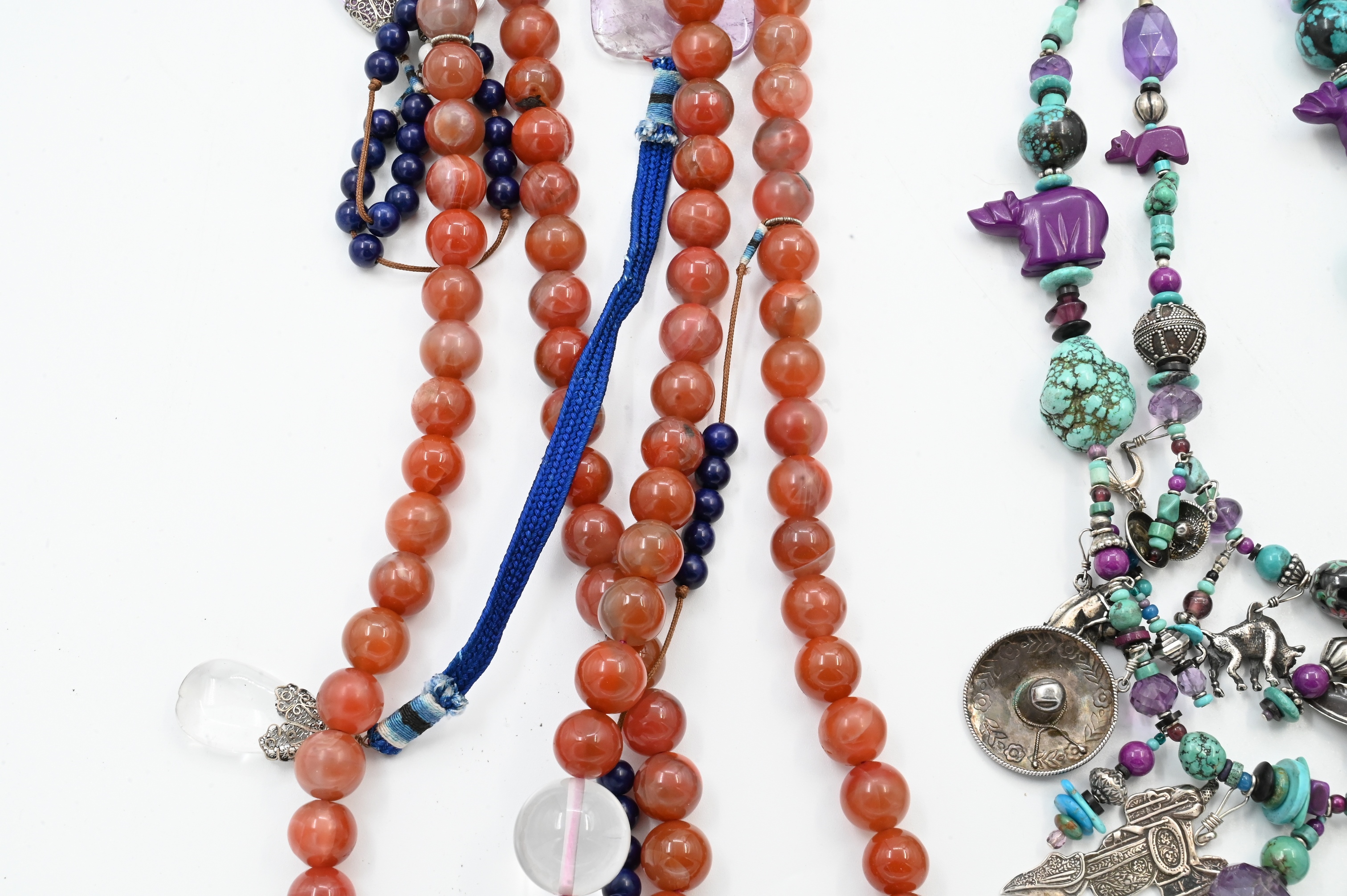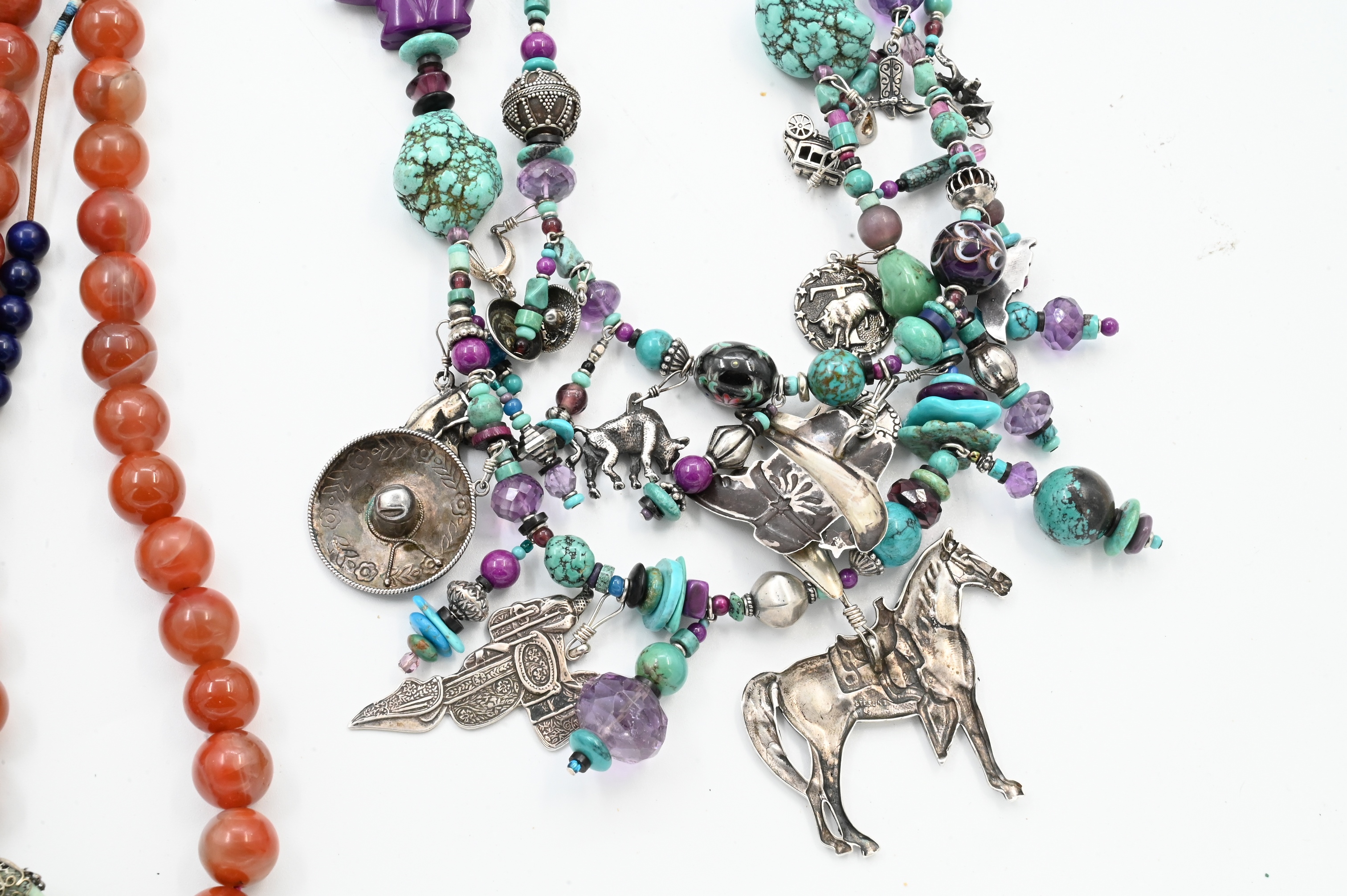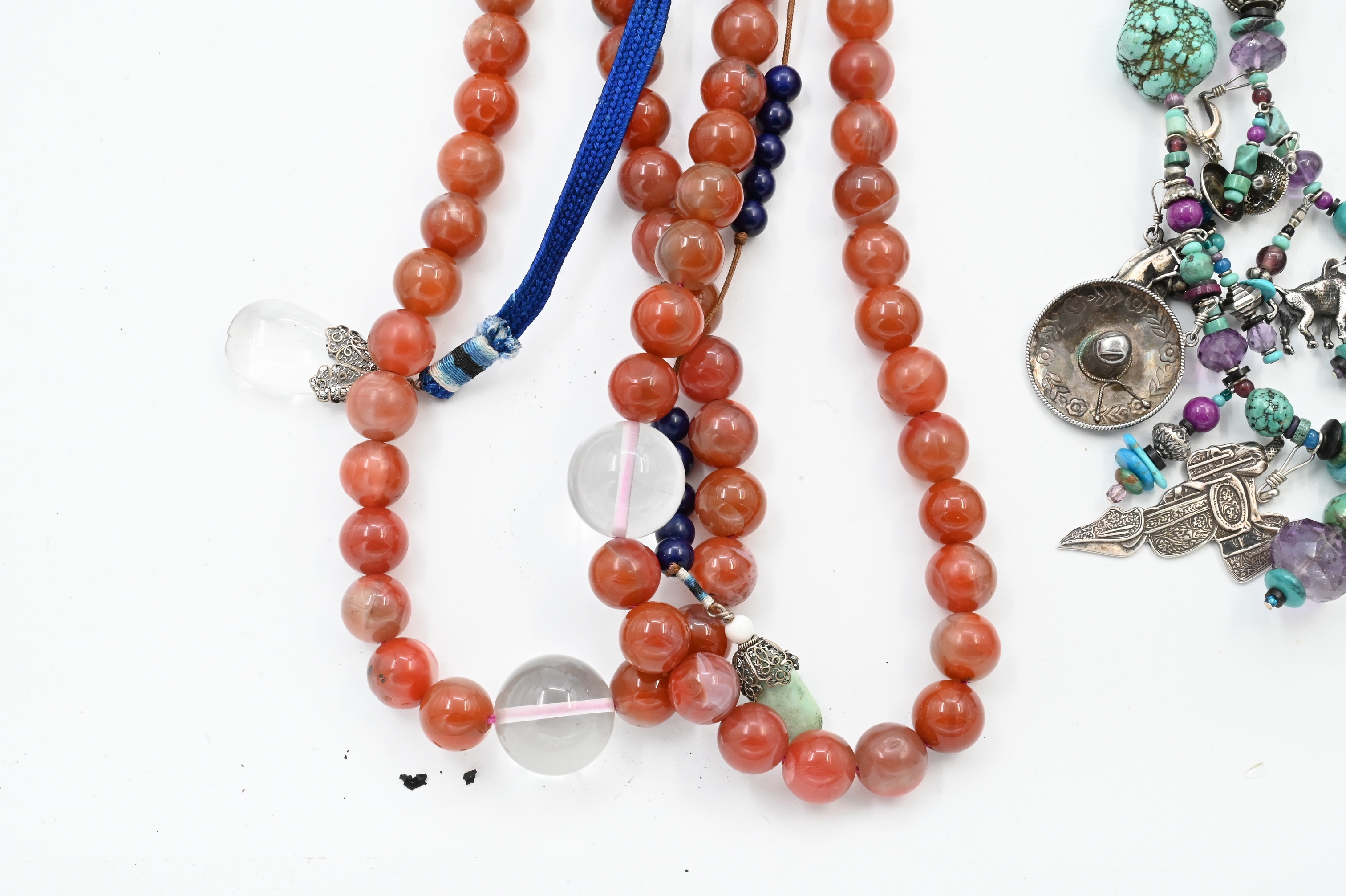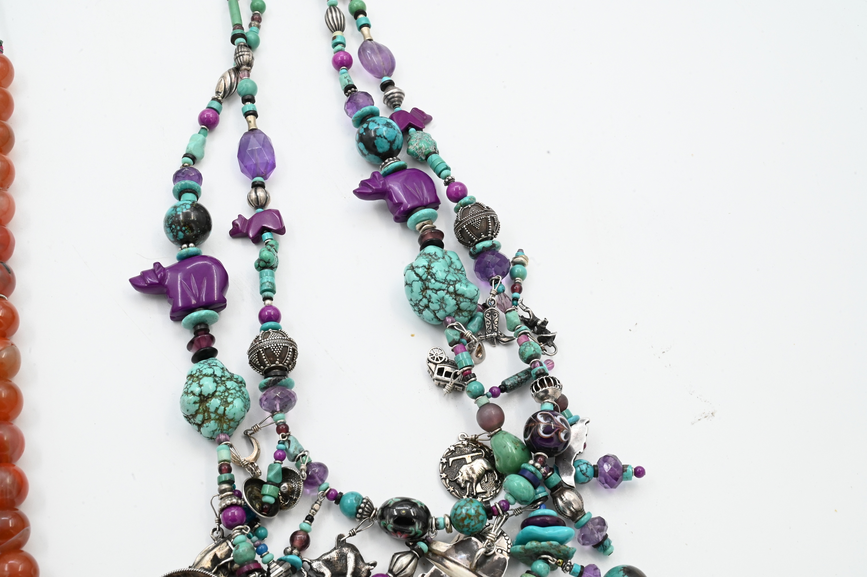 antique Mandarin ancestors necklace having carnelian, glass, and turquoise beads, along with a charm necklace having silver charms, turquoise enamel beads, etcetera