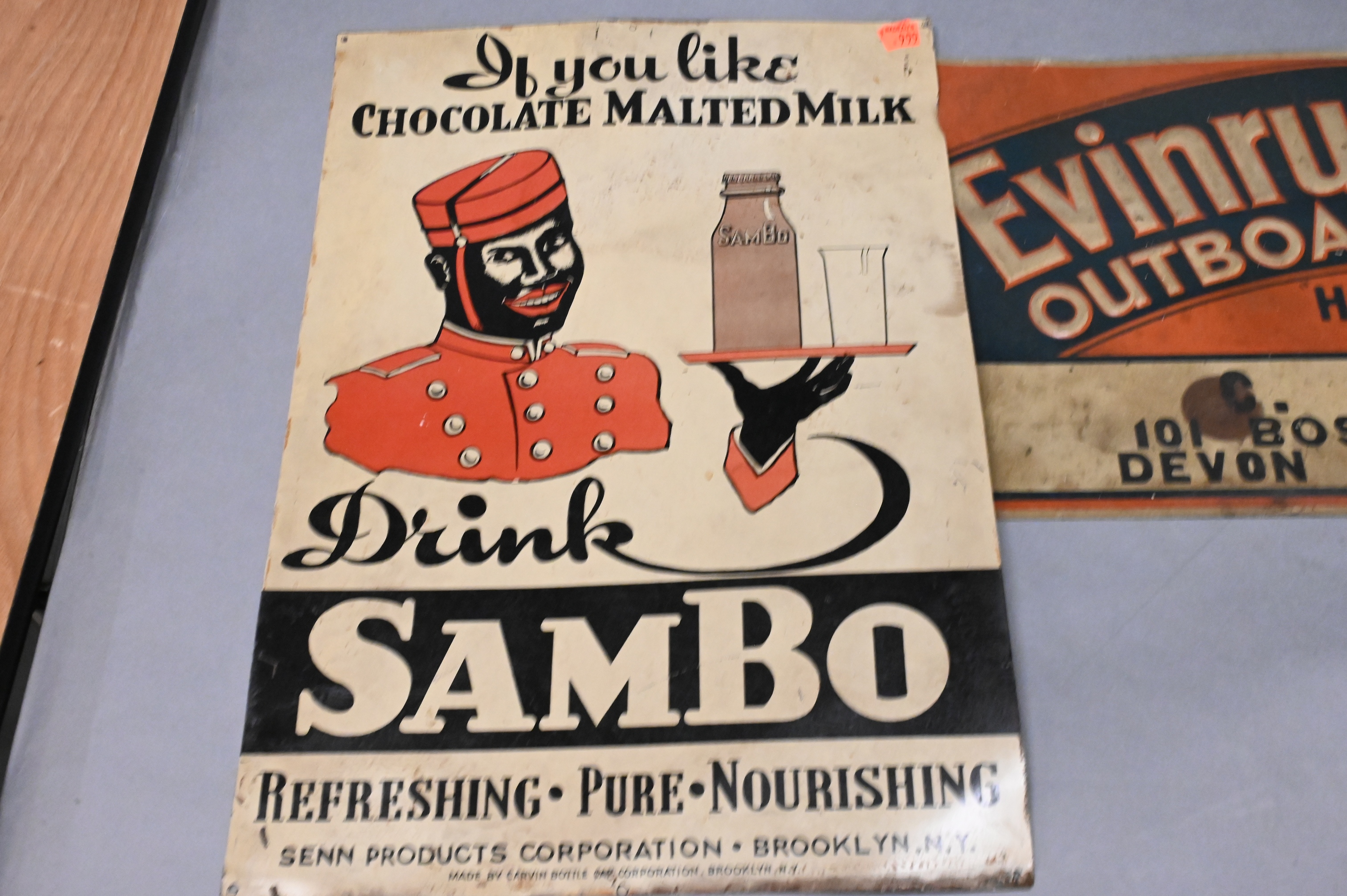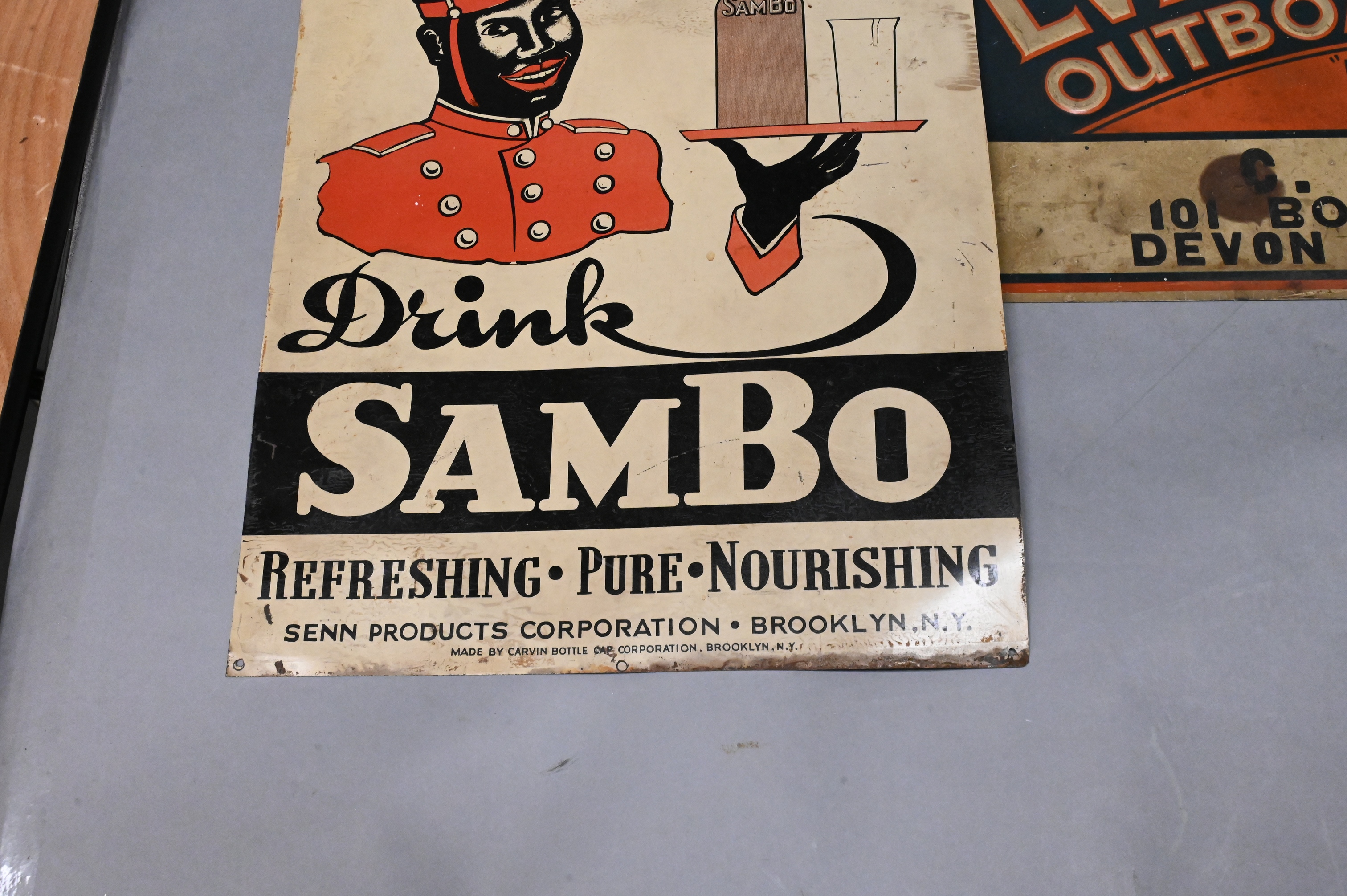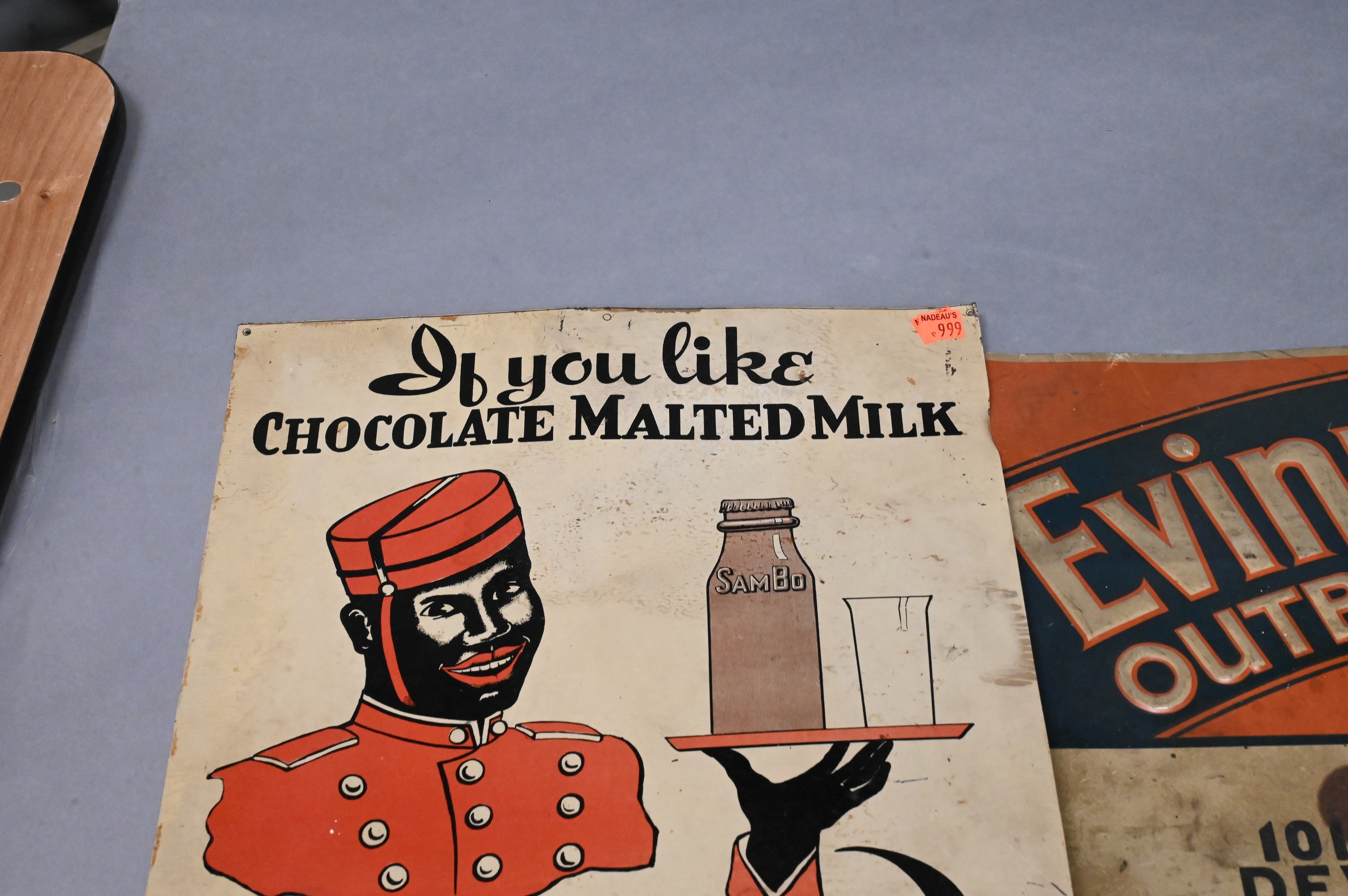 Evinrude and Elto Outboard Motors sign with raised letters and Sambo Chocolate Malted Milk sign