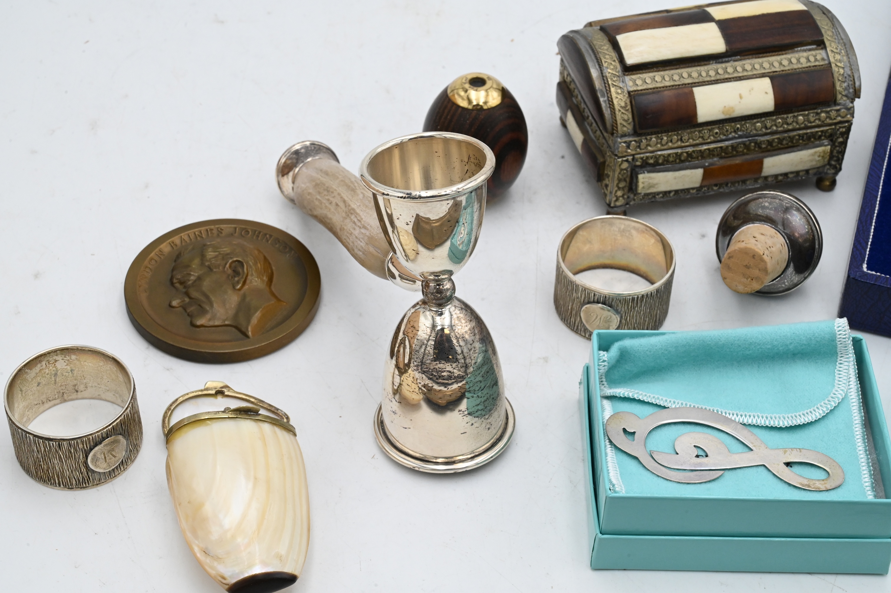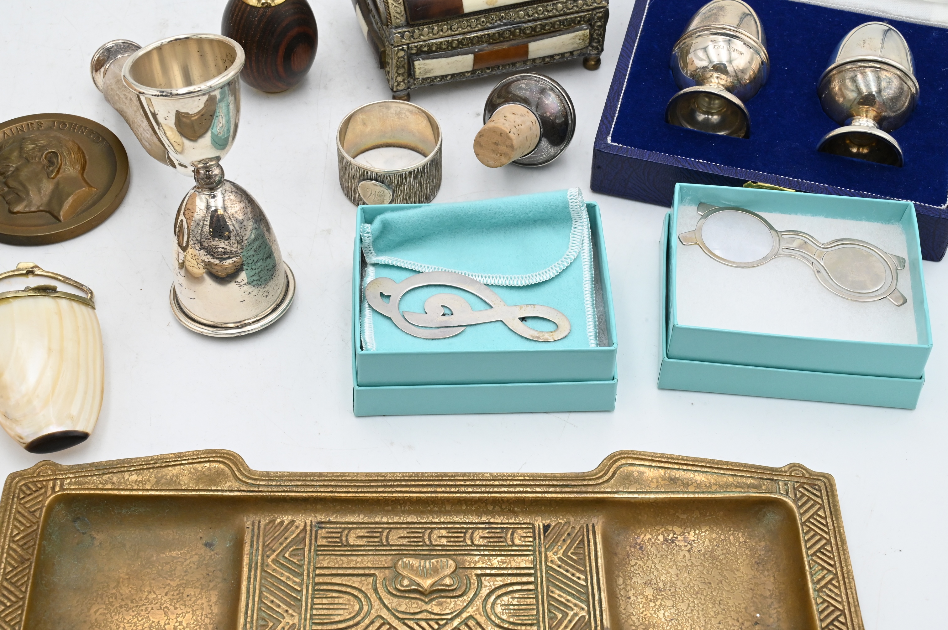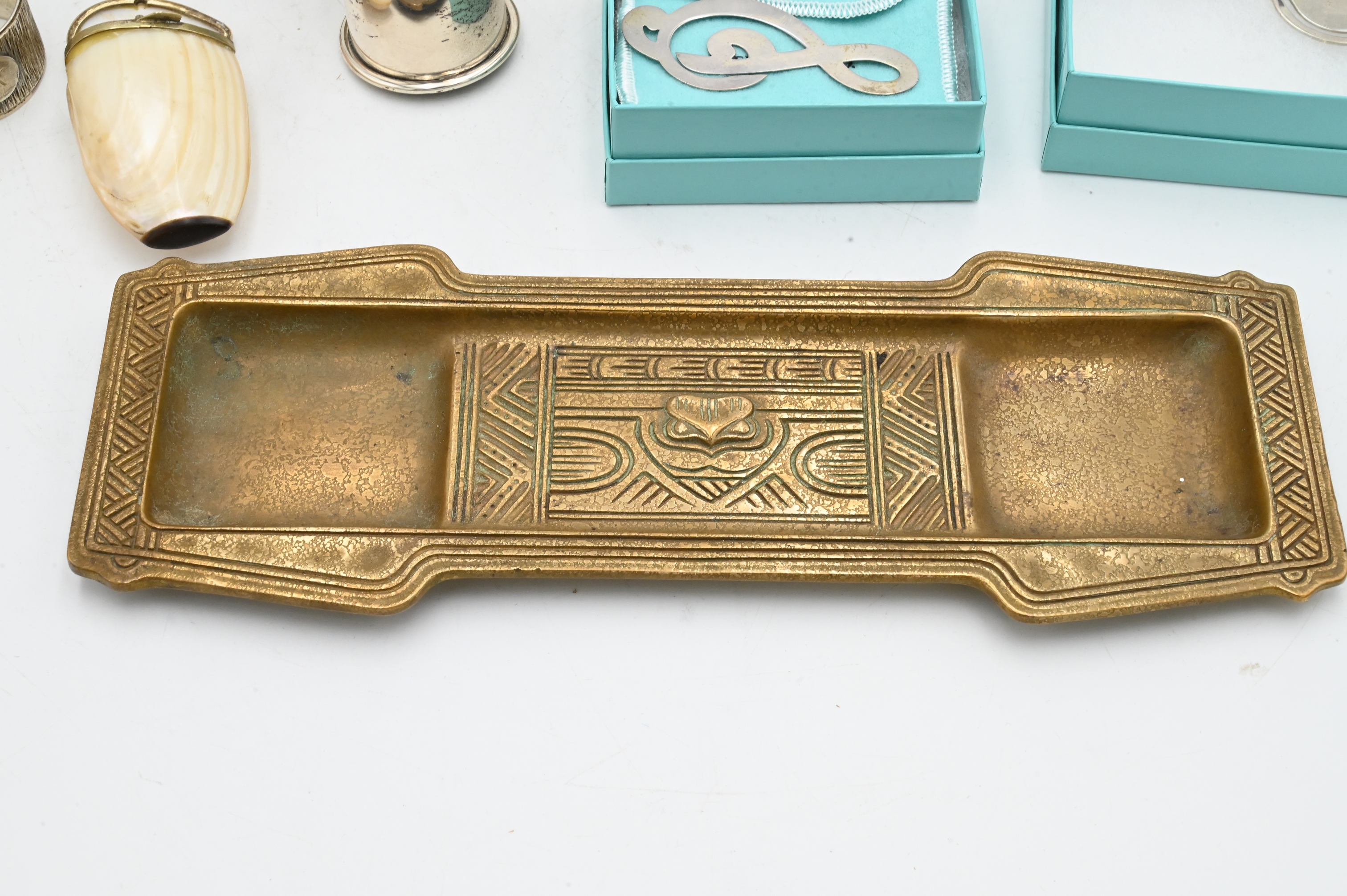 to include bronze Tiffany desk pen holder, Tiffany Logo Loup bookmark, paperclip marked Tiffany and Company 925 in original box, Tiffany treble clef sterling silver paper clip in fitted box and bag, shell box, horn box, sterling horn drink mixer, silver bottle stopper with bird, pair of silver napkin rings, salt and pepper shaker