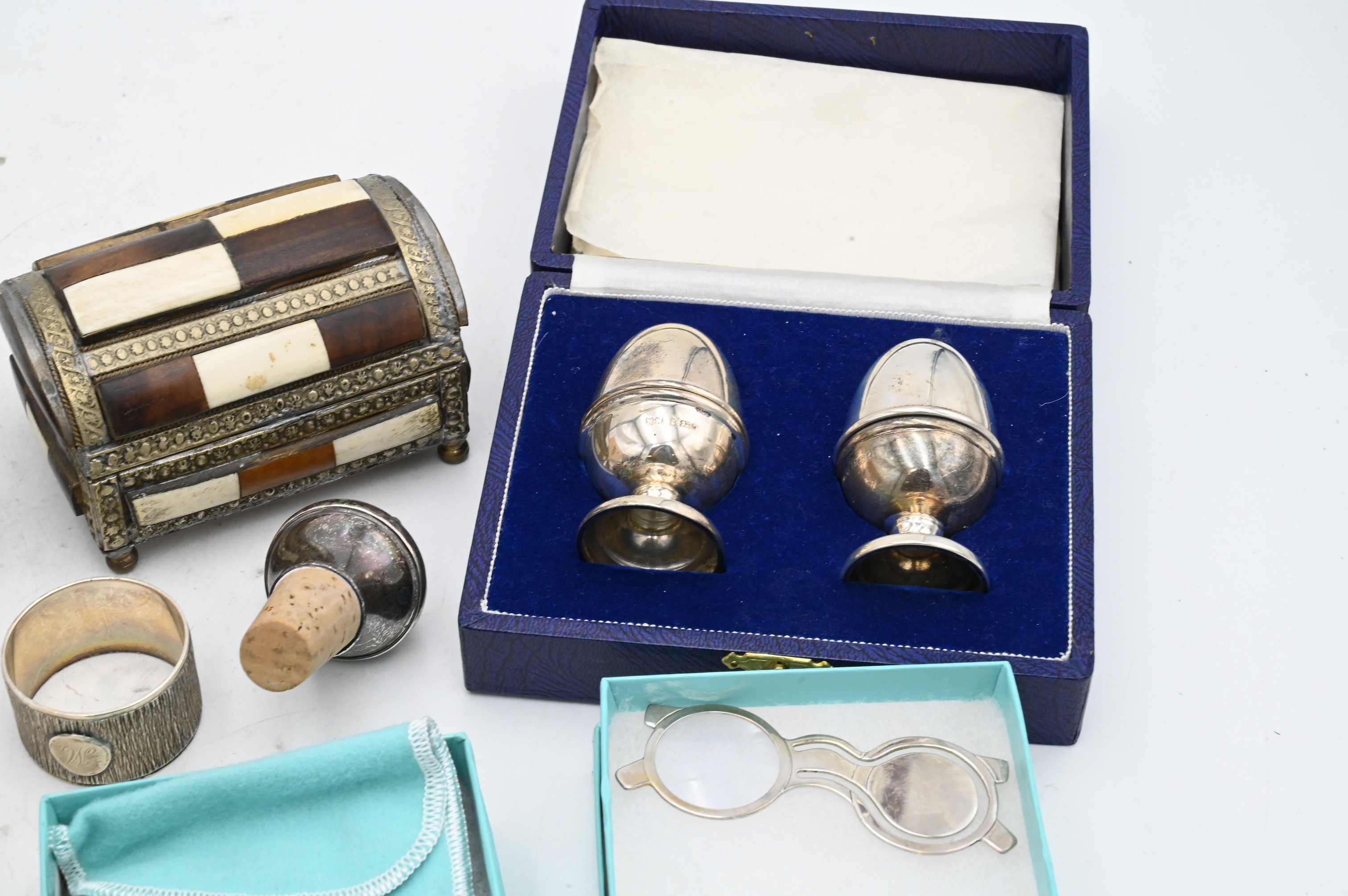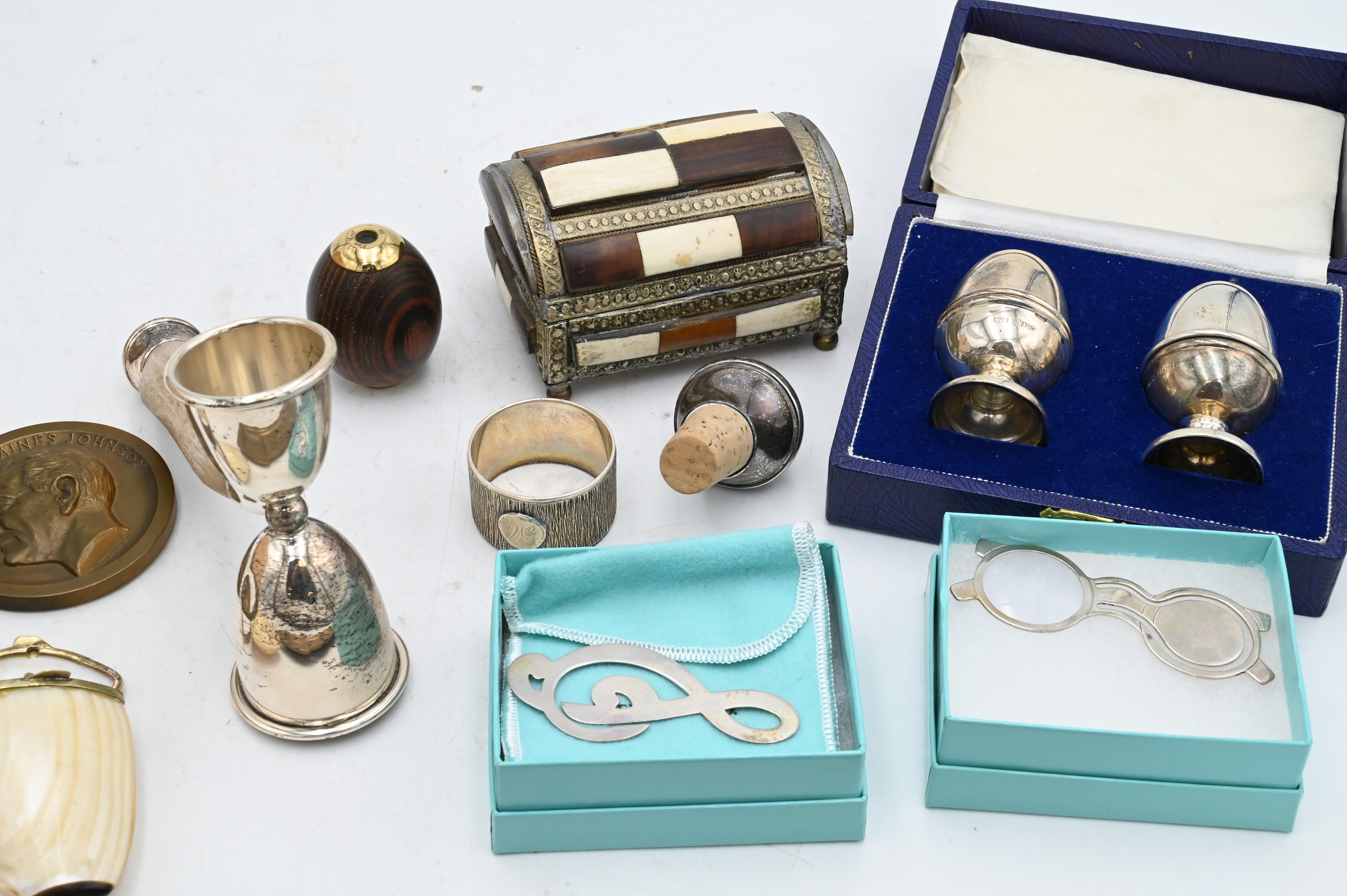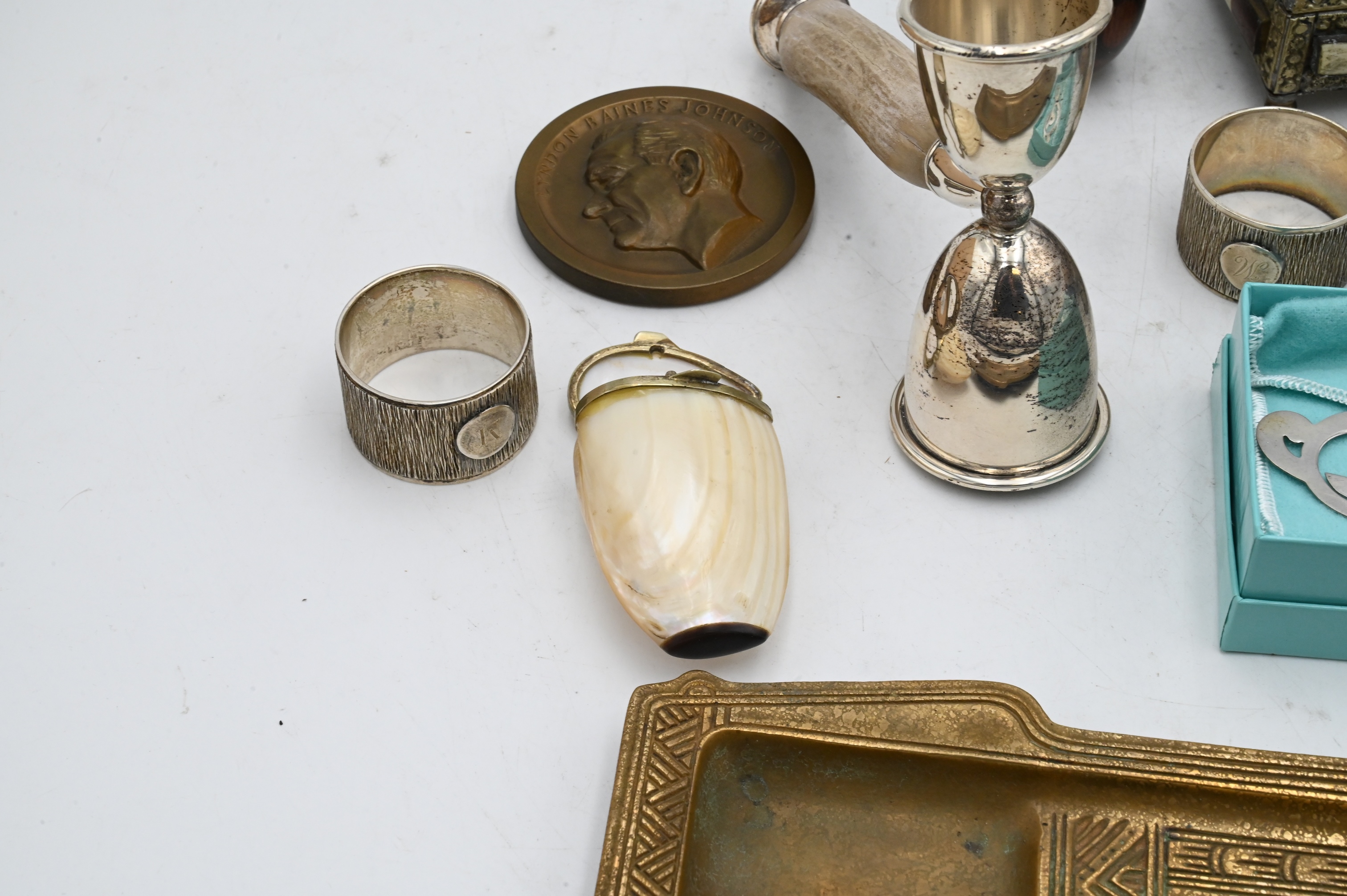 to include bronze Tiffany desk pen holder, Tiffany Logo Loup bookmark, paperclip marked Tiffany and Company 925 in original box, Tiffany treble clef sterling silver paper clip in fitted box and bag, shell box, horn box, sterling horn drink mixer, silver bottle stopper with bird, pair of silver napkin rings, salt and pepper shaker